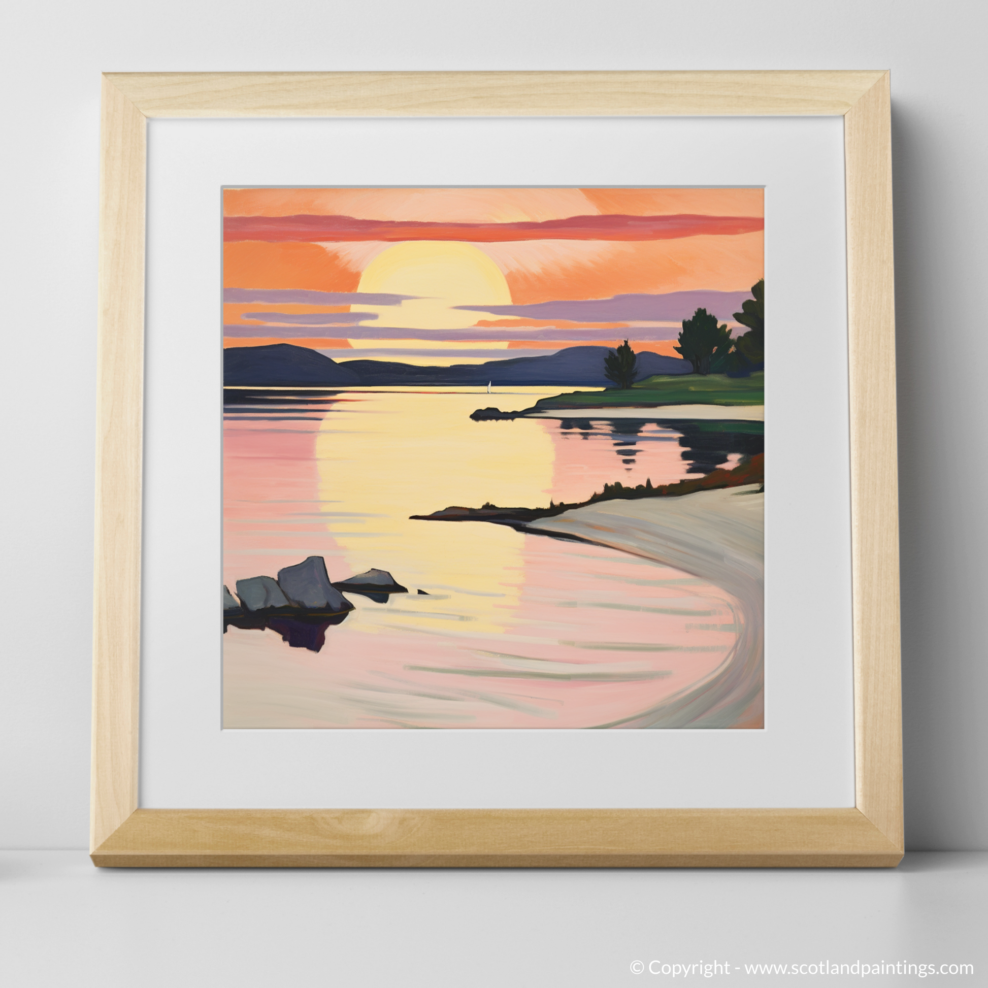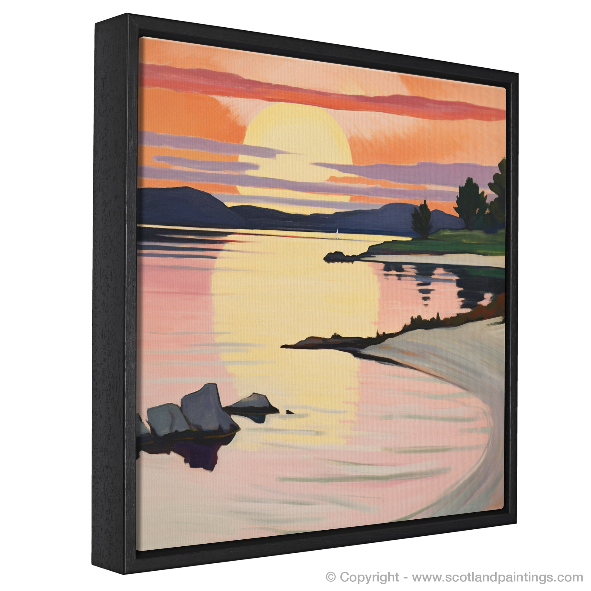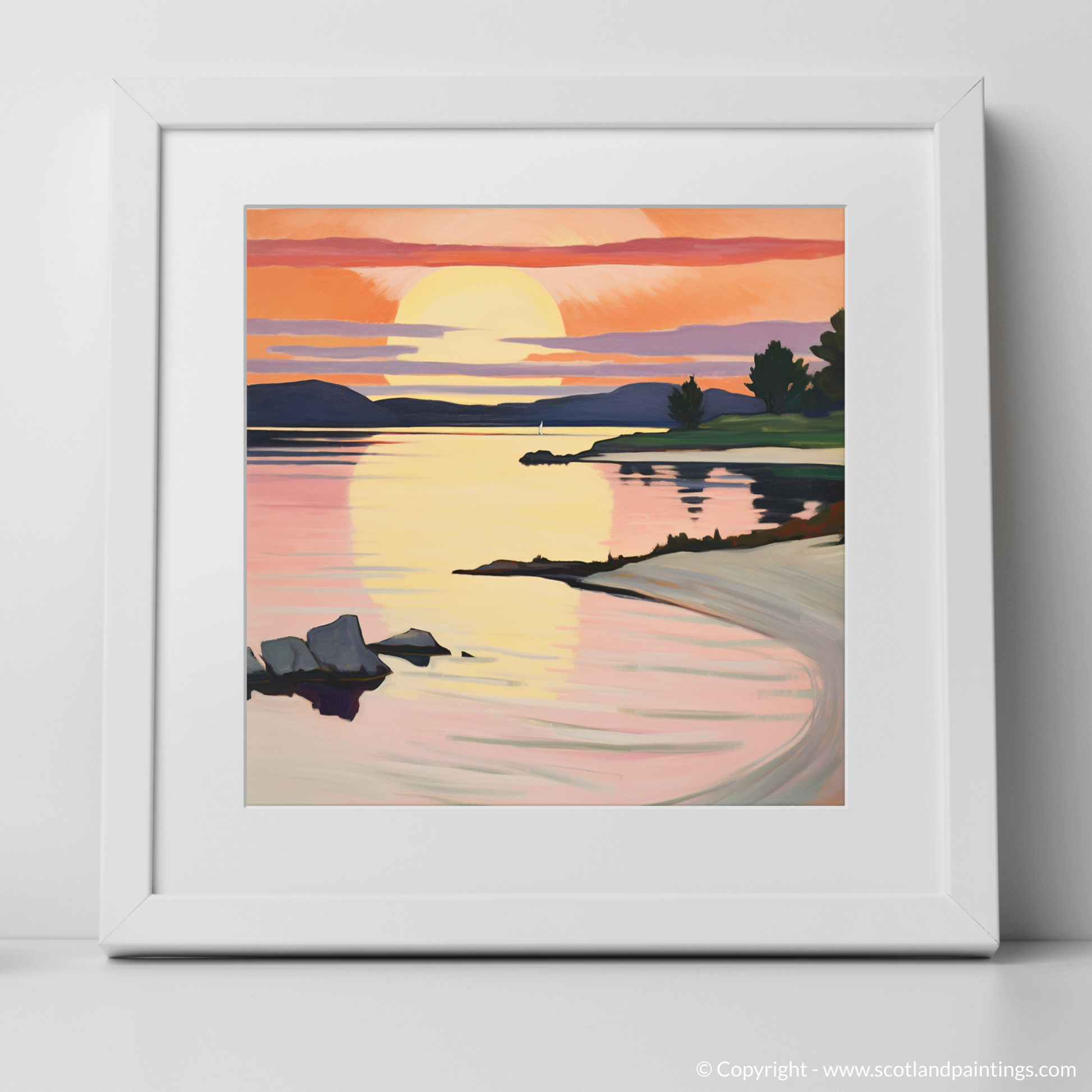 Bathed in the warm glow of a sunset, this evocative print captures the intoxicating beauty of Ardanaiseig Bay. As if painted with a palette of fire, the sky dances with vibrant hues of orange, pink, and mauve, reminiscent of the bold, untamed brushstrokes favoured by Fauvist artists. The golden orb of the sun kisses the horizon, its reflection rippling through the tranquil waters, creating a path of shimmering light that invites the viewer into the scene.