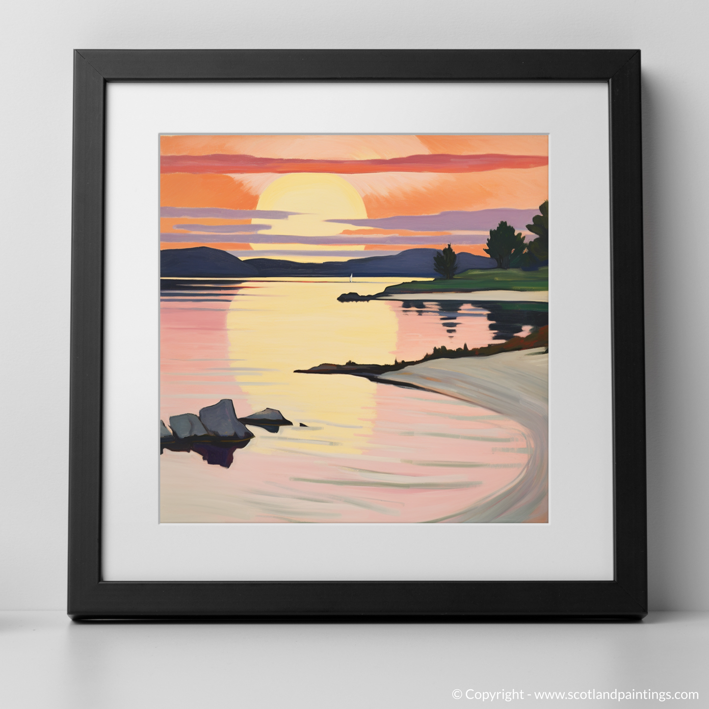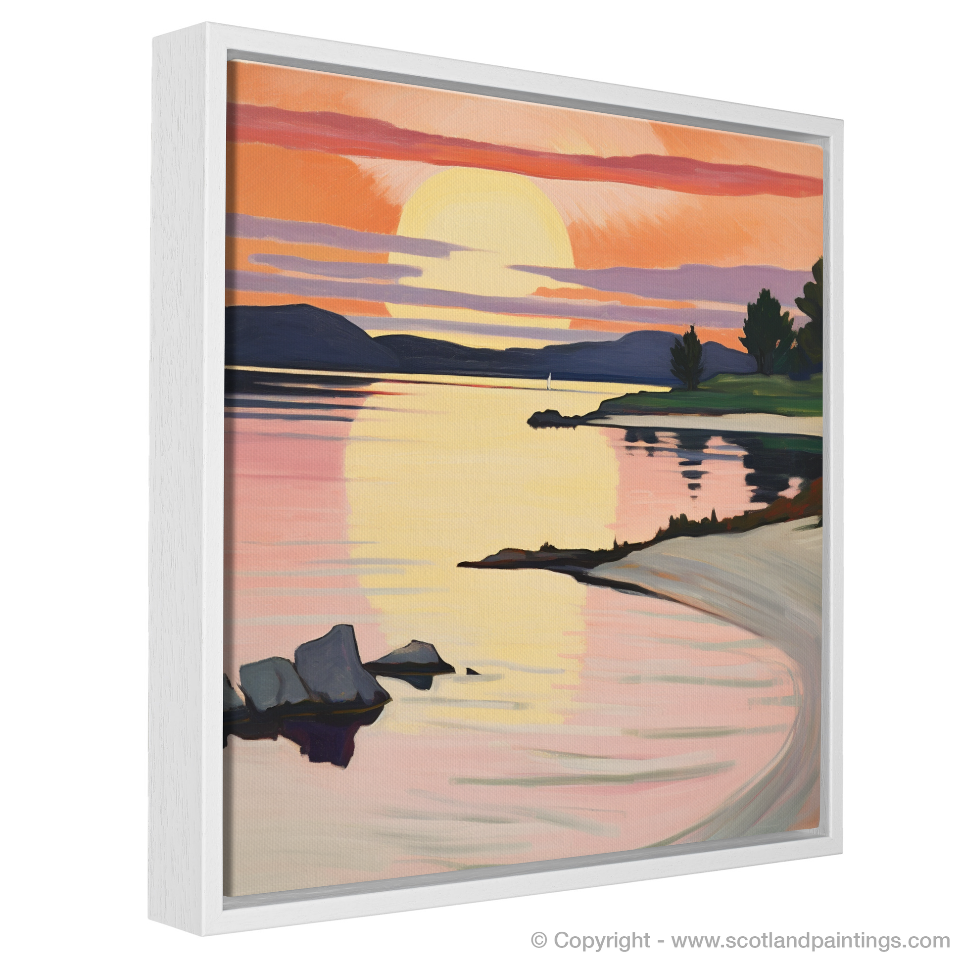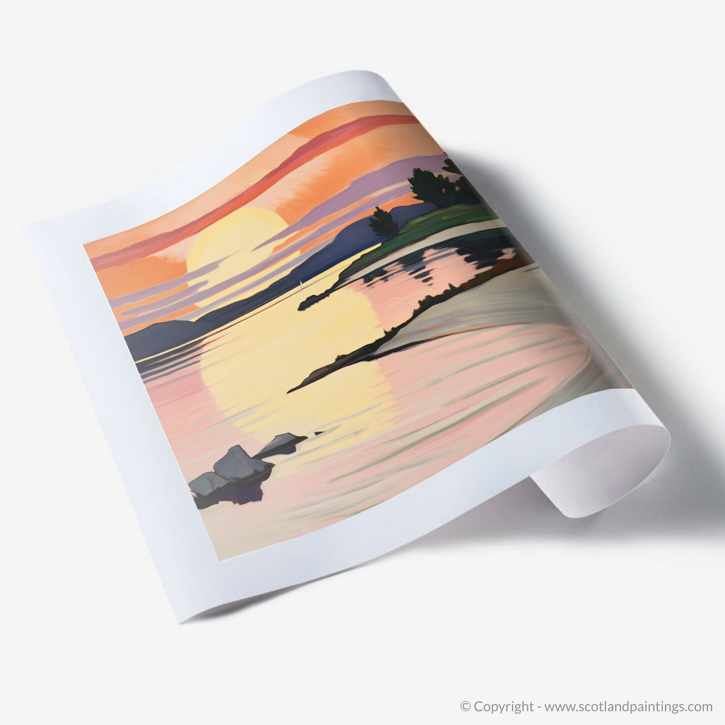 Bathed in the warm glow of a sunset, this evocative print captures the intoxicating beauty of Ardanaiseig Bay. As if painted with a palette of fire, the sky dances with vibrant hues of orange, pink, and mauve, reminiscent of the bold, untamed brushstrokes favoured by Fauvist artists. The golden orb of the sun kisses the horizon, its reflection rippling through the tranquil waters, creating a path of shimmering light that invites the viewer into the scene.