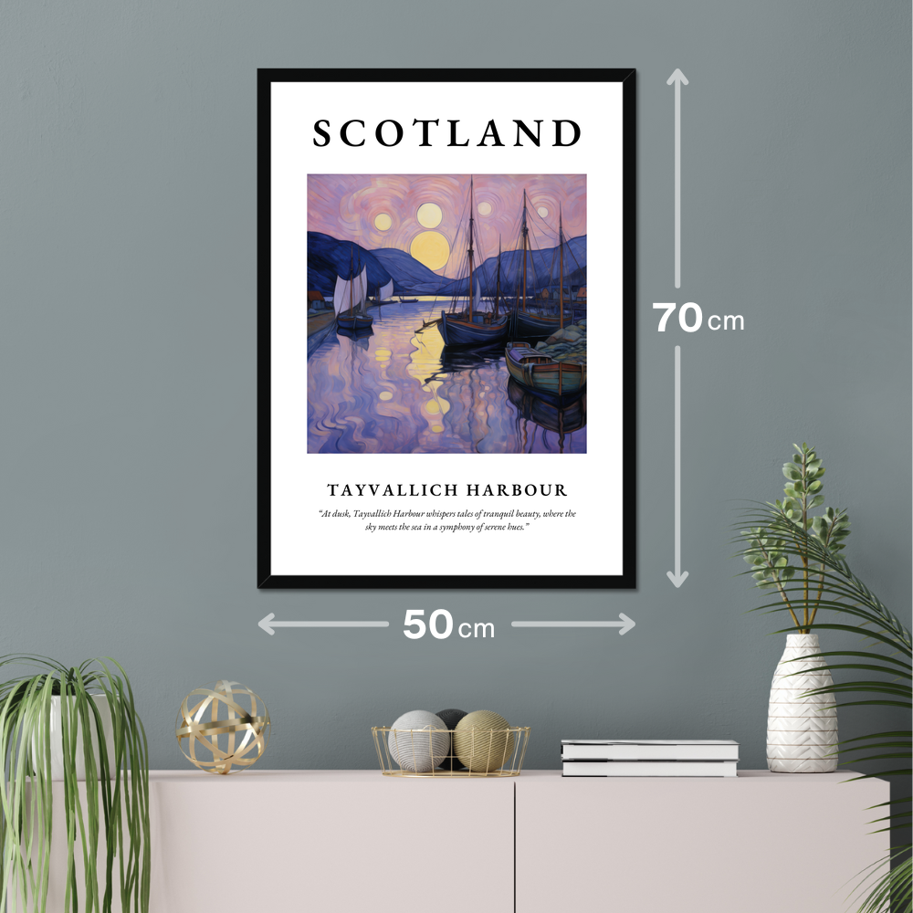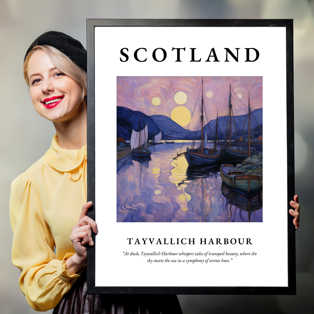 Beneath this visual masterpiece lies an evocative quote: “At dusk, Tayvallich Harbour whispers tales of tranquil beauty, where the sky meets the sea in a symphony of serene hues.” It's a sentiment that beautifully encapsulates the essence of this scenic Scottish haven.