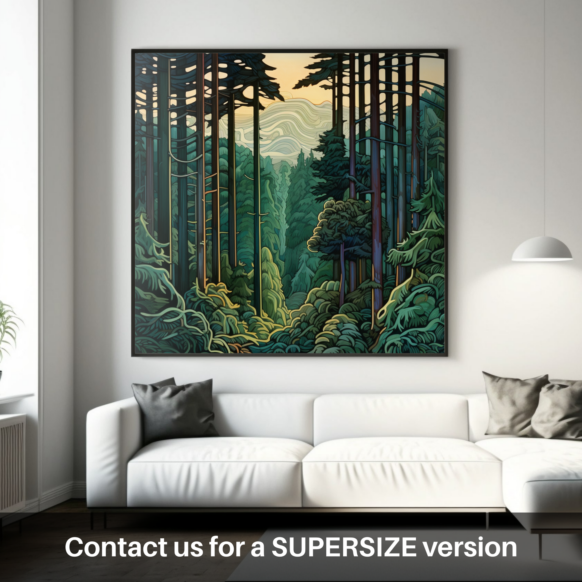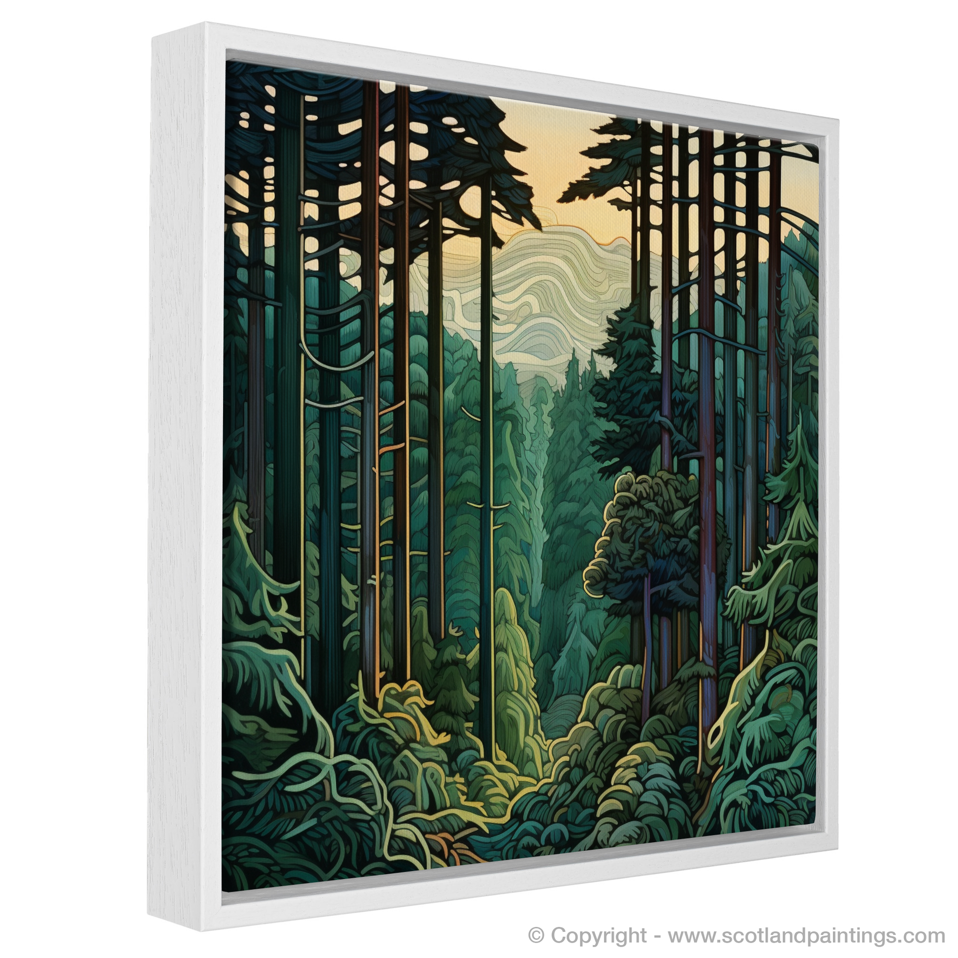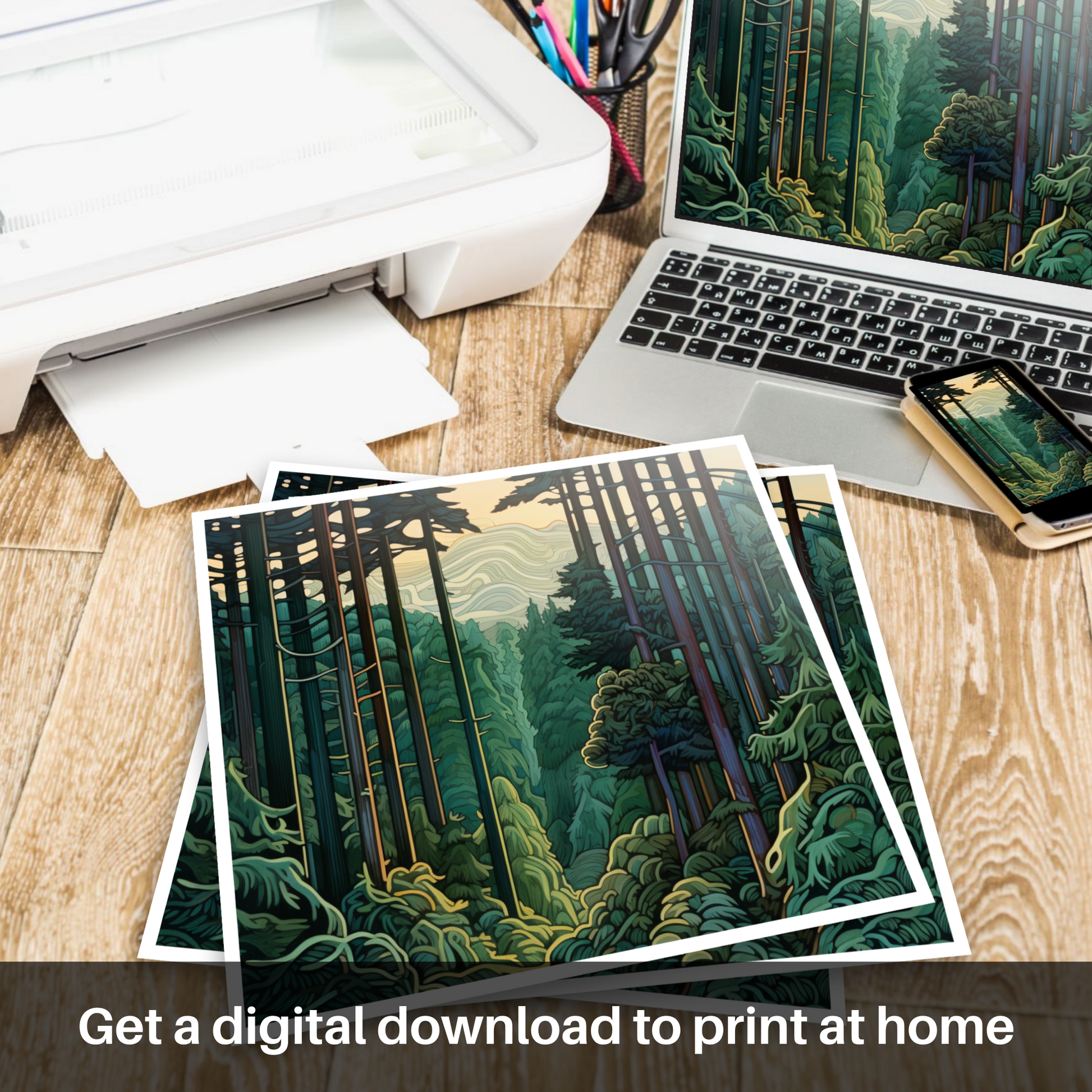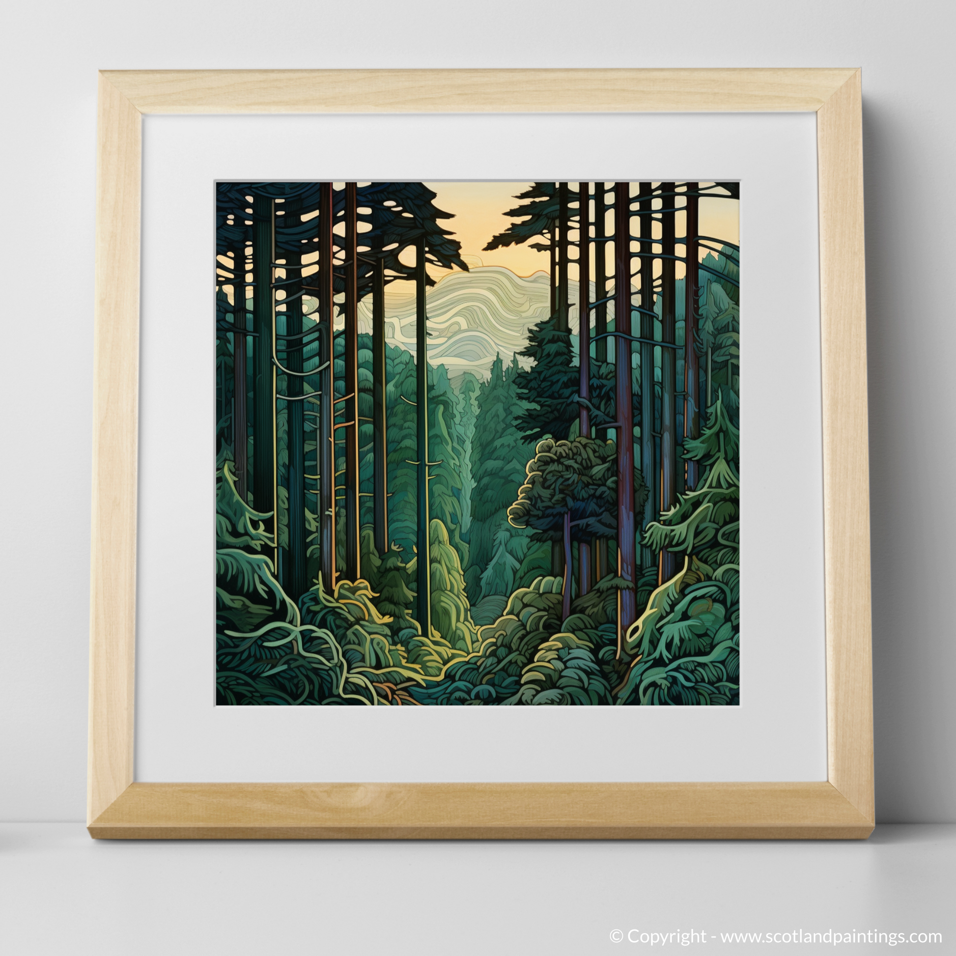 Immerse yourself in the enchanting beauty of the Scottish Highlands with a captivating print that channels the essence of Glenmore Forest Park through the flowing elegance of Art Nouveau. Steeped in a plethora of verdant hues, this illustration transports viewers to a serenely composed sylvan realm defined by its towering pines and luscious underbrush, punctuated with the amber glow of a setting or rising sun.
