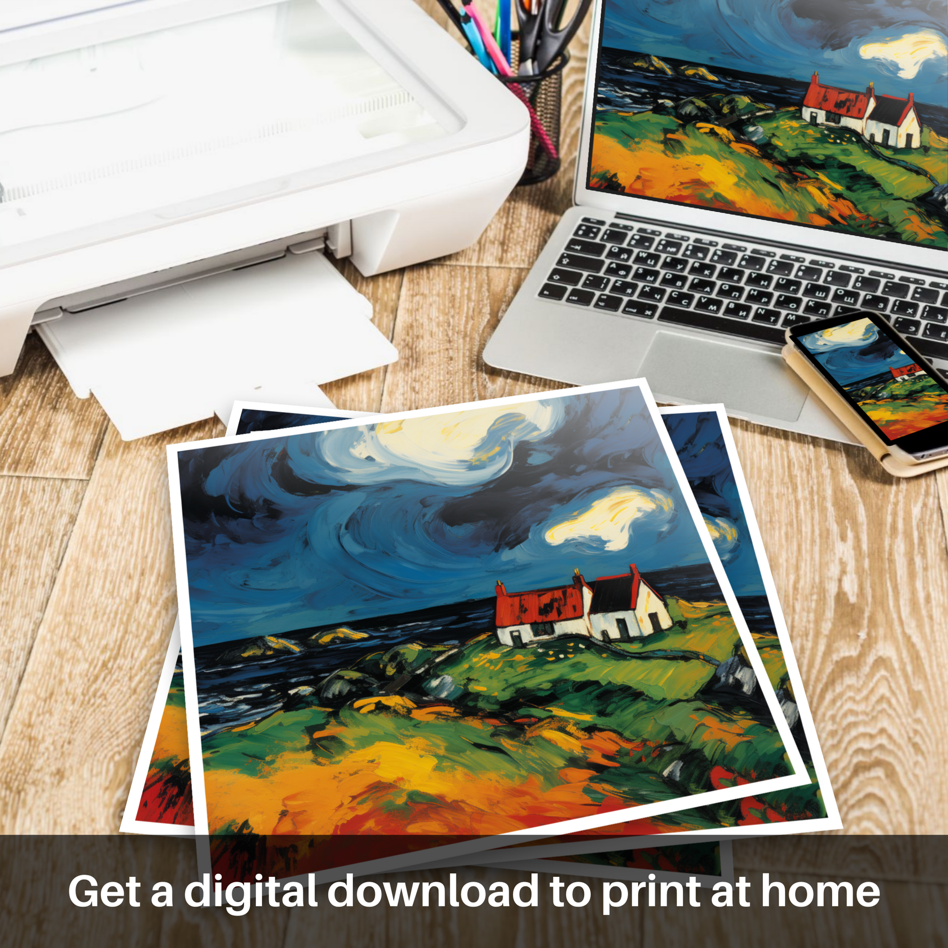 Immerse yourself in the undeniable vitality and boldness of this fauvist-inspired print, which captures the raw beauty of the Isle of Lewis in the Outer Hebrides. With its striking use of color and sweeping brushstrokes, this piece transports viewers to a windswept landscape where the elements unapologetically assert their presence.