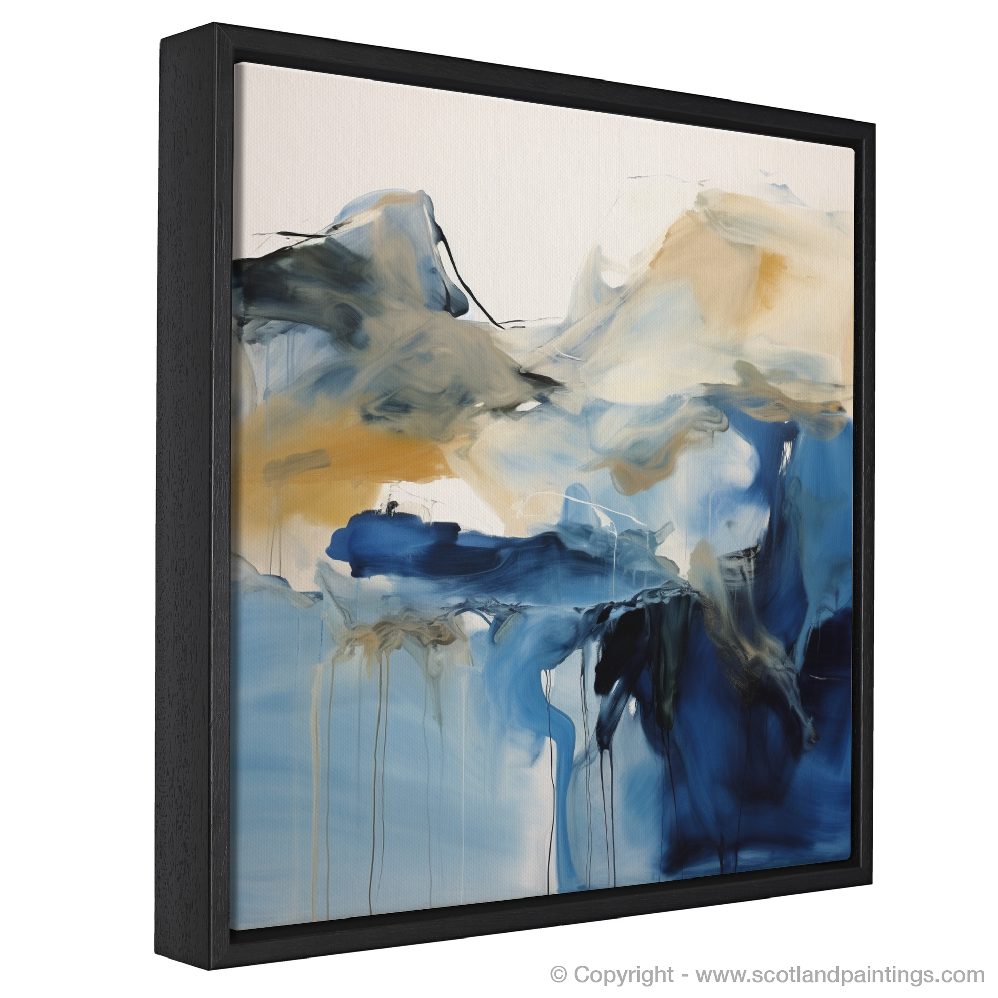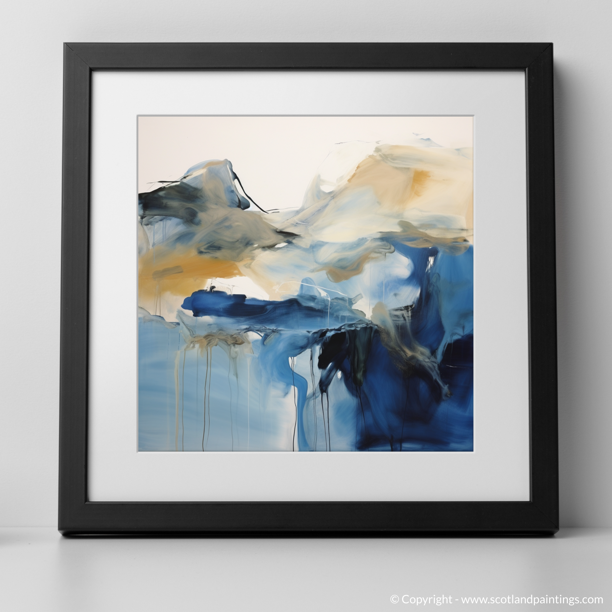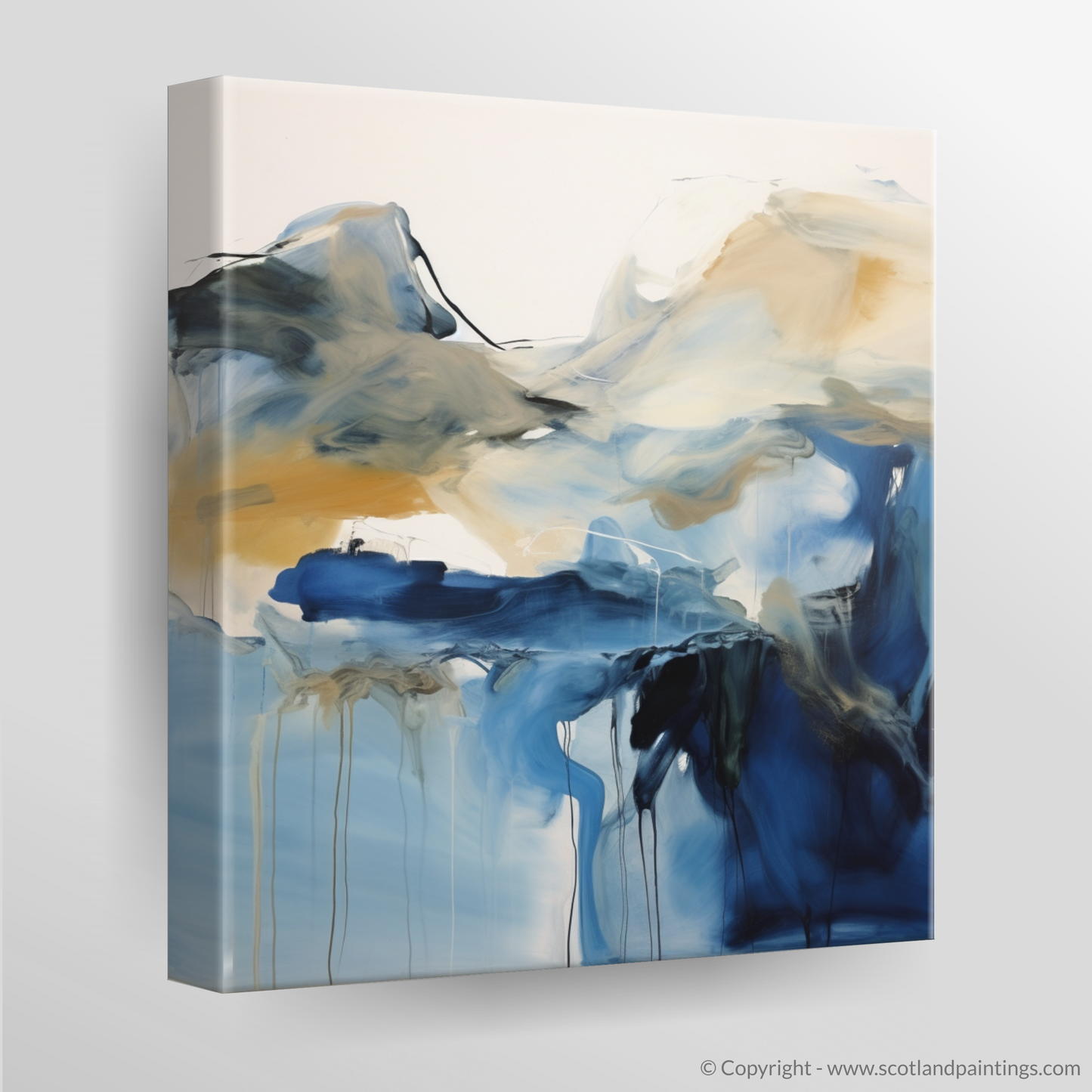 Dominating the canvas is a bold convergence of deep, inky blues which evoke the profound depths of Scottish lochs, their surfaces rippled by the brisk mountain air. These rich hues sweep across the piece, occasionally breaking into lighter shades that suggest the fleeting caress of mist over water or the ephemeral light of dawn cresting over rugged horizons.