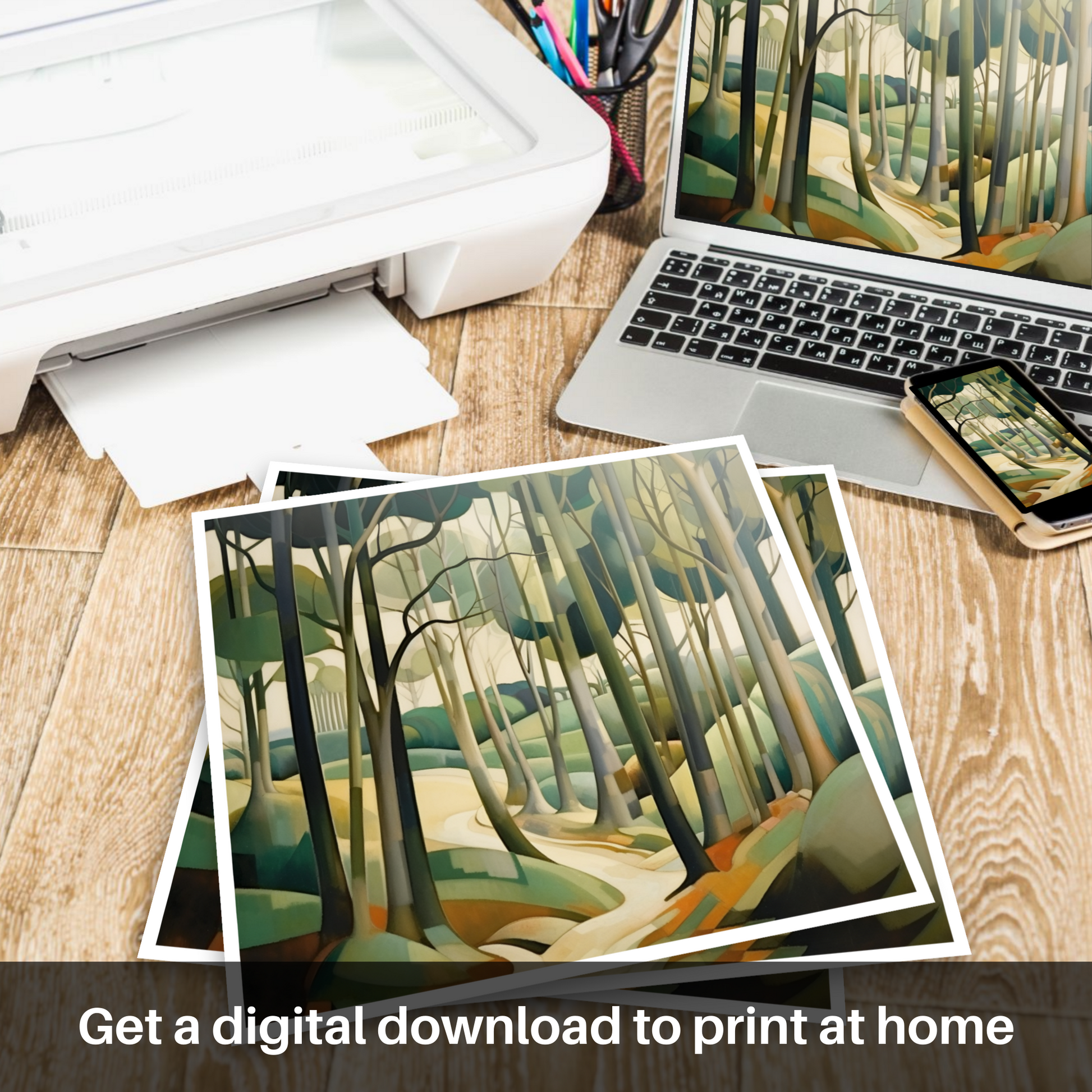 The print reveals a labyrinth of geometrically styled trees, their trunks and branches fracturing the composition into a tapestry of earthy tones and serene greens. Each angular segment captures the elusive play of light filtering through the dense foliage, with subtle hues of ochre, mustard, and olive imparting a sense of the forest's organic pulse.