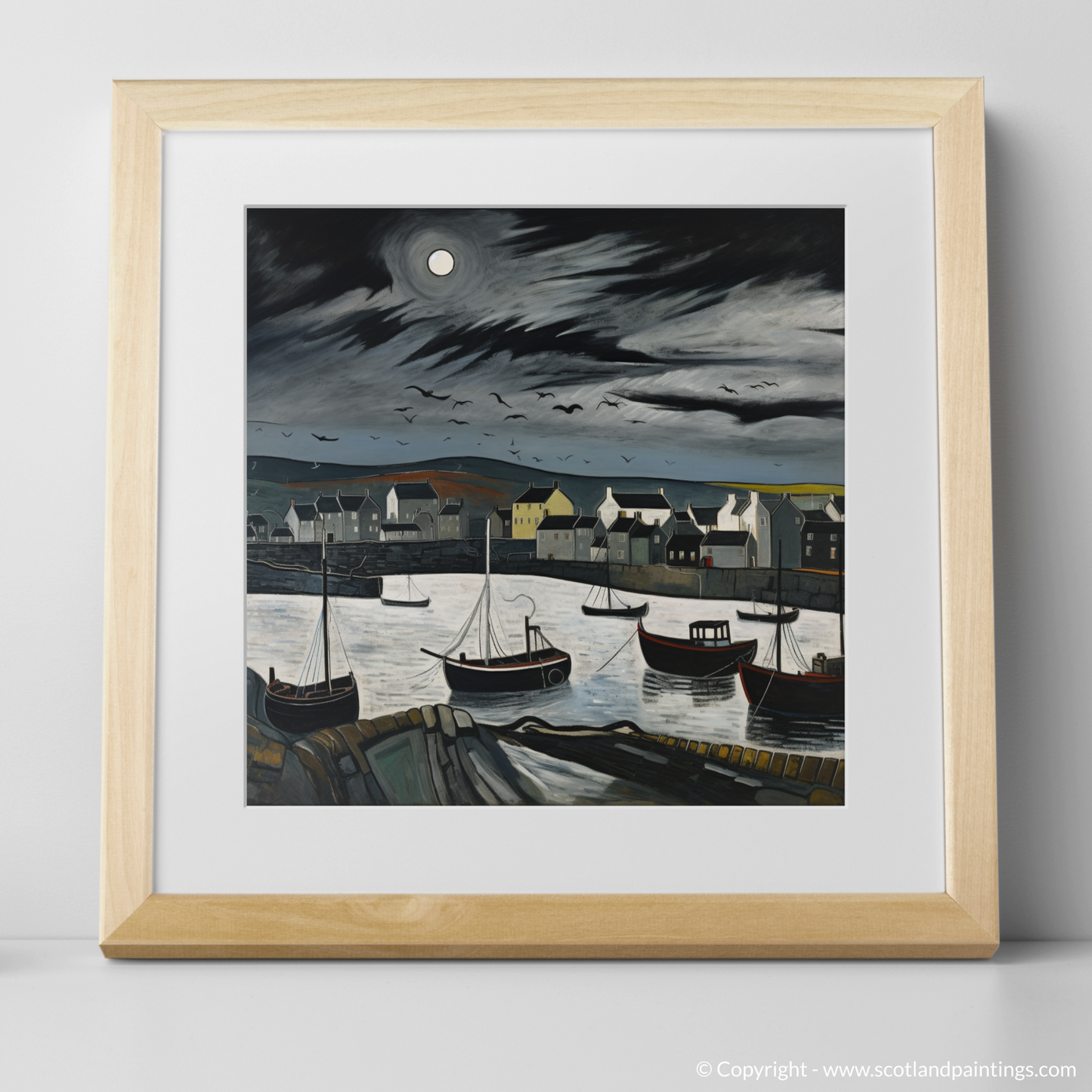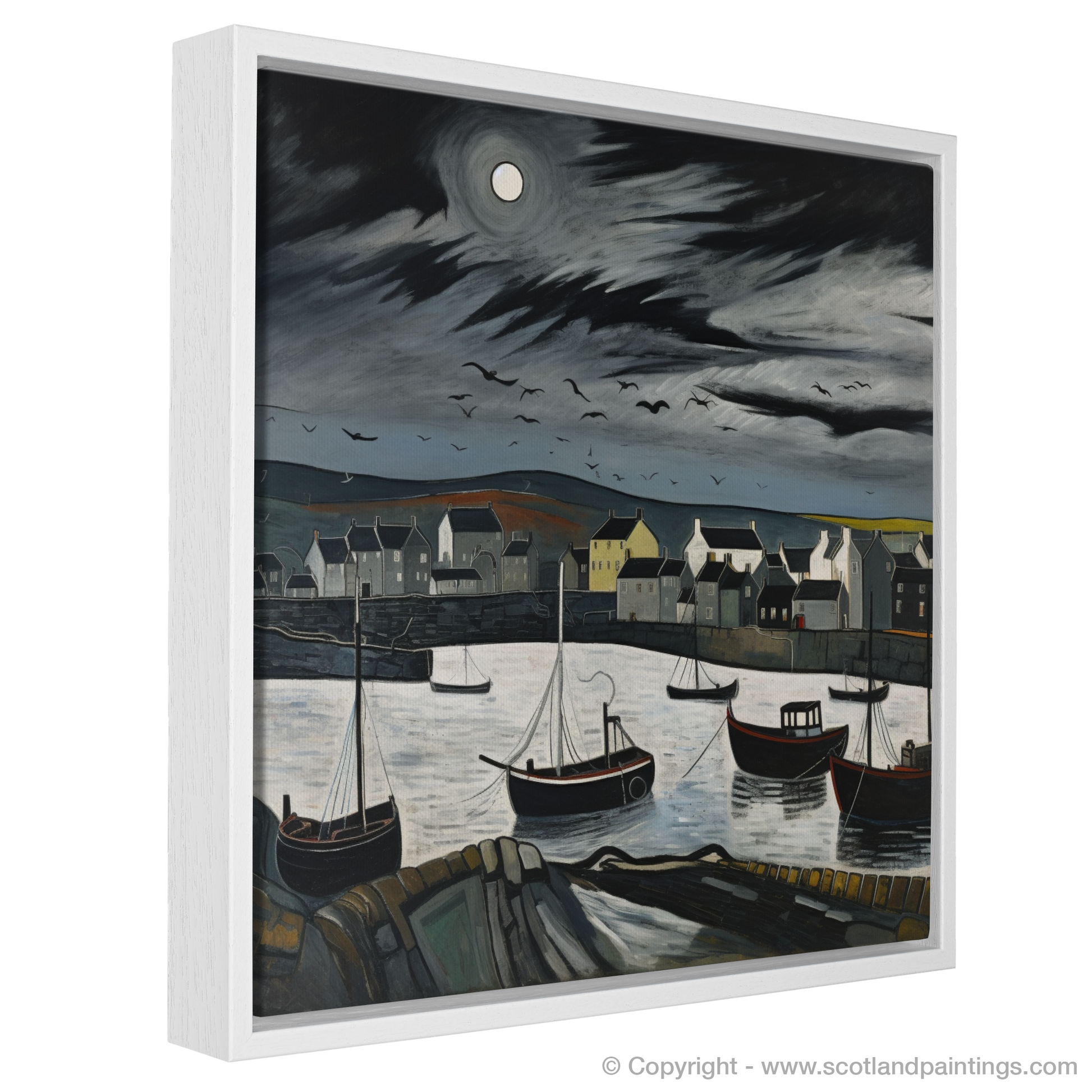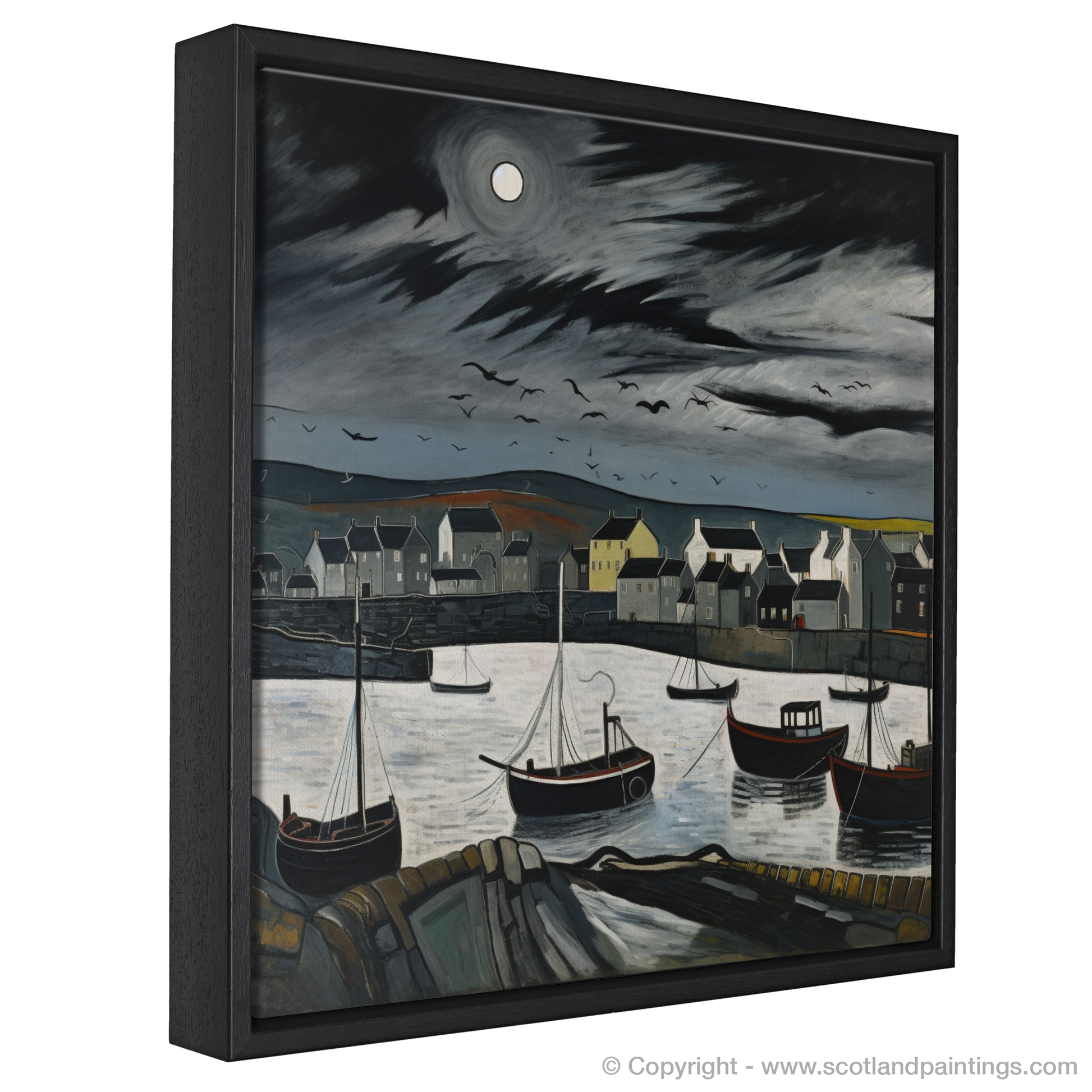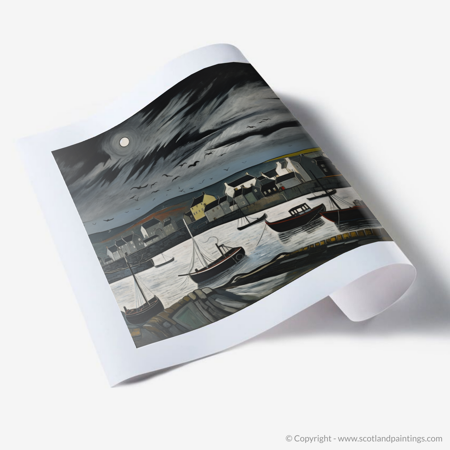 Imagine the invigorating gusts of a Scottish storm as it graces the canvas, and invigorate your space with this spellbinding print, a depiction of Lybster Harbour enshrouded by tumultuous skies. The evocative scene showcases a palette of rich, contrasting tones, where the stark whites of the moon and sailboats bobbing on the water's surface stand in defiant contrast to the steely grays and profound blacks of the brooding storm clouds.