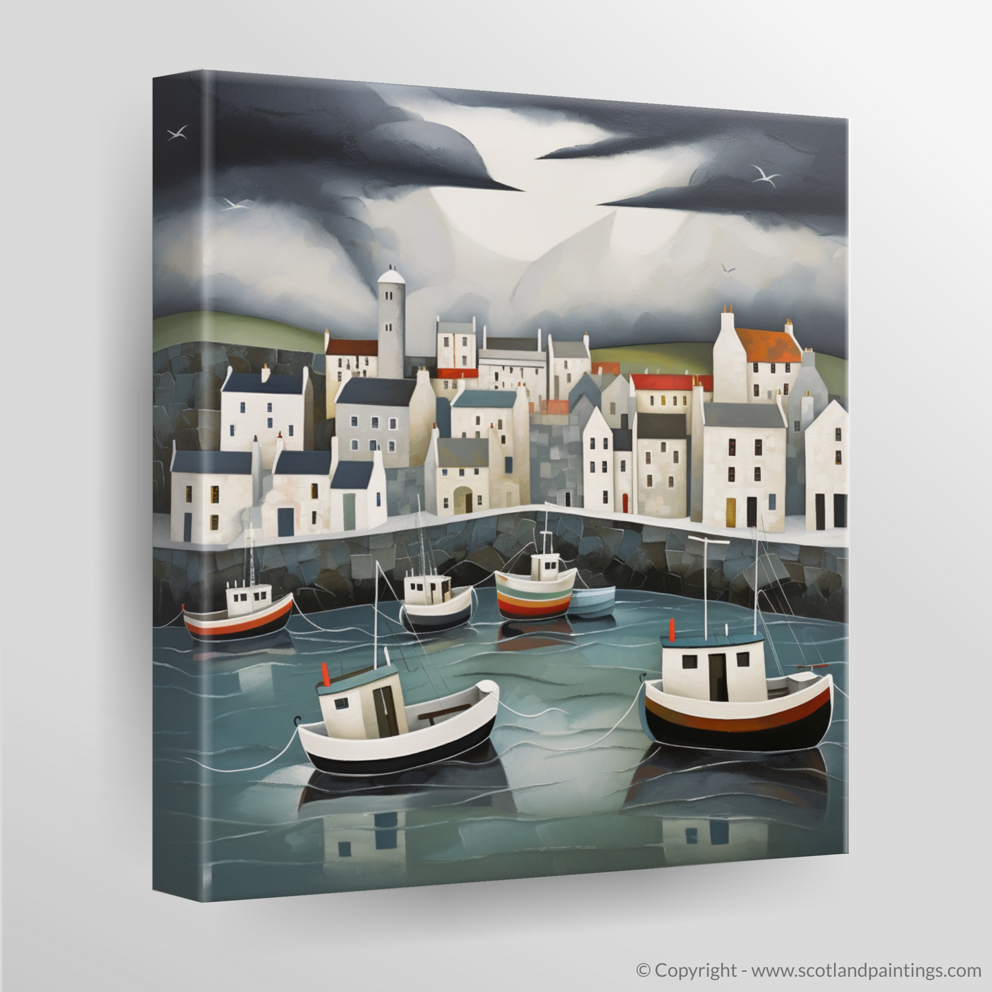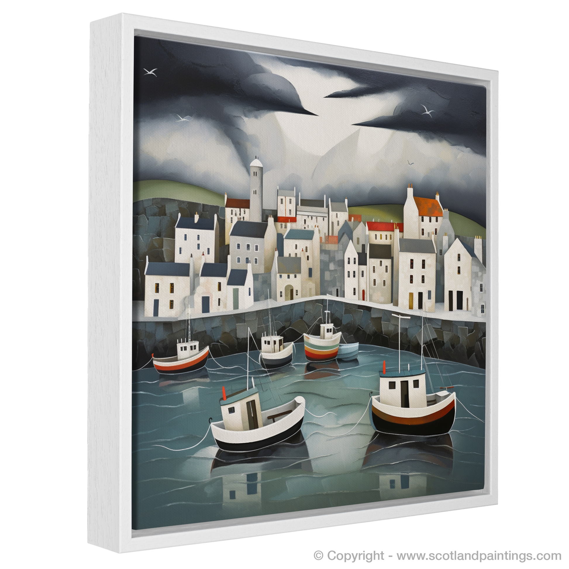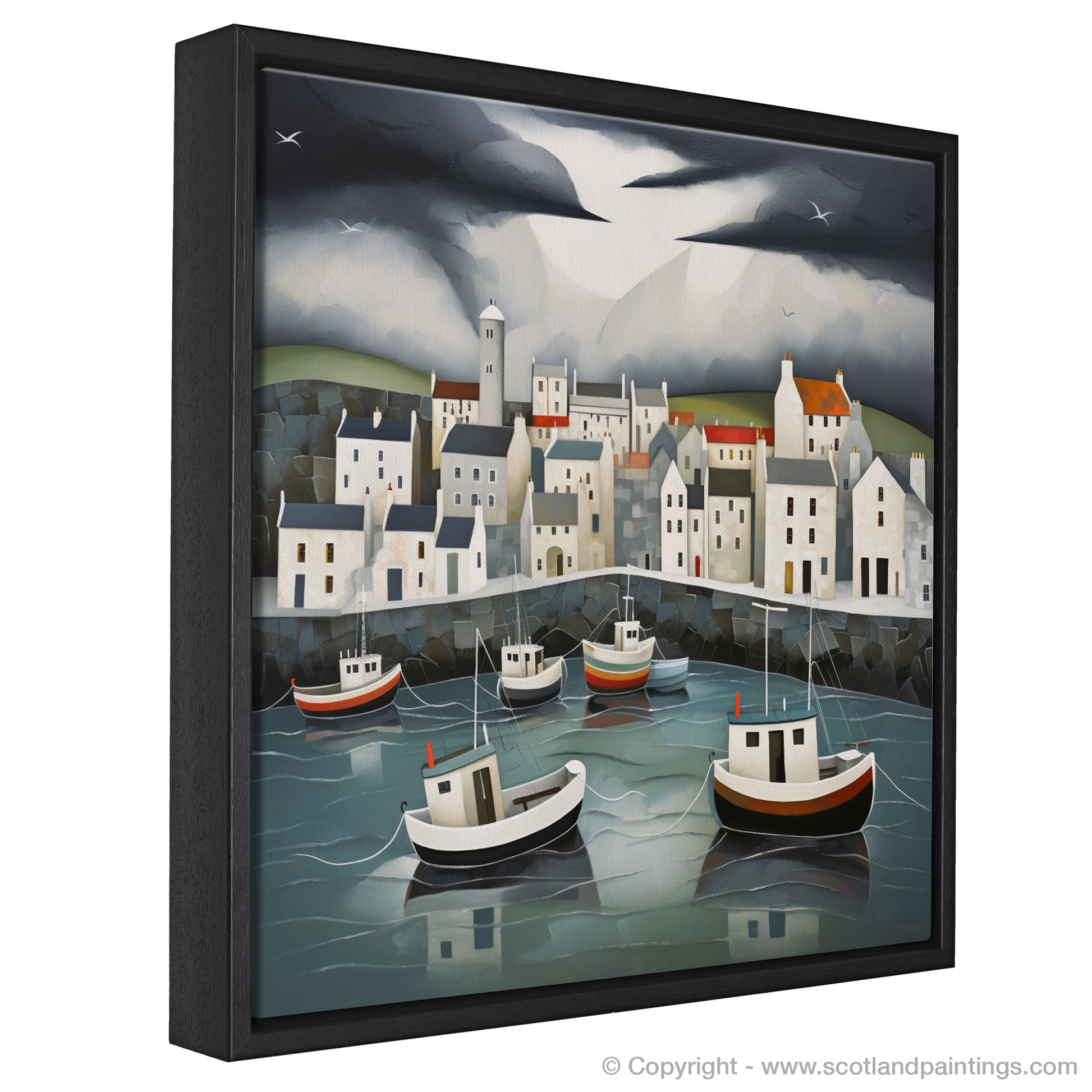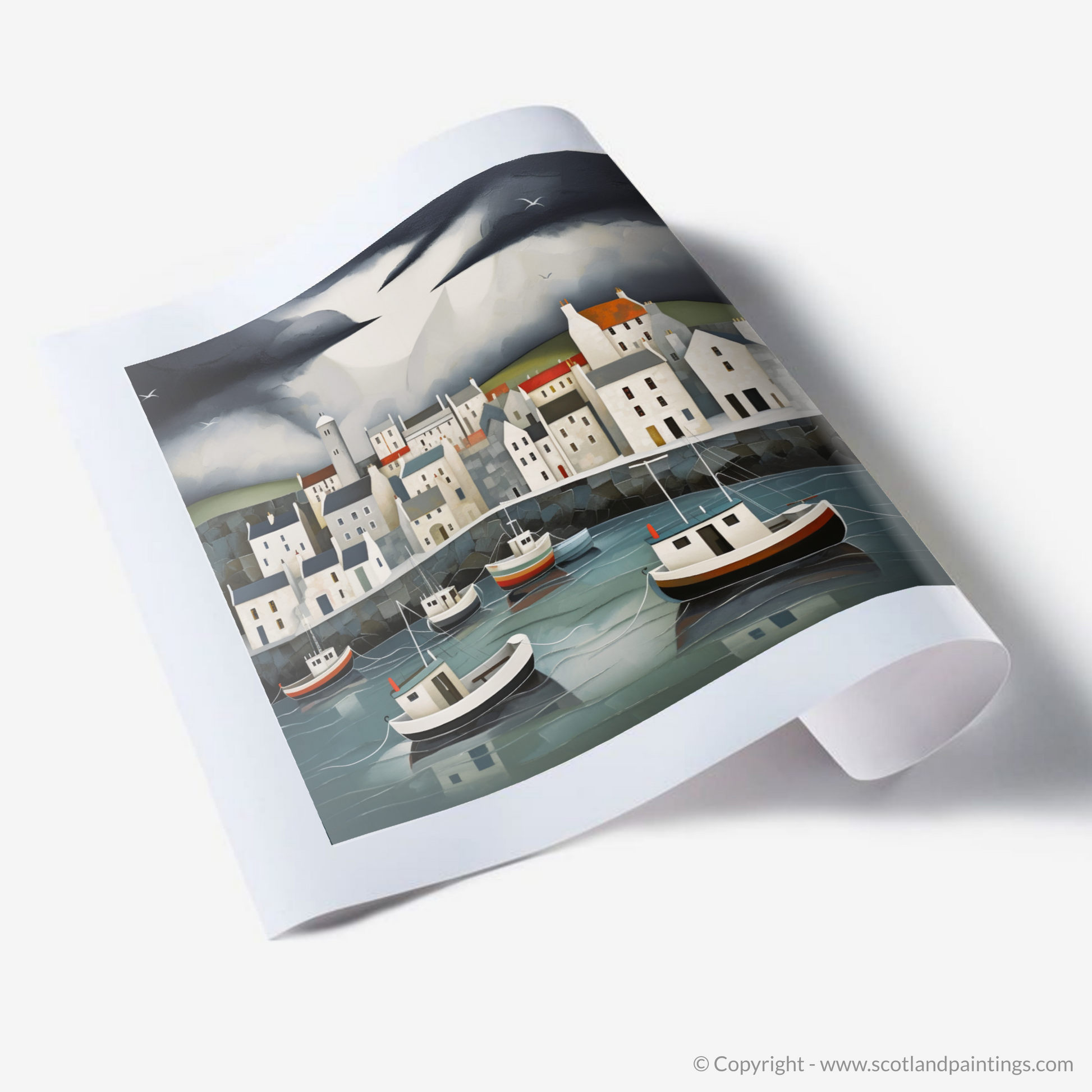 Capturing the raw essence of Scotland's coastal beauty, this charming piece invites you into a quaint harbour scene set against a dramatically brooding sky. Whitehills Harbour comes to life through a whimsical portrayal typical of Naive Art, characterized by its childlike simplicity and candidness.