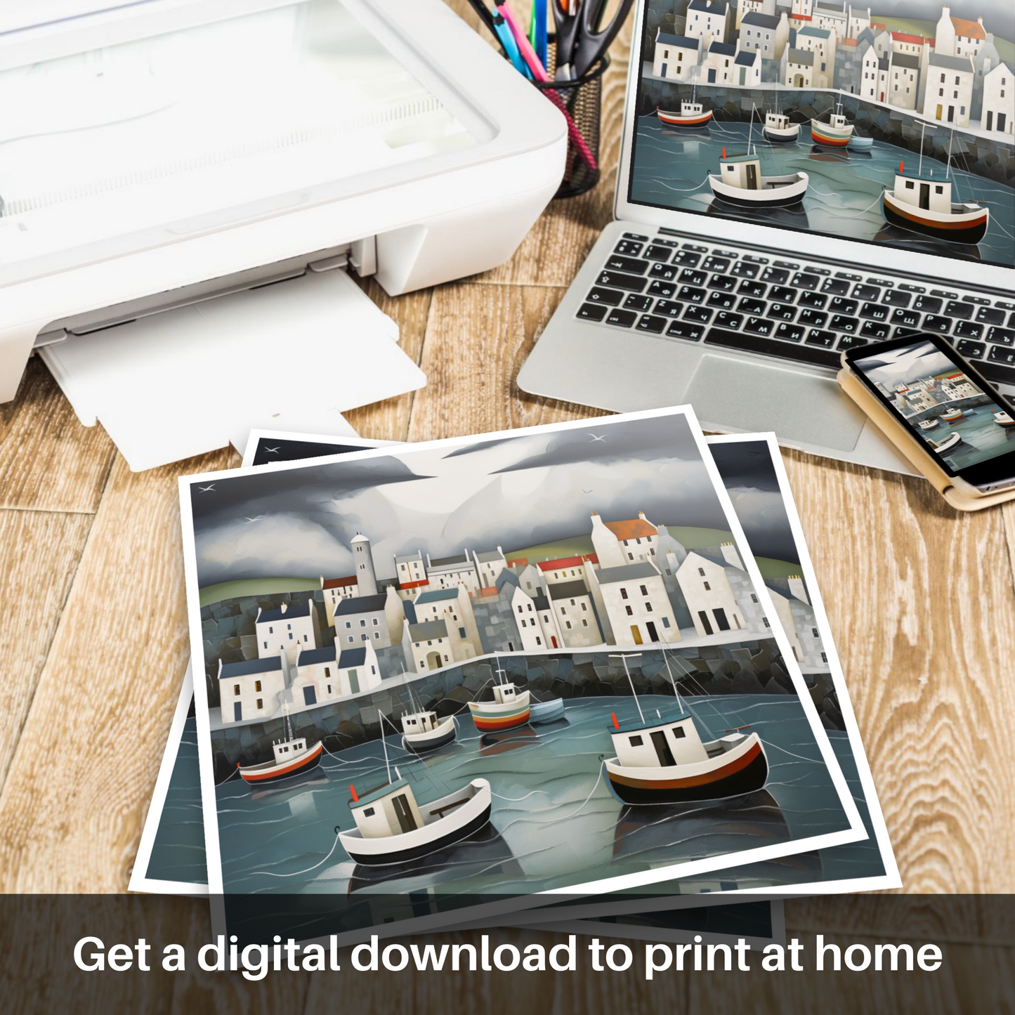 This print promises to bring a touch of Scotland's rugged coast into any space, offering a blend of soothing tranquillity and rough, natural drama. It is an ideal piece for anyone who cherishes the unique charm of Scottish Harbours and the artistry found in simplicity and naivety.