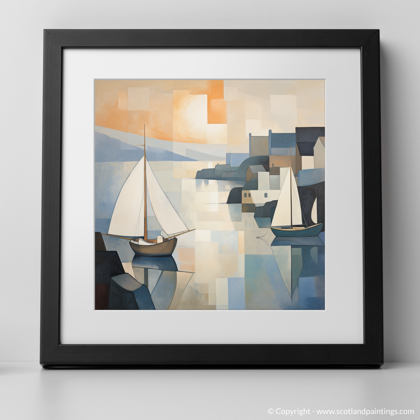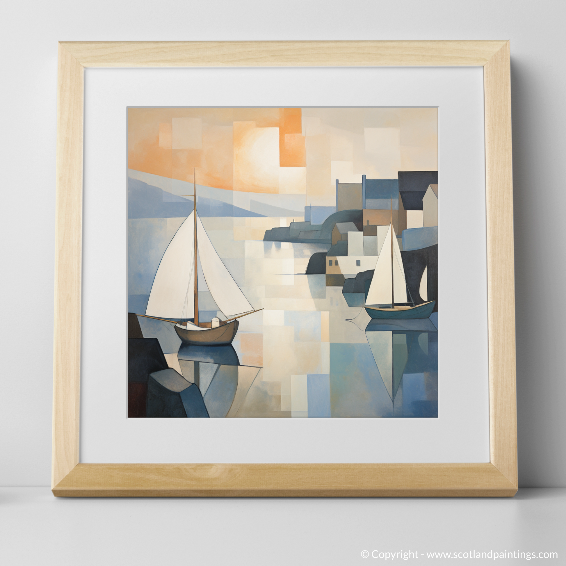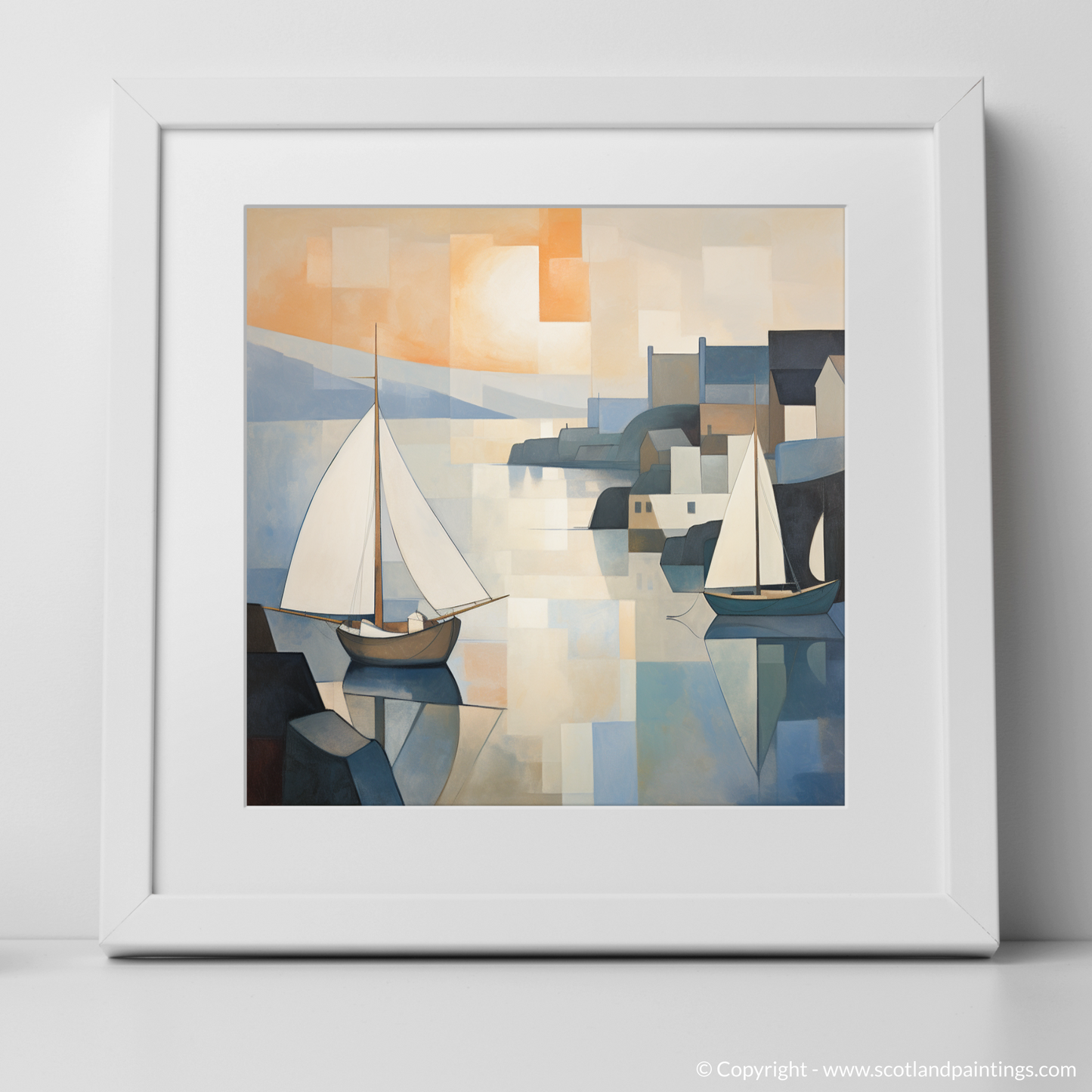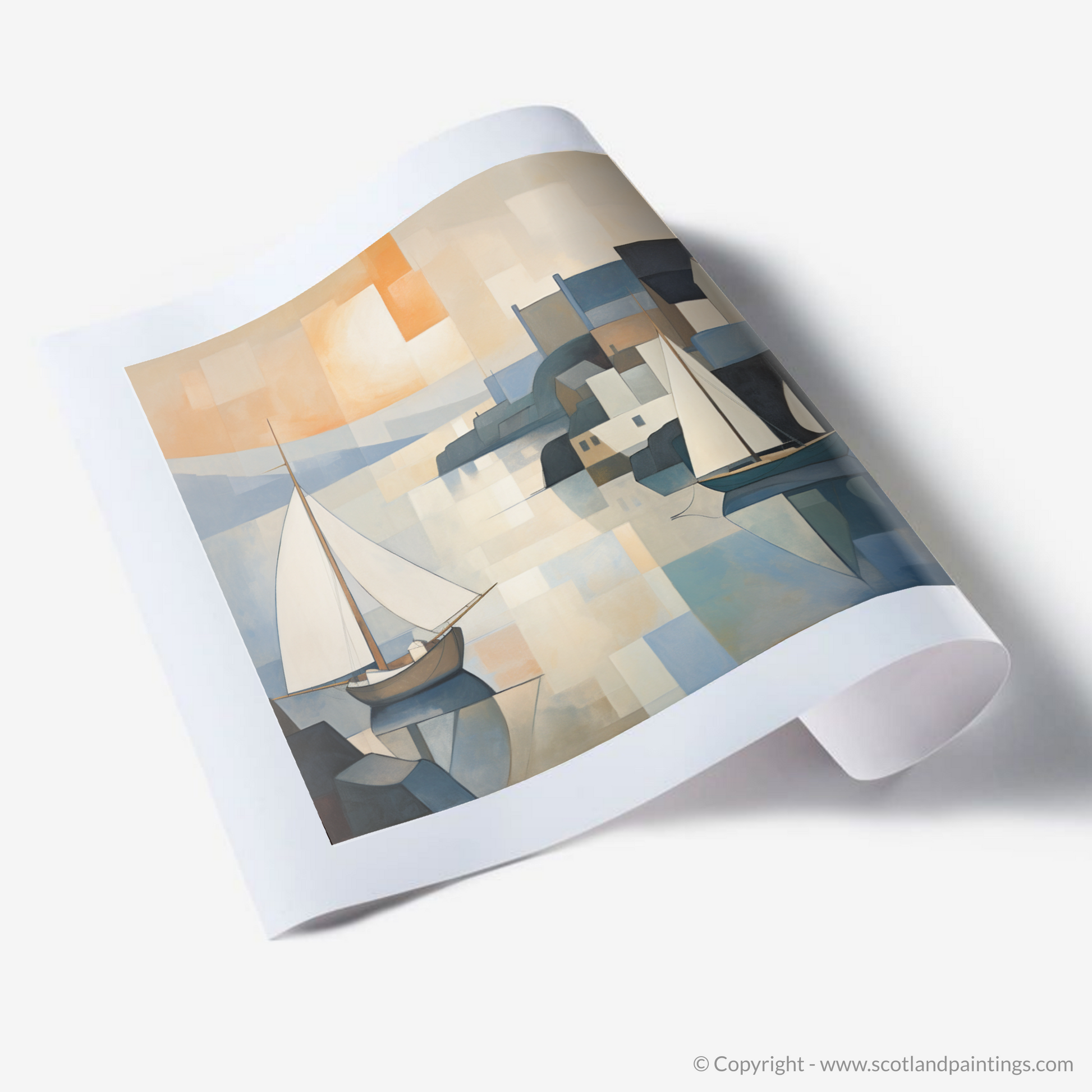 Immerse yourself in the robust tranquillity of a Scottish cove as dusk approaches, interpreted through the unique lens of Cubism. This distinct print captures the essence of Catterline Bay, where angular artistry reimagines seascapes and shorelines. Creamy sands and soft blues are reconstructed into a succession of fragmented surfaces and planes, giving the viewer a simultaneous sense of depth and flat abstraction. The heart of the composition features two elegant sailboats, their sails billowing gracefully, rendered in crisp whites and defined by sharp lines that contrast with the subtle palette of the sky and water.