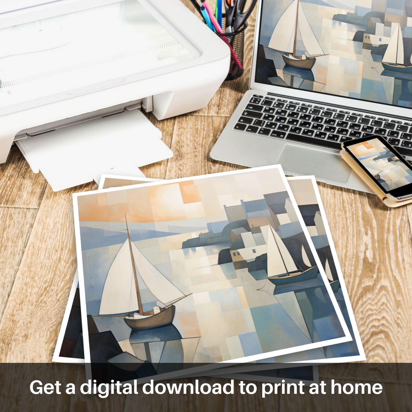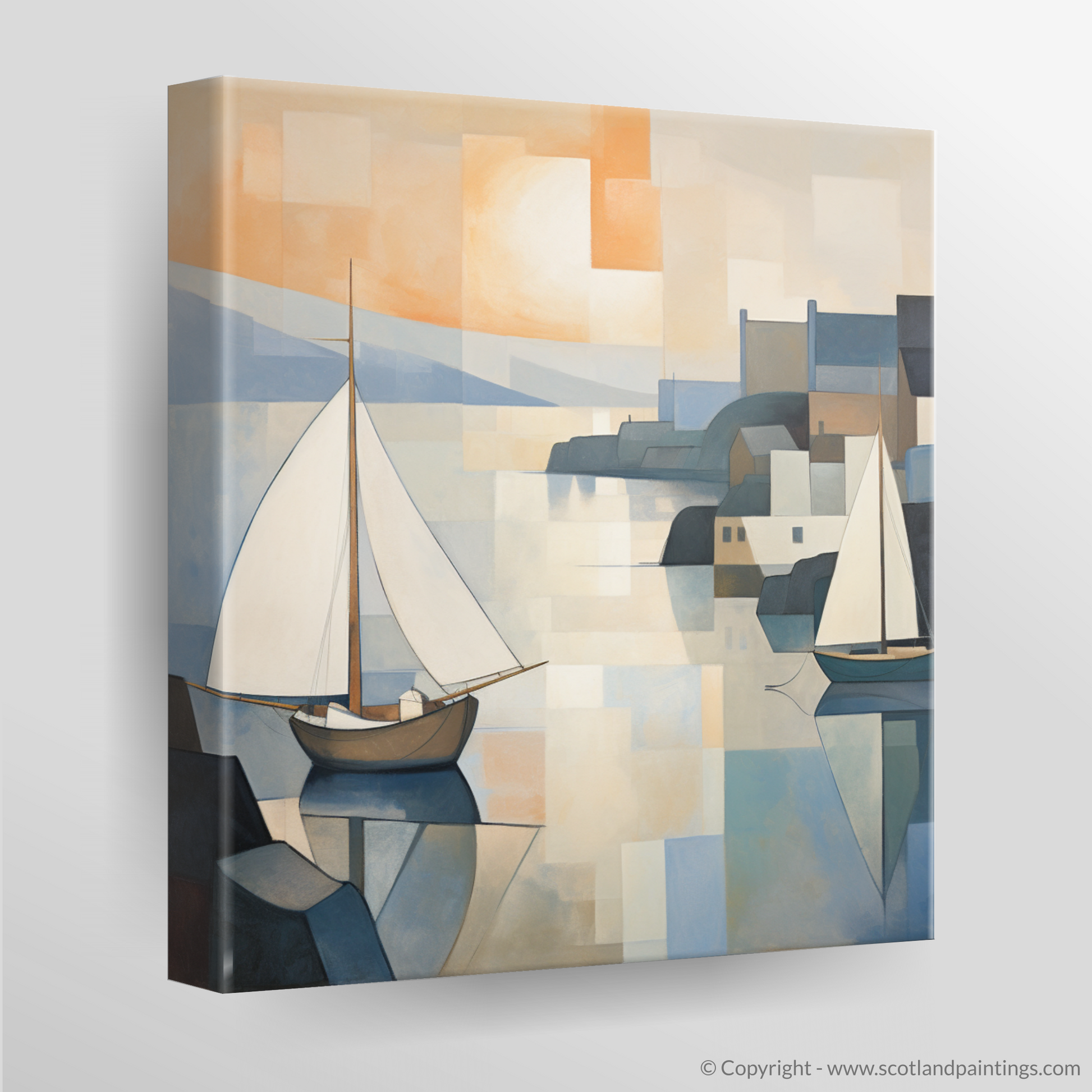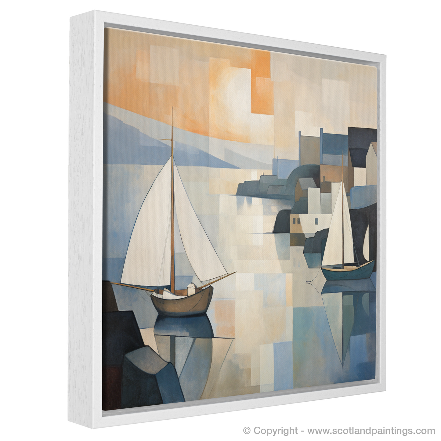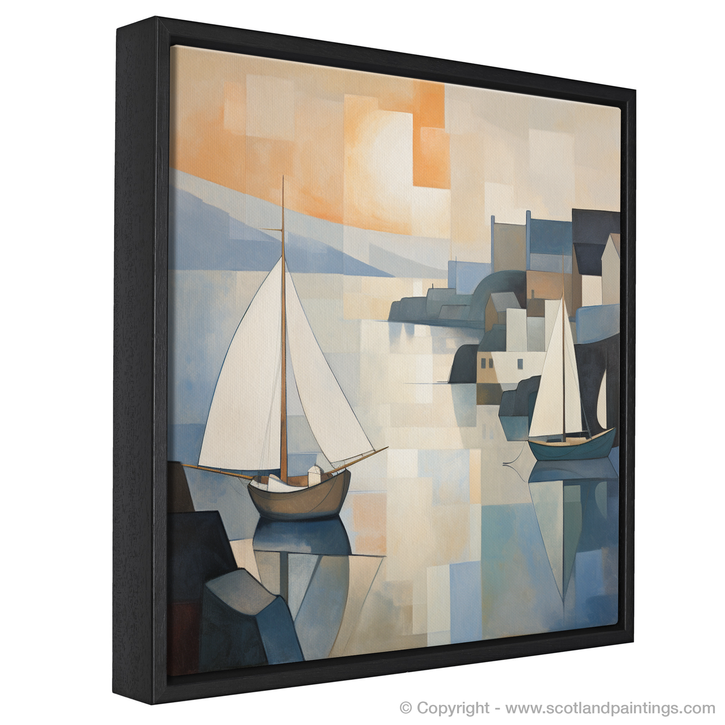 Immerse yourself in the robust tranquillity of a Scottish cove as dusk approaches, interpreted through the unique lens of Cubism. This distinct print captures the essence of Catterline Bay, where angular artistry reimagines seascapes and shorelines. Creamy sands and soft blues are reconstructed into a succession of fragmented surfaces and planes, giving the viewer a simultaneous sense of depth and flat abstraction. The heart of the composition features two elegant sailboats, their sails billowing gracefully, rendered in crisp whites and defined by sharp lines that contrast with the subtle palette of the sky and water.