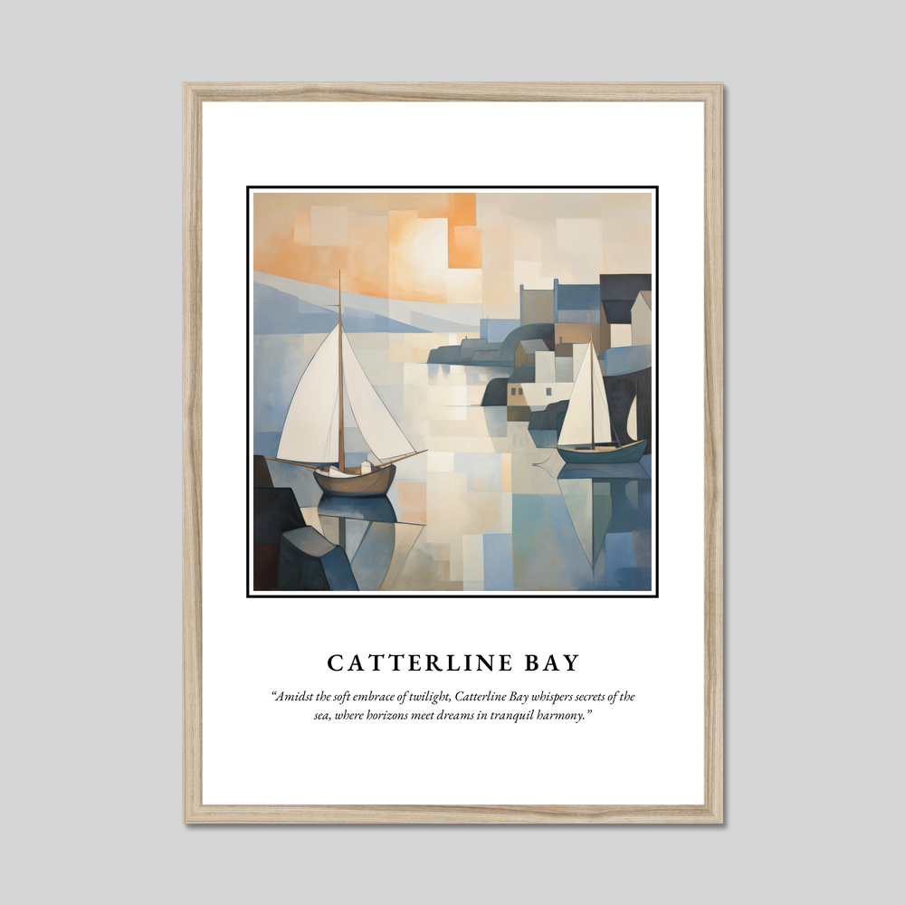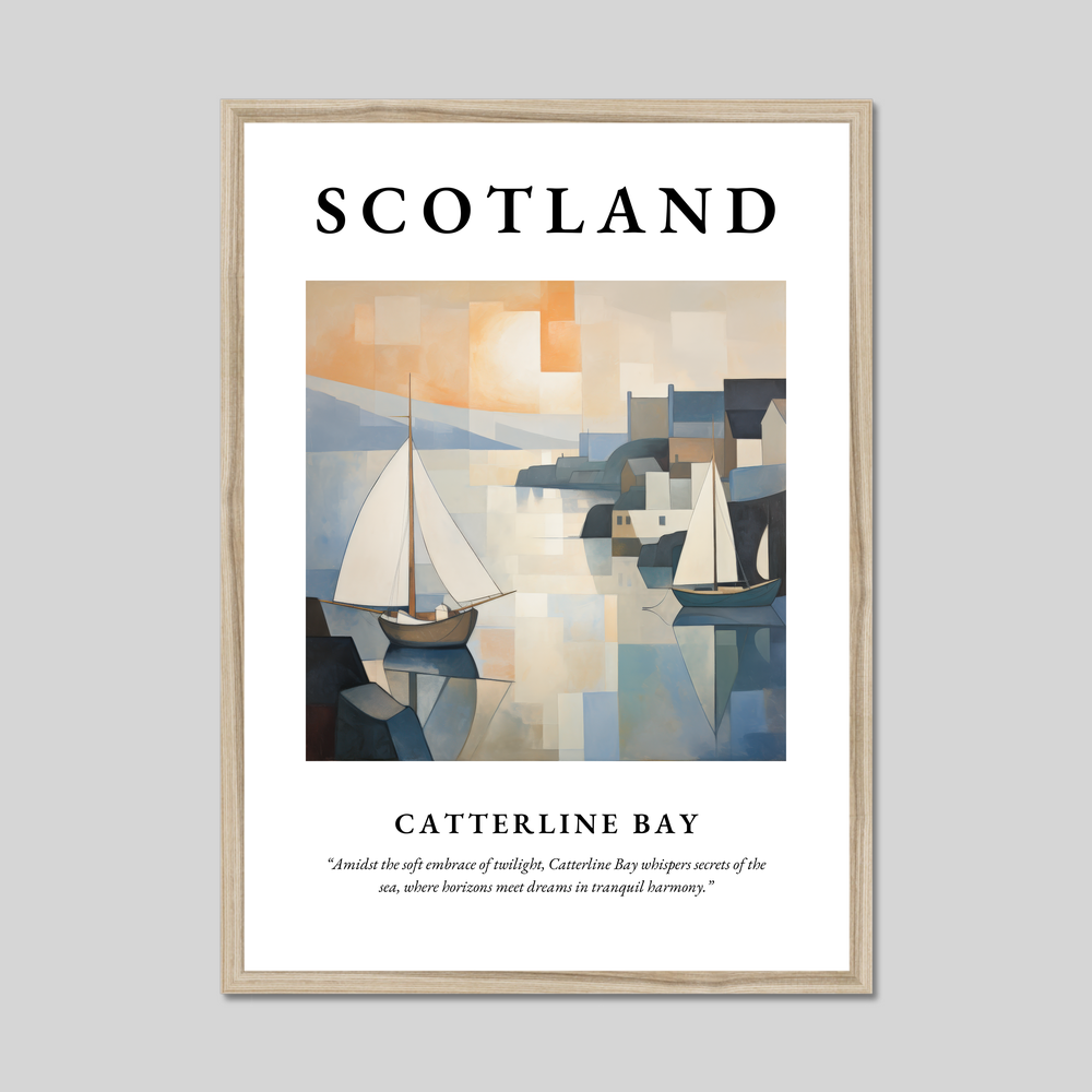 This stunning poster is available in three chic finishes: black, white, or a natural wood-effect frame, allowing you to tailor it perfectly to your decor style. Beneath the abstract, geometric forms depicting Catterline Bay, a quote whispers of twilight and dreams, capturing the essence and tranquility of the scene in a few eloquent words: “Amidst the soft embrace of twilight, Catterline Bay whispers secrets of the sea, where horizons meet dreams in tranquil harmony.”