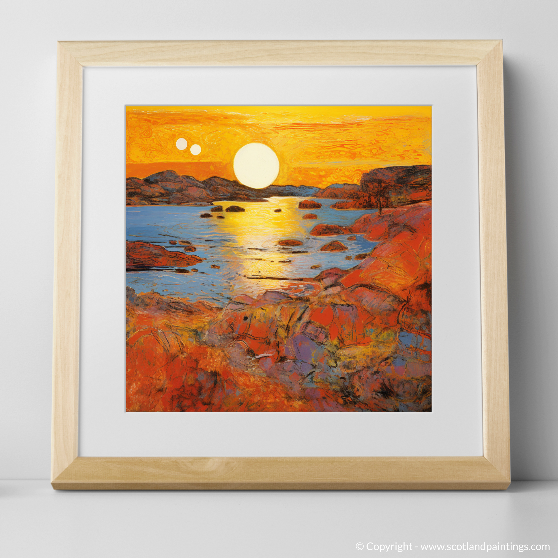 Capturing the ephemeral glow of the twilight hour, this evocative art piece transports the onlooker to the rugged shores of Achmelvich Bay, as seen through the lens of Abstract Expressionism. The print radiates with the vivid warmth of golden hour, where the sun dips gracefully towards the horizon, casting a symphony of fiery reds, burnished oranges, and soft yellow hues across the sky and water.