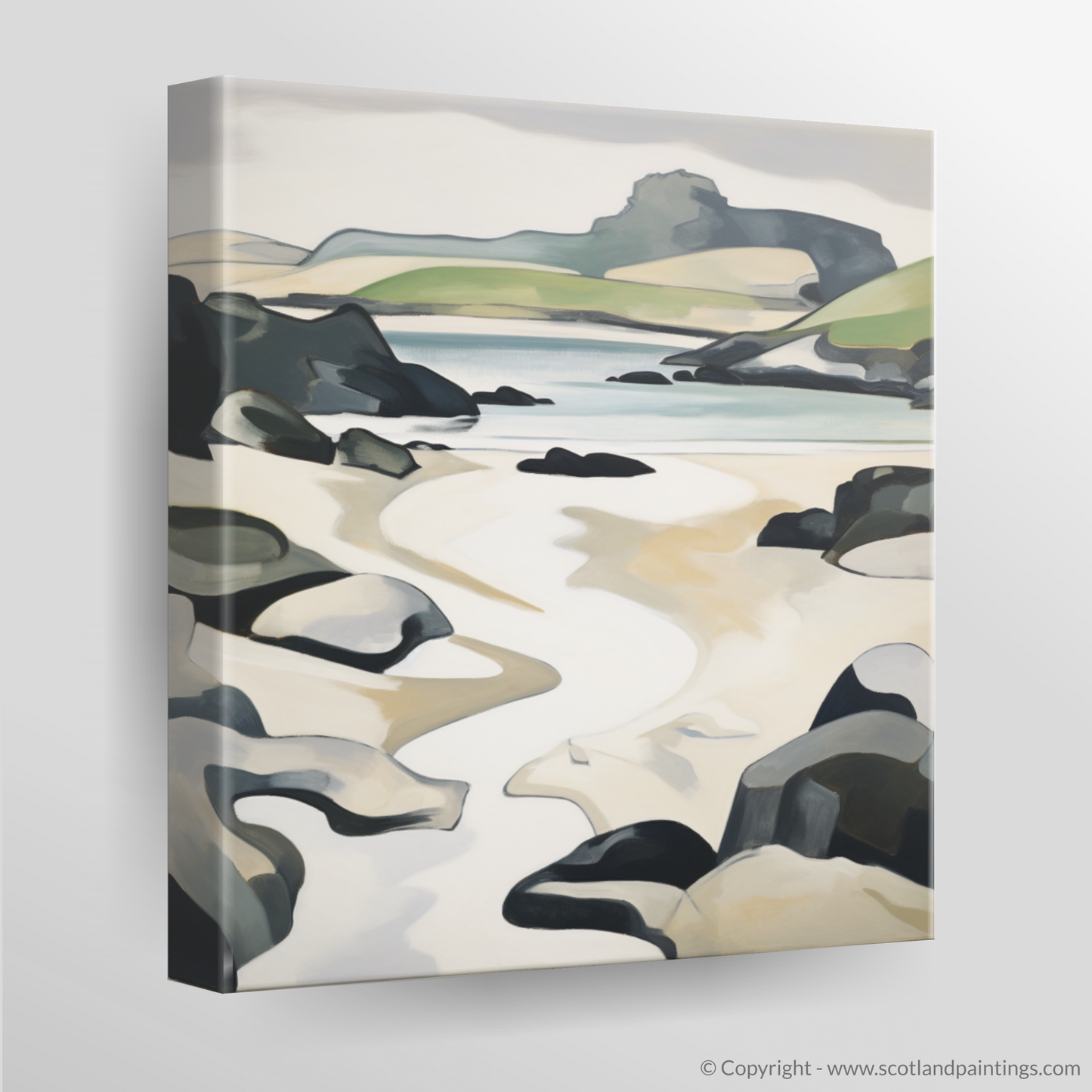At the heart of the composition lies a remarkable interplay of light and shadow, accented by a muted yet harmonious palette. Swathes of creamy whites and sandy tones evoke the expansive stretches of soft, sandy beach. These are delicately juxtaposed against the tranquillity of the tranquil azure hues that make up the calm sea, while slate greys and deep charcoals outline the imposing rock formations that pepper the coastline.
