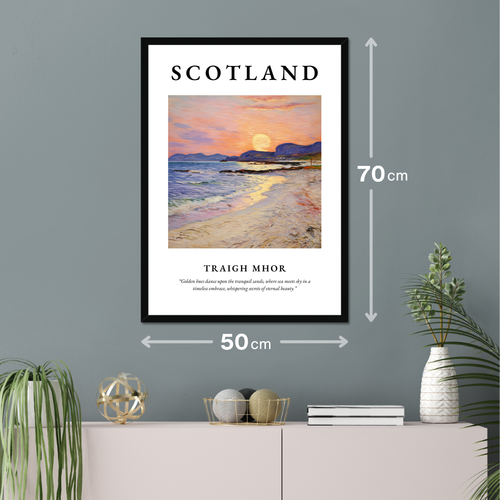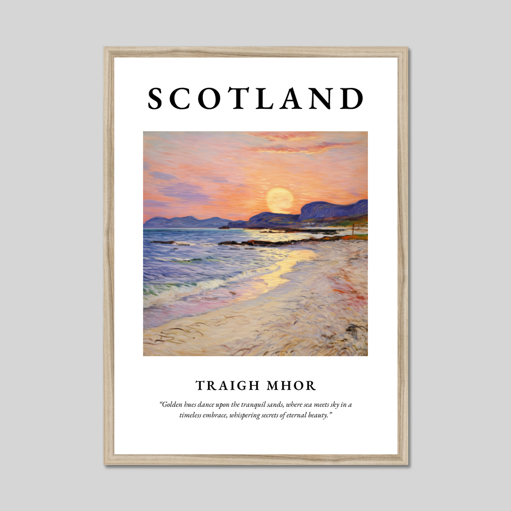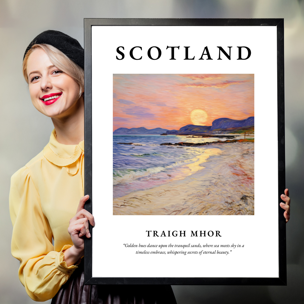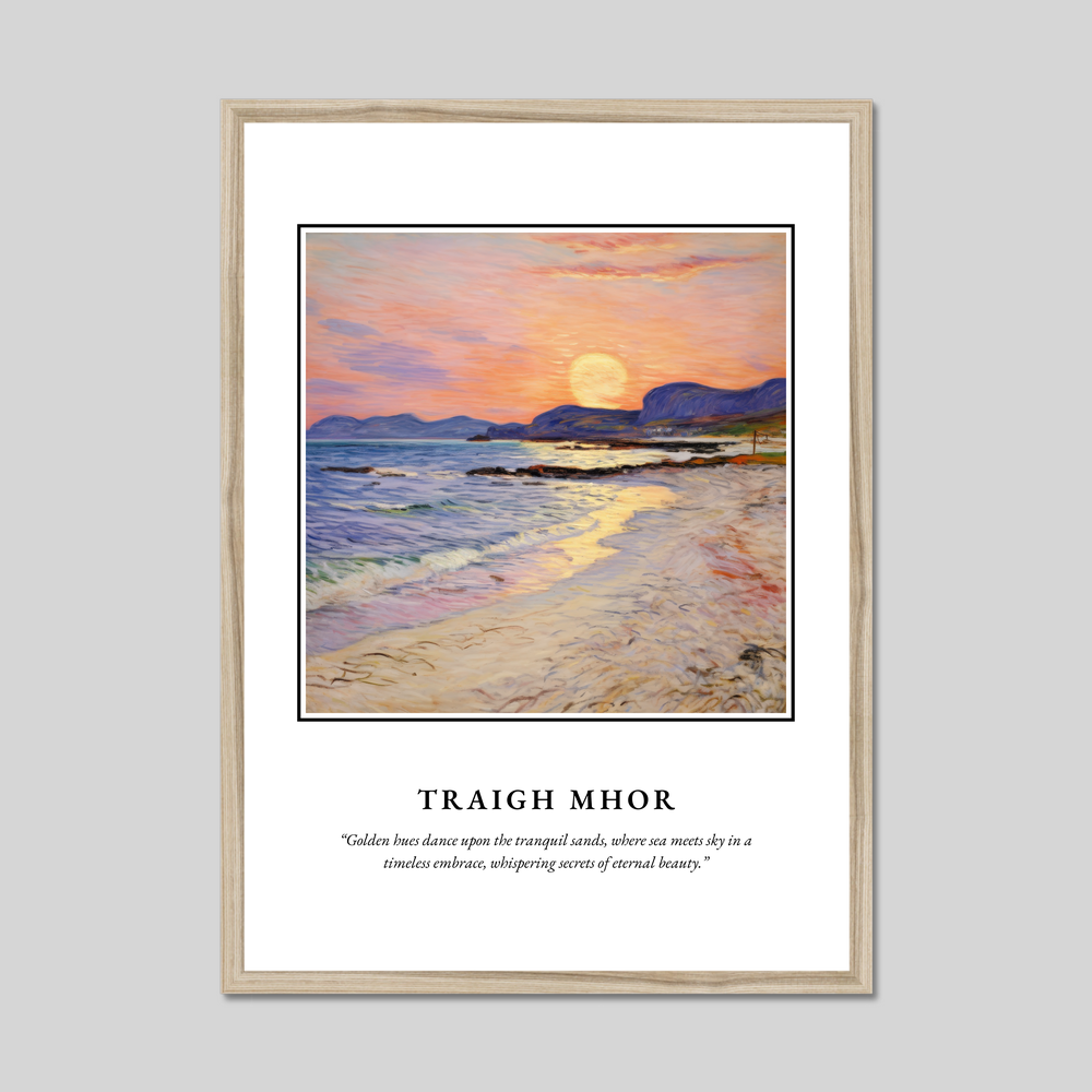 Underneath the painting, a delicate quote reads: “Golden hues dance upon the tranquil sands, where sea meets sky in a timeless embrace, whispering secrets of eternal beauty.” This poetic sentiment encapsulates the essence of Traigh Mhor, resonating with those who have visited its shores or feel a deep connection to Scotland's mesmerising landscapes.
