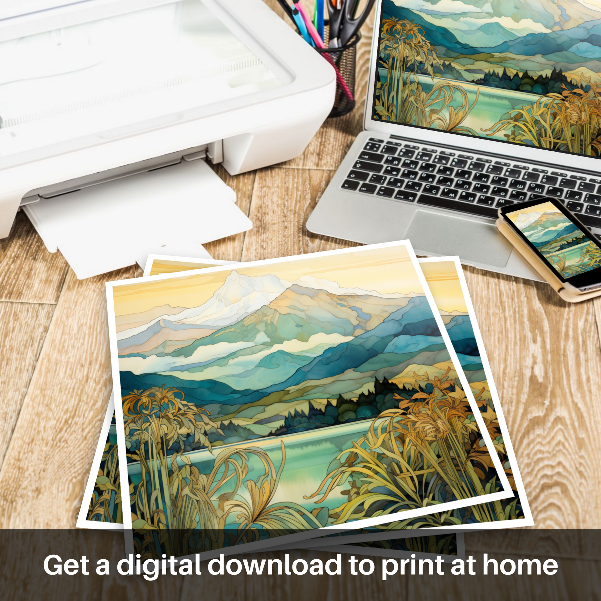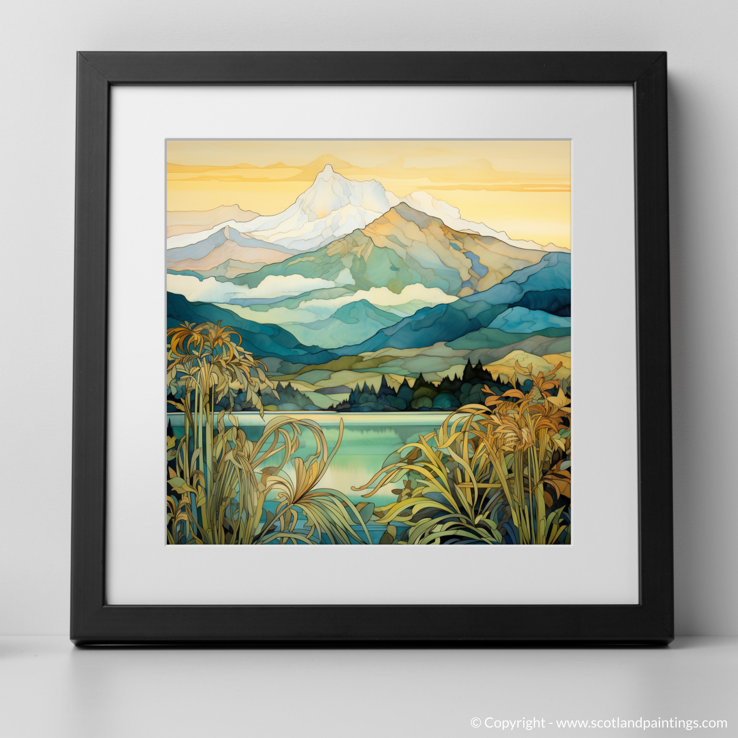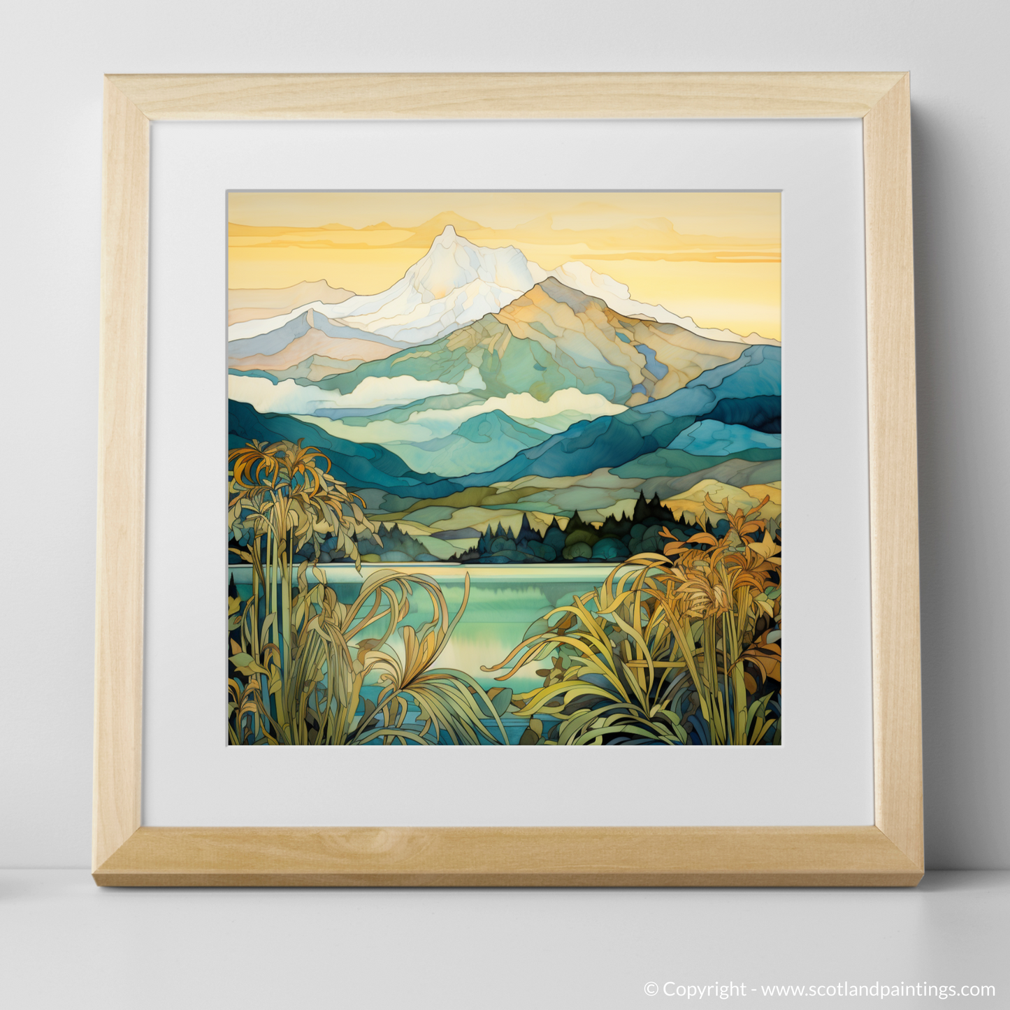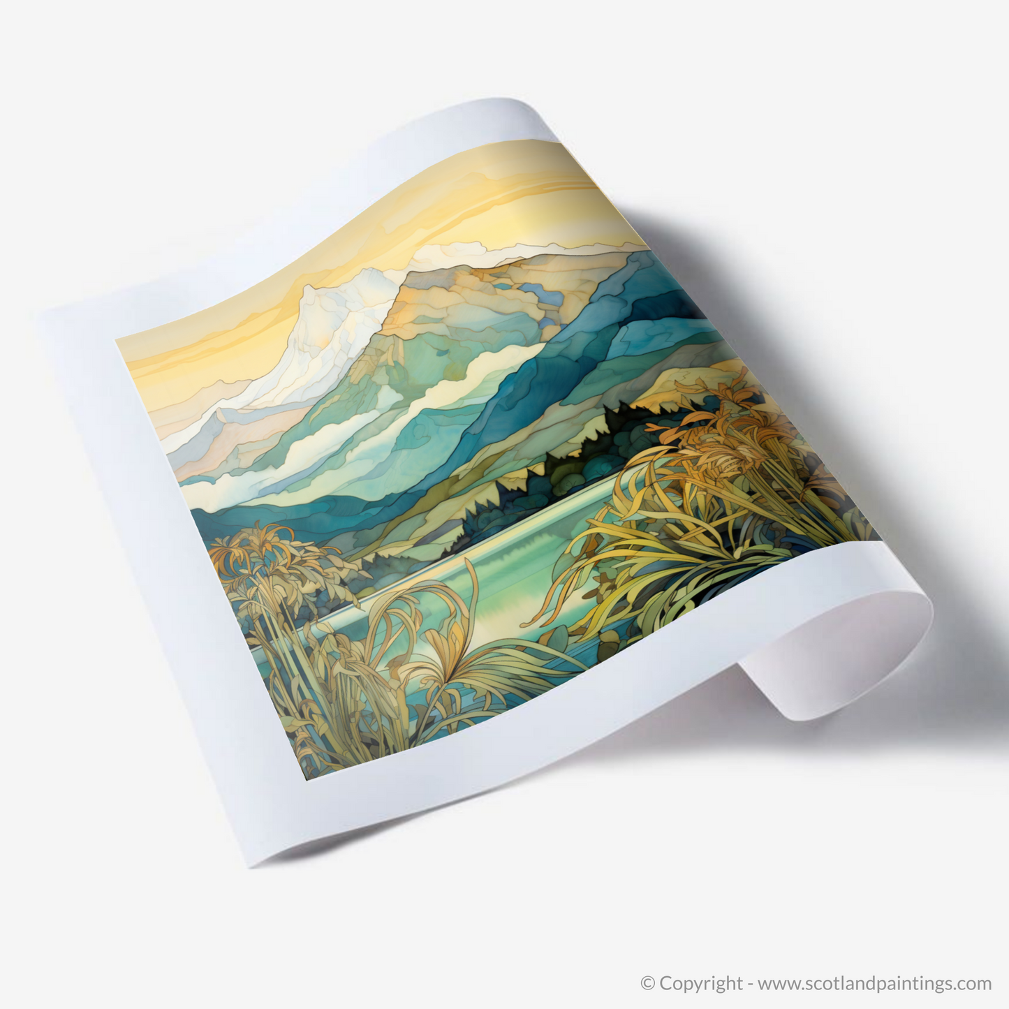 Capture the essence of the Scottish Highlands with this enchanting Art Nouveau-inspired piece that transports viewers to the serene landscapes around Ben Cruachan, Argyll and Bute. The print depicts a harmonious blend of nature and artistry, weaving together the splendour of Scotland's mountainous terrain with the distinctive, ornamental style characteristic of the Art Nouveau movement.