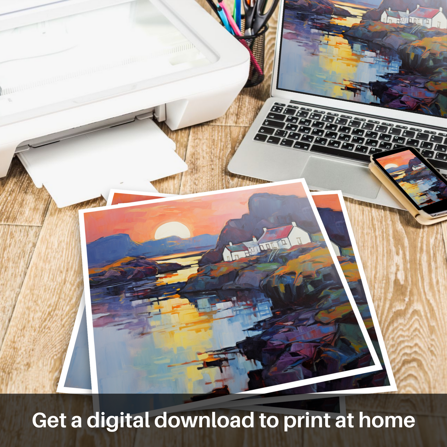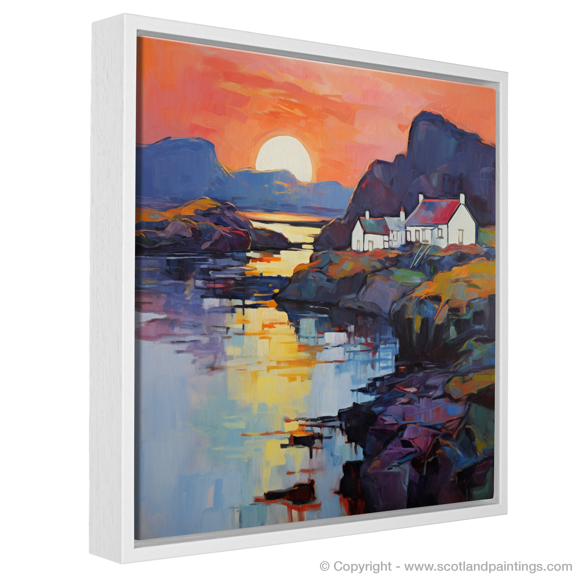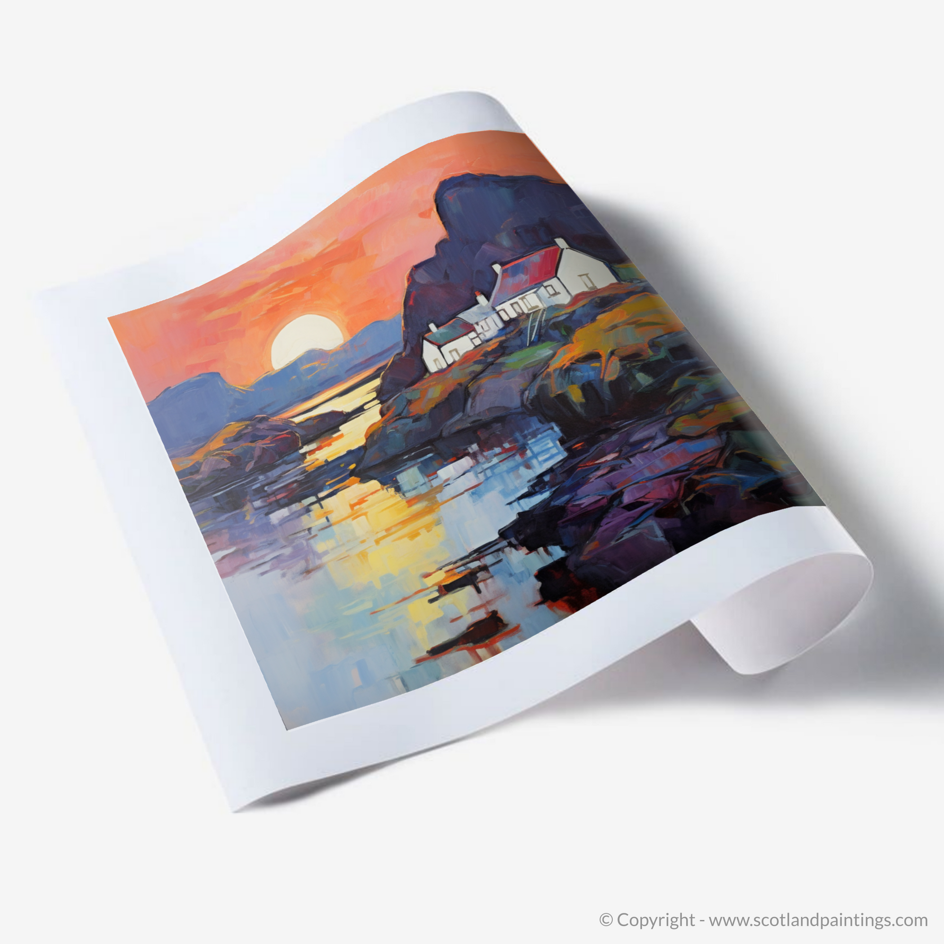Sweeping brushstrokes and an audacious palette bring to life an image that captures the enchanting essence of a secluded Scottish Cove at twilight's embrace. This exquisite print, with its vivid juxtaposition of colours, pays homage to the untamed beauty of Easdale Sound as the day ebbs away into dusk.