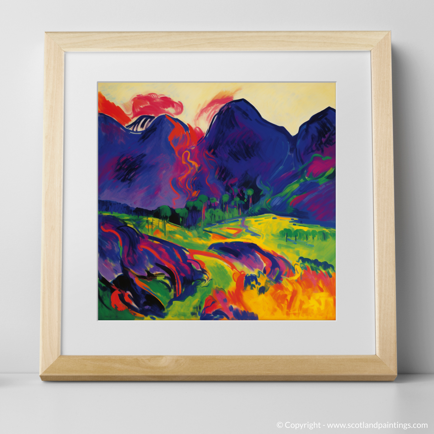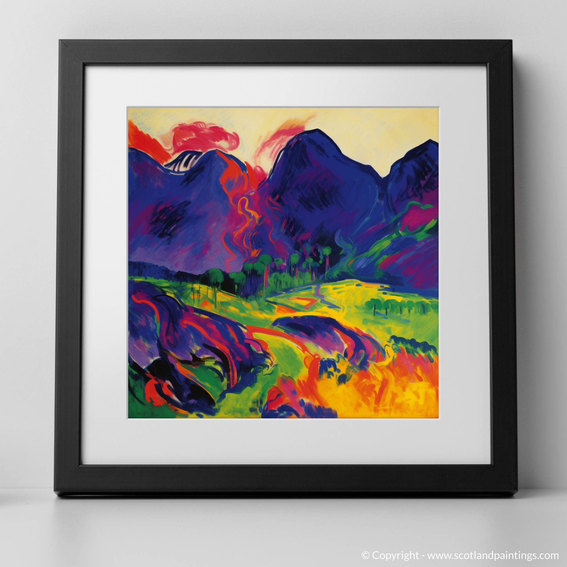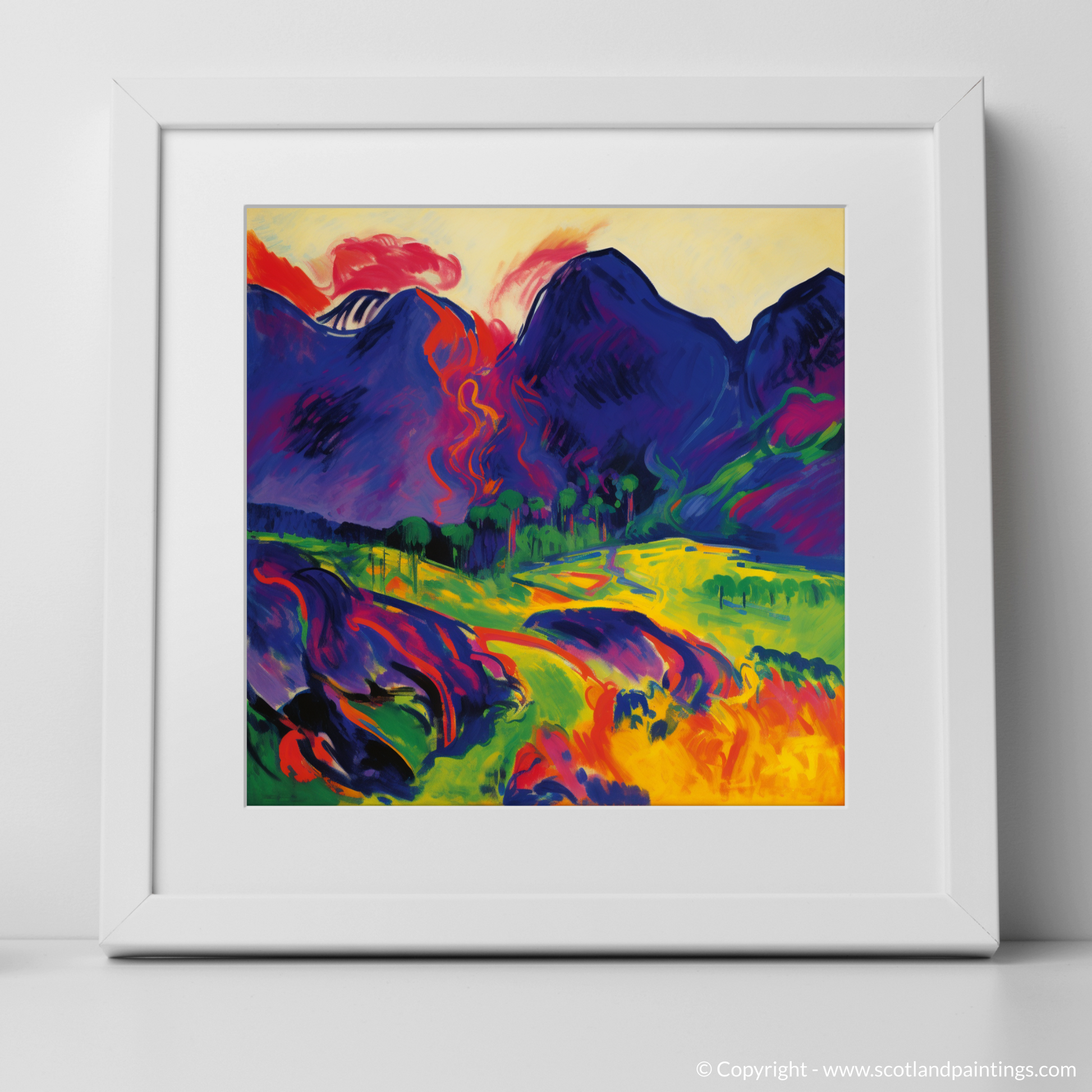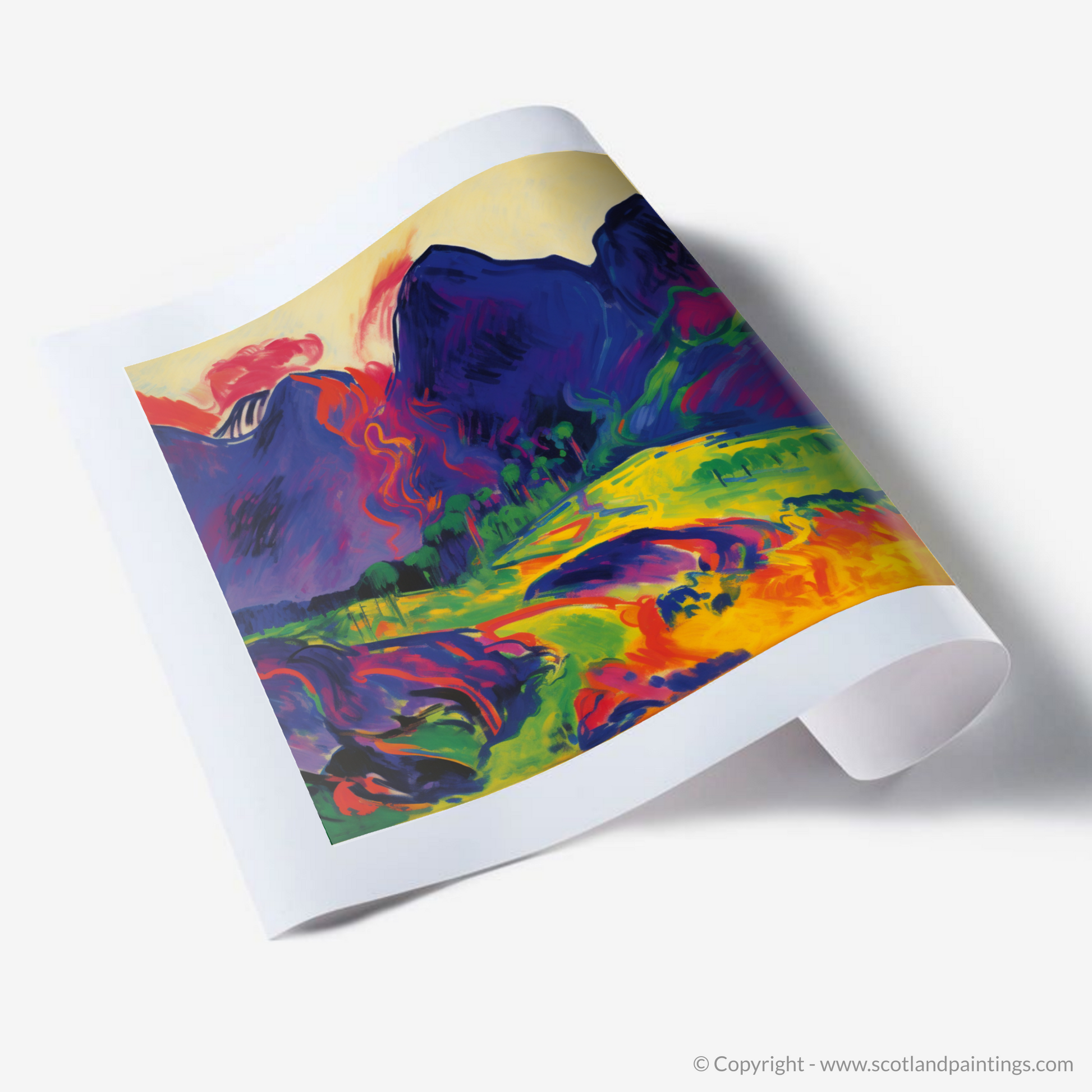Immerse yourself in the vibrant embrace of the Scottish Highlands with this spellbinding print. Capturing the untamed essence of Aonach Eagach, this piece is an audacious interpretation that departs from the conventional to celebrate the intense hues and wild emotional resonances of Fauvism. Bold, expressive brushstrokes construct a rhythm of undulating terrain, where the visage of mountains looms large, rendered in deeply saturated purples and blues that command the viewer’s gaze.