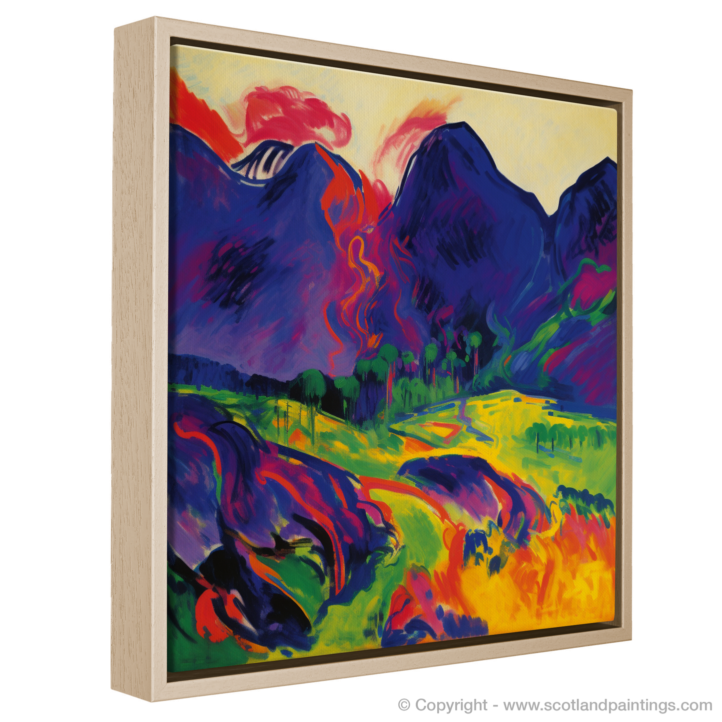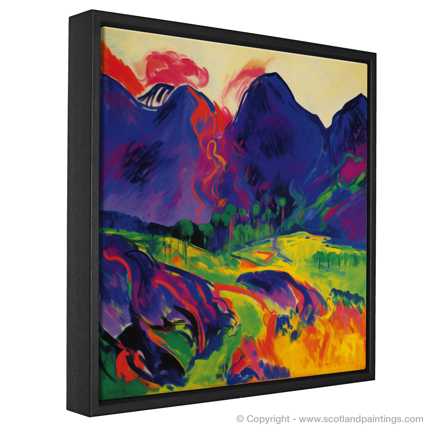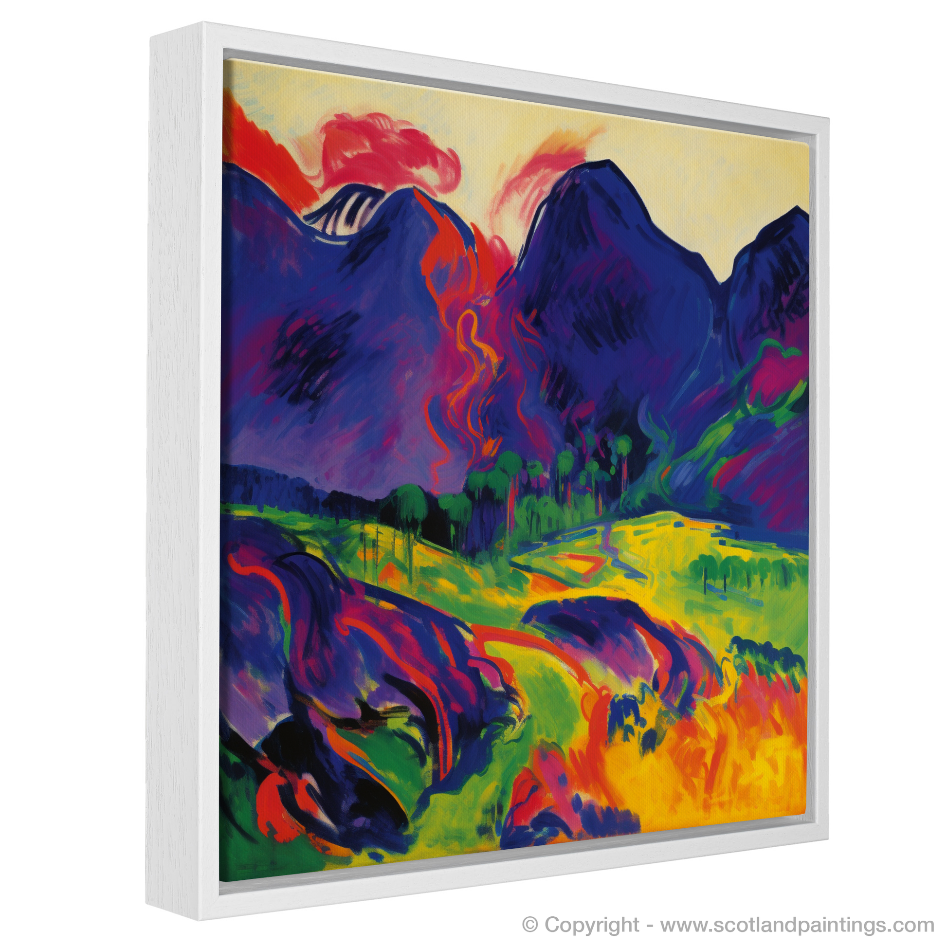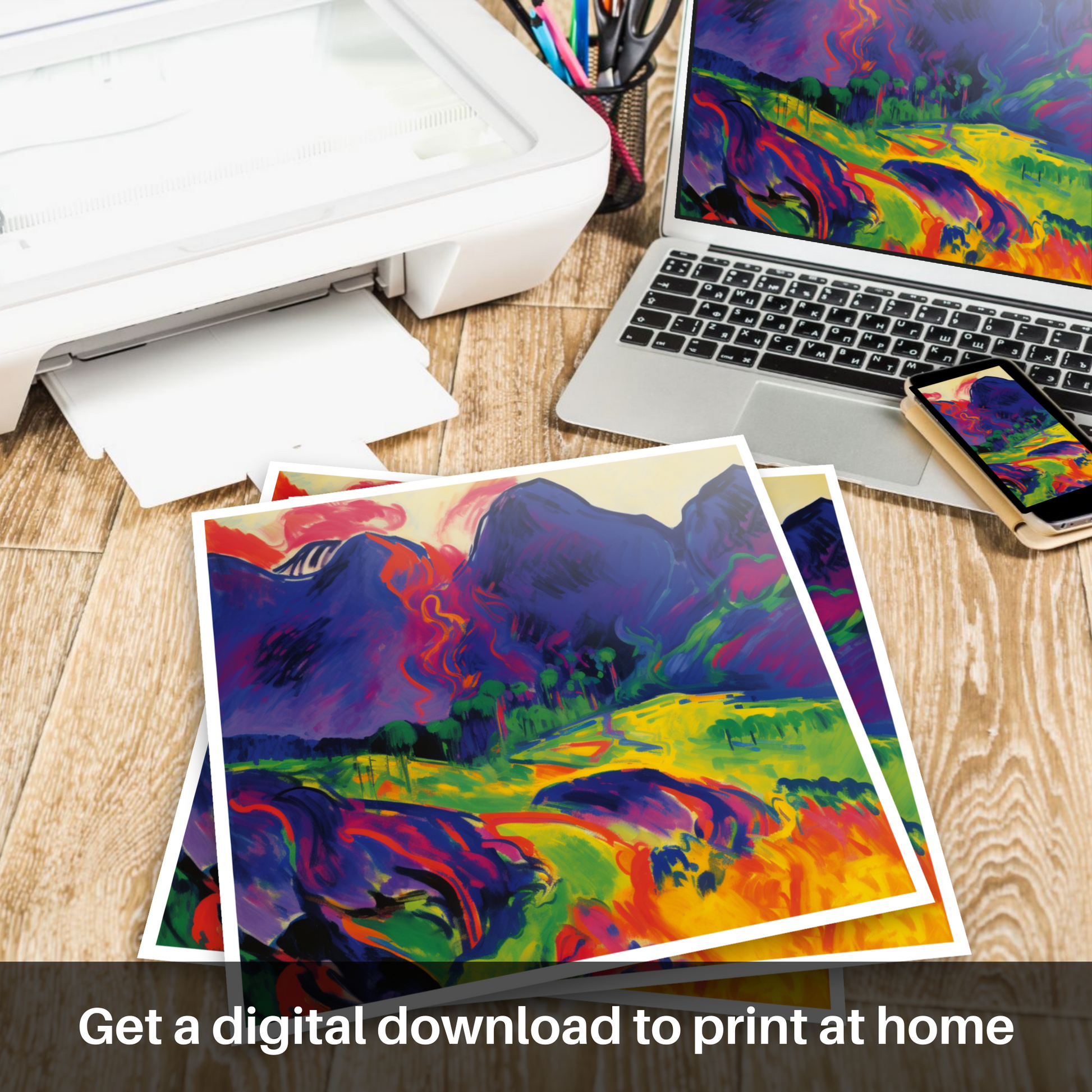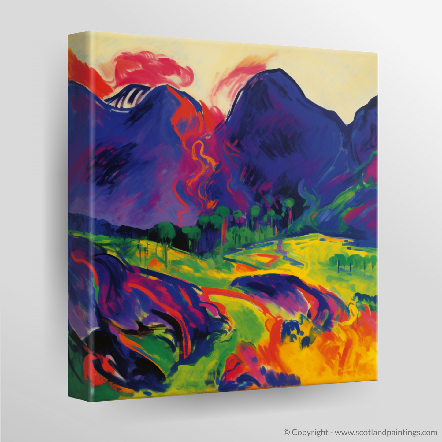 Immerse yourself in the vibrant embrace of the Scottish Highlands with this spellbinding print. Capturing the untamed essence of Aonach Eagach, this piece is an audacious interpretation that departs from the conventional to celebrate the intense hues and wild emotional resonances of Fauvism. Bold, expressive brushstrokes construct a rhythm of undulating terrain, where the visage of mountains looms large, rendered in deeply saturated purples and blues that command the viewer’s gaze.