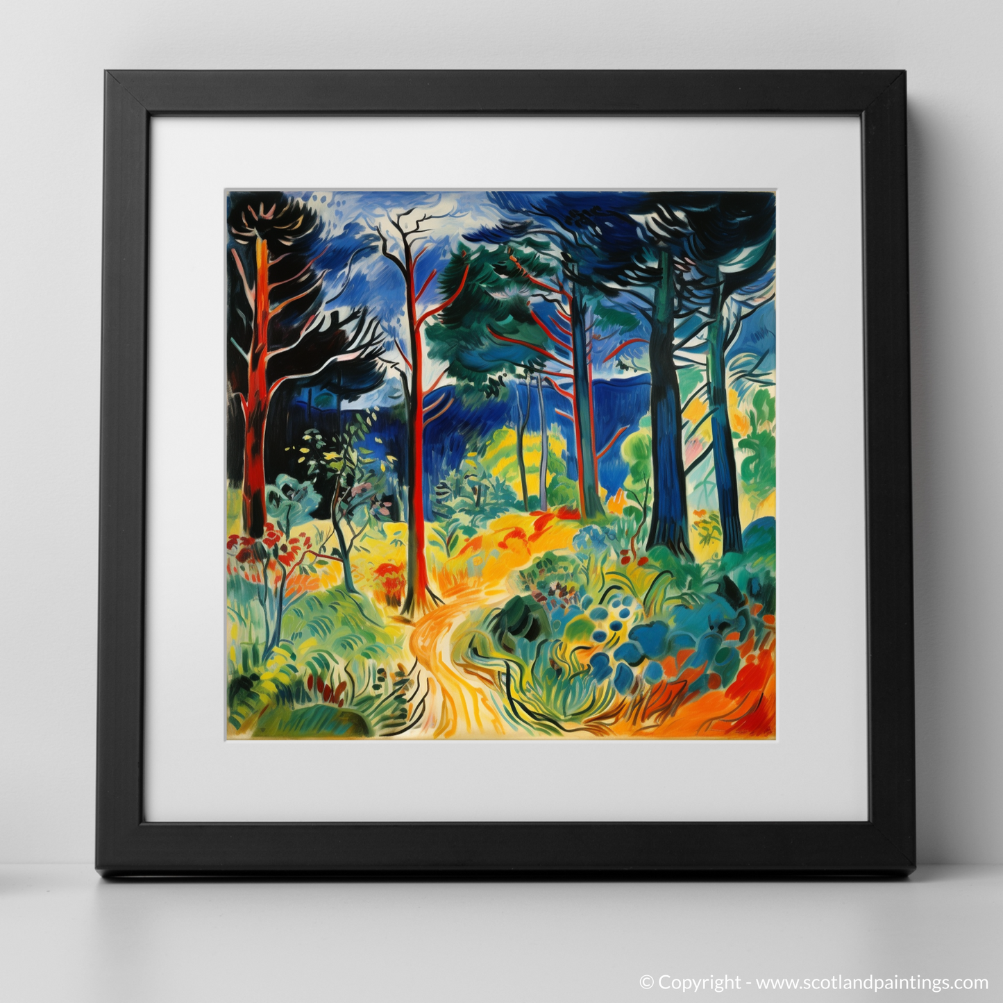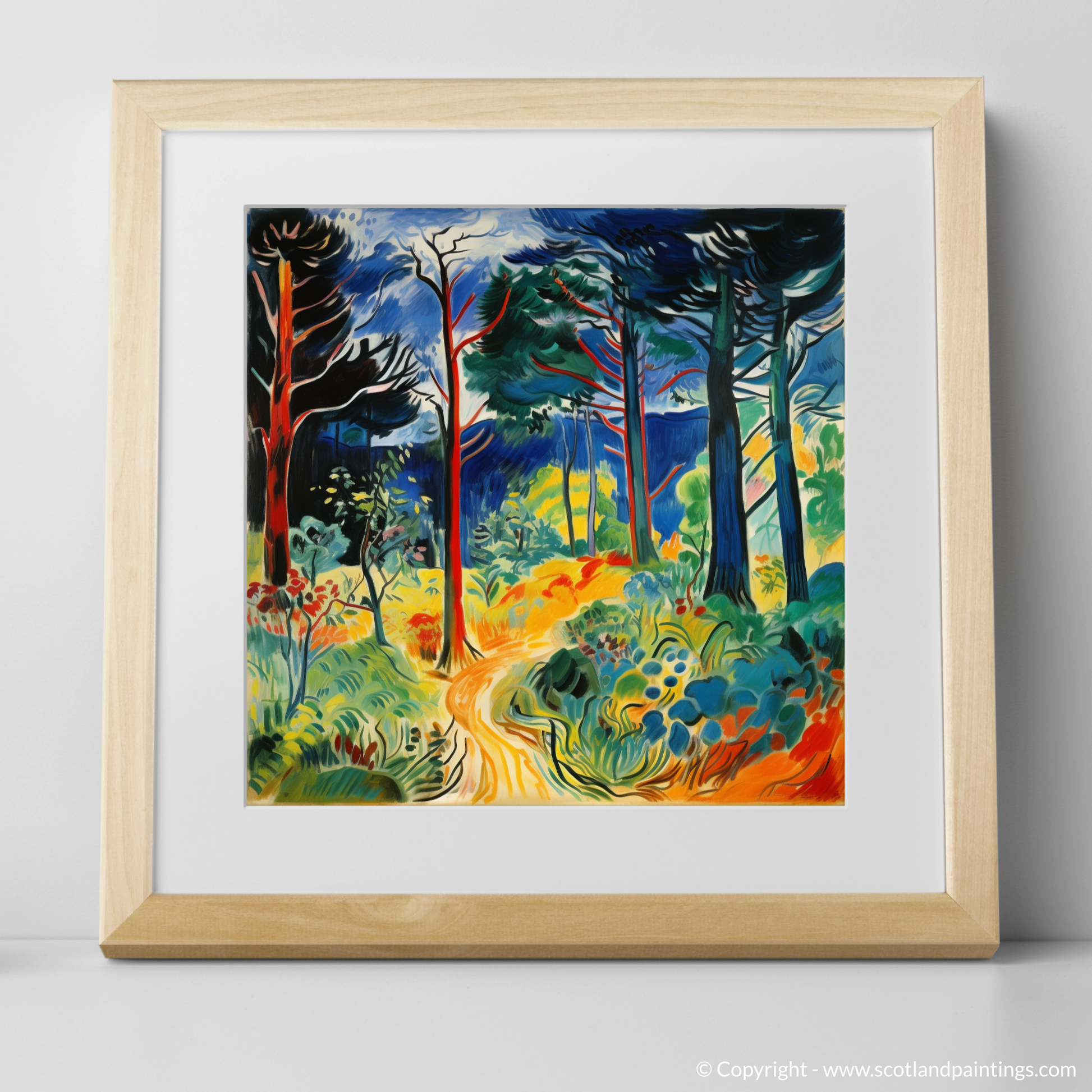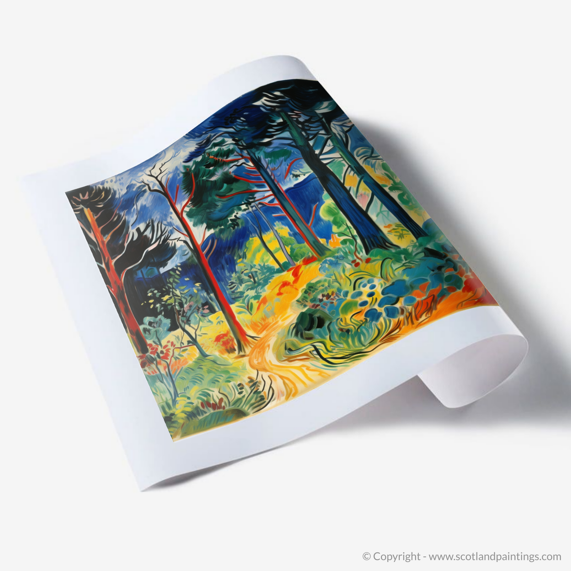 Immerse yourself in the vibrant hues and untamed energy of nature with this exquisite Fauvist-style print inspired by Pitmedden Forest in Aberdeenshire. The artwork captures the forest's wild beauty through bold colours and dynamic brushstrokes that seem to dance across the canvas, creating an invigorating and evocative image. A meandering path, rendered in warm yellows and oranges, draws the eye into the depths of the piece, inviting you to explore the thickets of abstraction.
