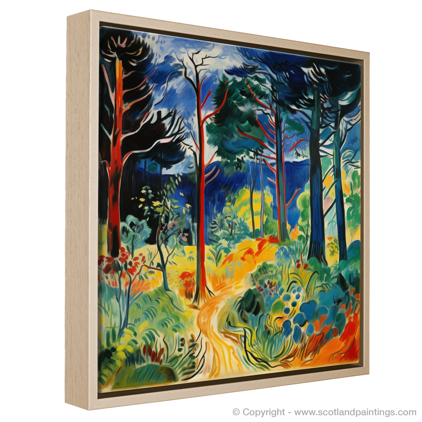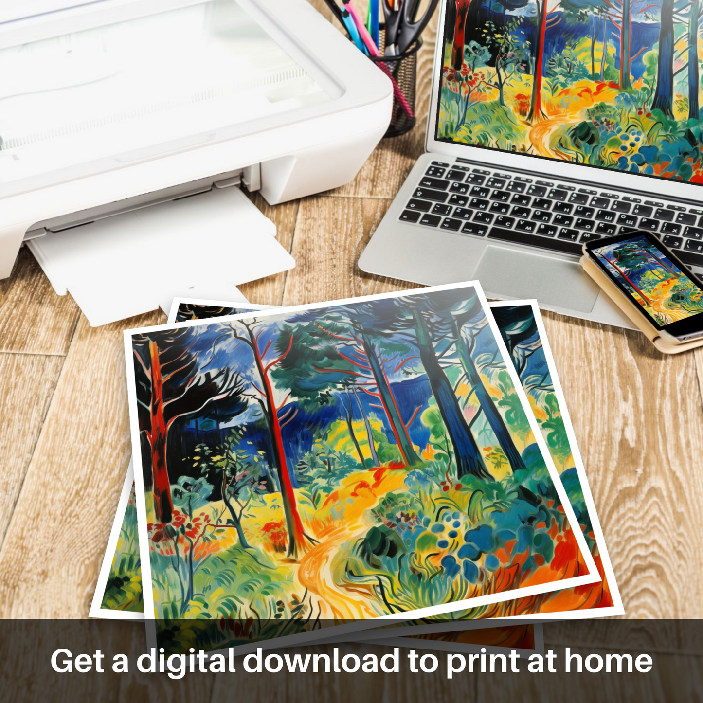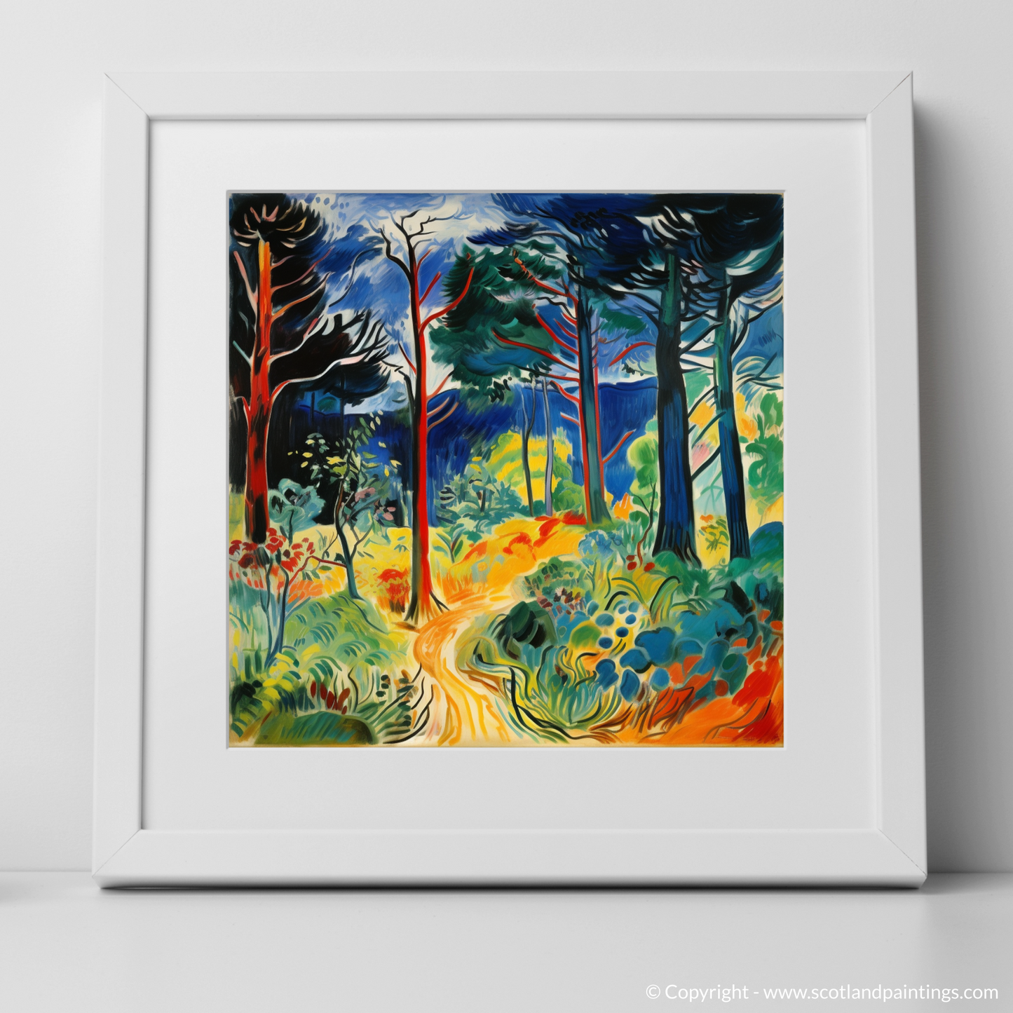 Immerse yourself in the vibrant hues and untamed energy of nature with this exquisite Fauvist-style print inspired by Pitmedden Forest in Aberdeenshire. The artwork captures the forest's wild beauty through bold colours and dynamic brushstrokes that seem to dance across the canvas, creating an invigorating and evocative image. A meandering path, rendered in warm yellows and oranges, draws the eye into the depths of the piece, inviting you to explore the thickets of abstraction.