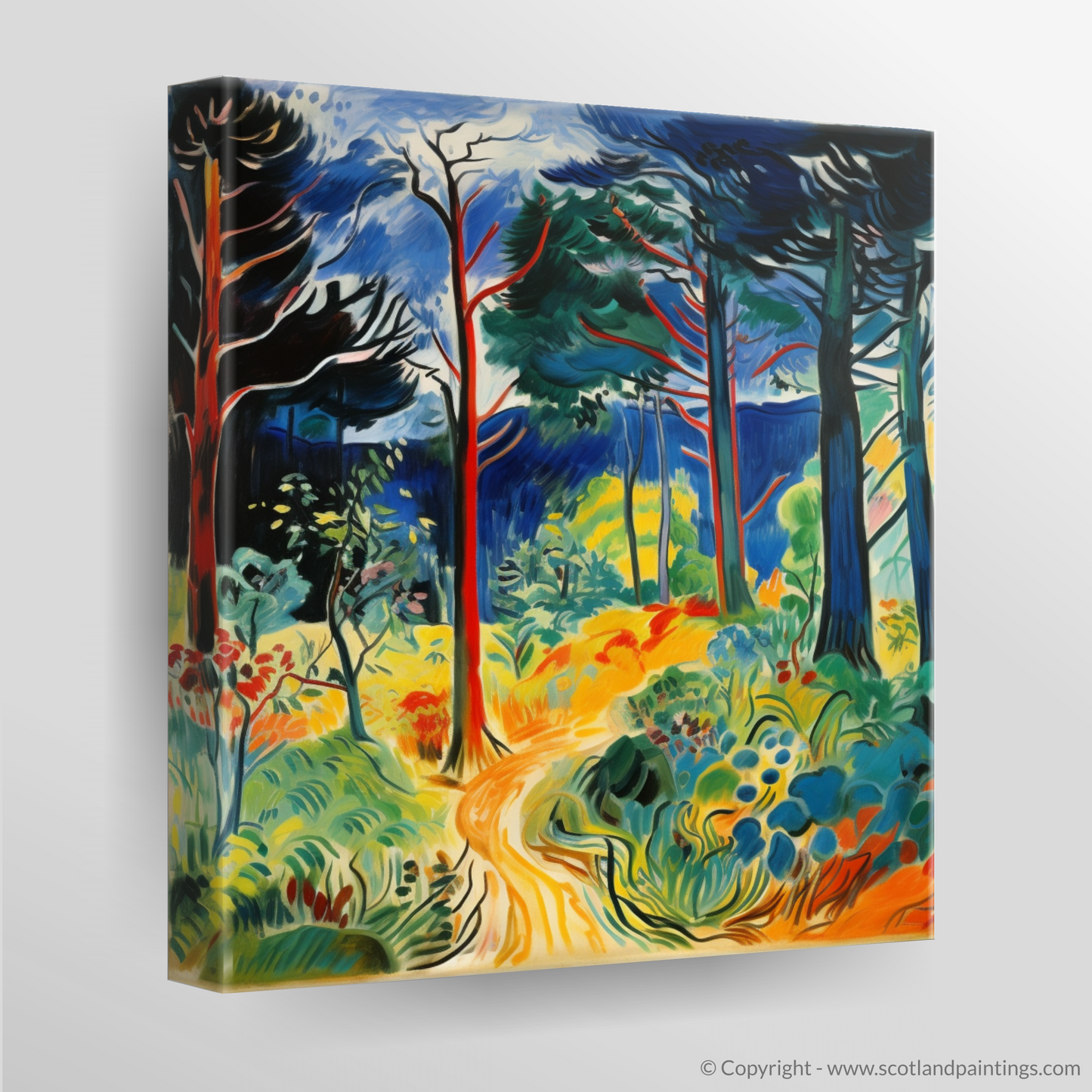 Energetic shades of green suggest foliage in vivid motion, while splashes of red, blue, and yellow punctuate the composition, hinting at wildflowers, sunlit clearings, or the fleeting dappling of light through the tree canopy. The trees themselves are stylised with an almost enigmatic quality, their trunks and branches outlined against the sky, which shifts from azure to a moody indigo. This lively interpretation of Scottish woodlands promises to bring a burst of natural exuberance and colour into any space it adorns.