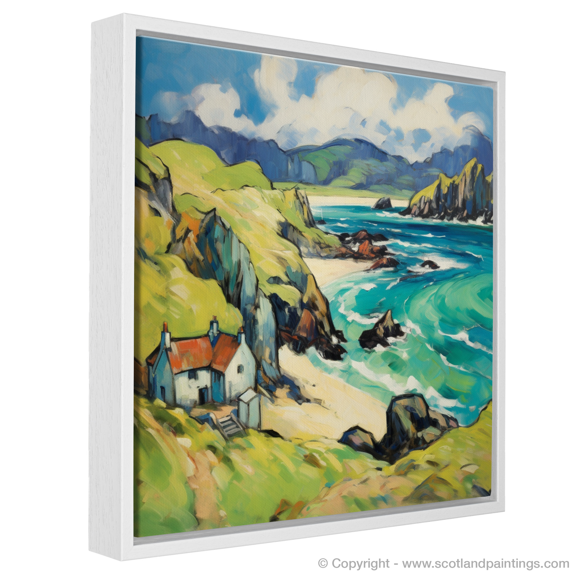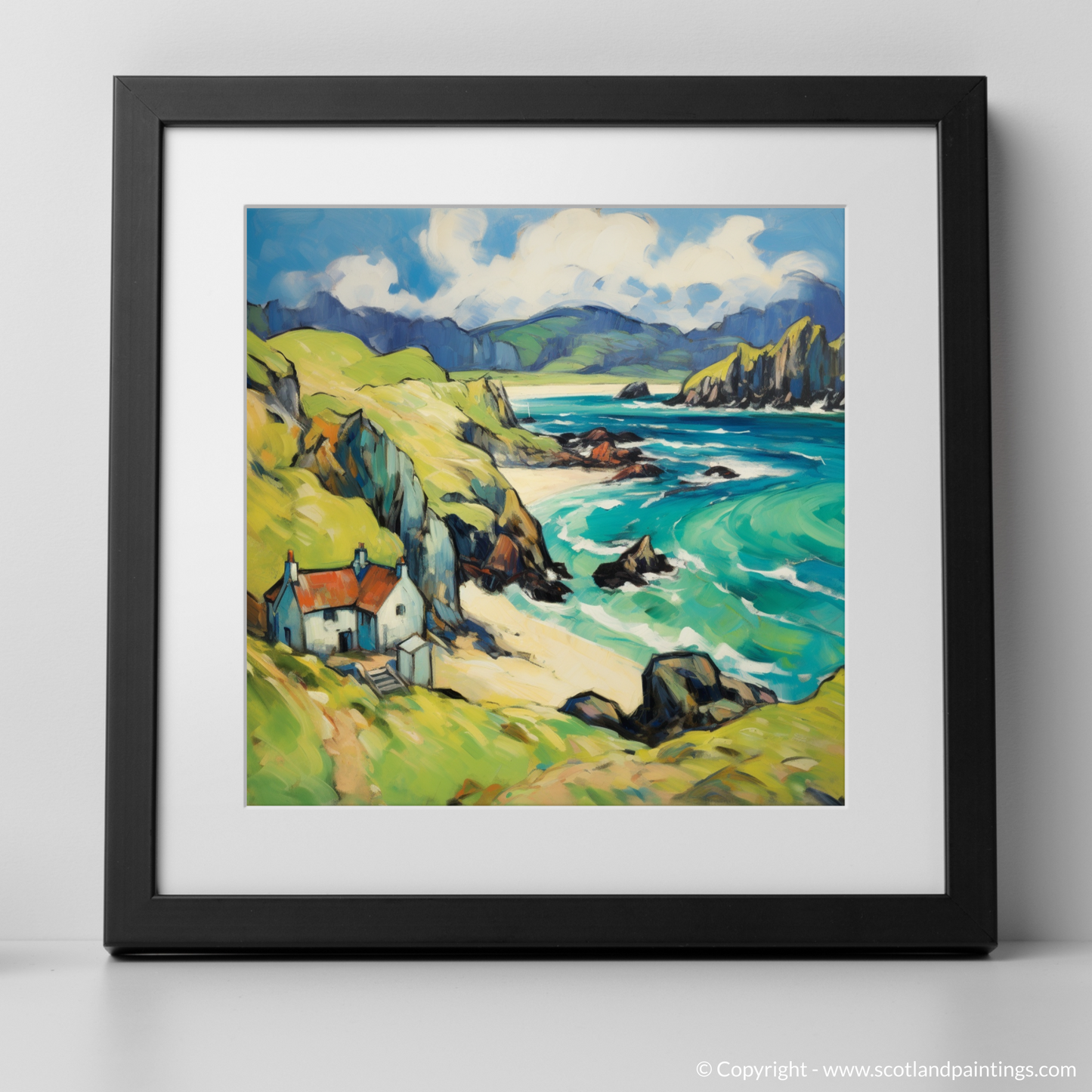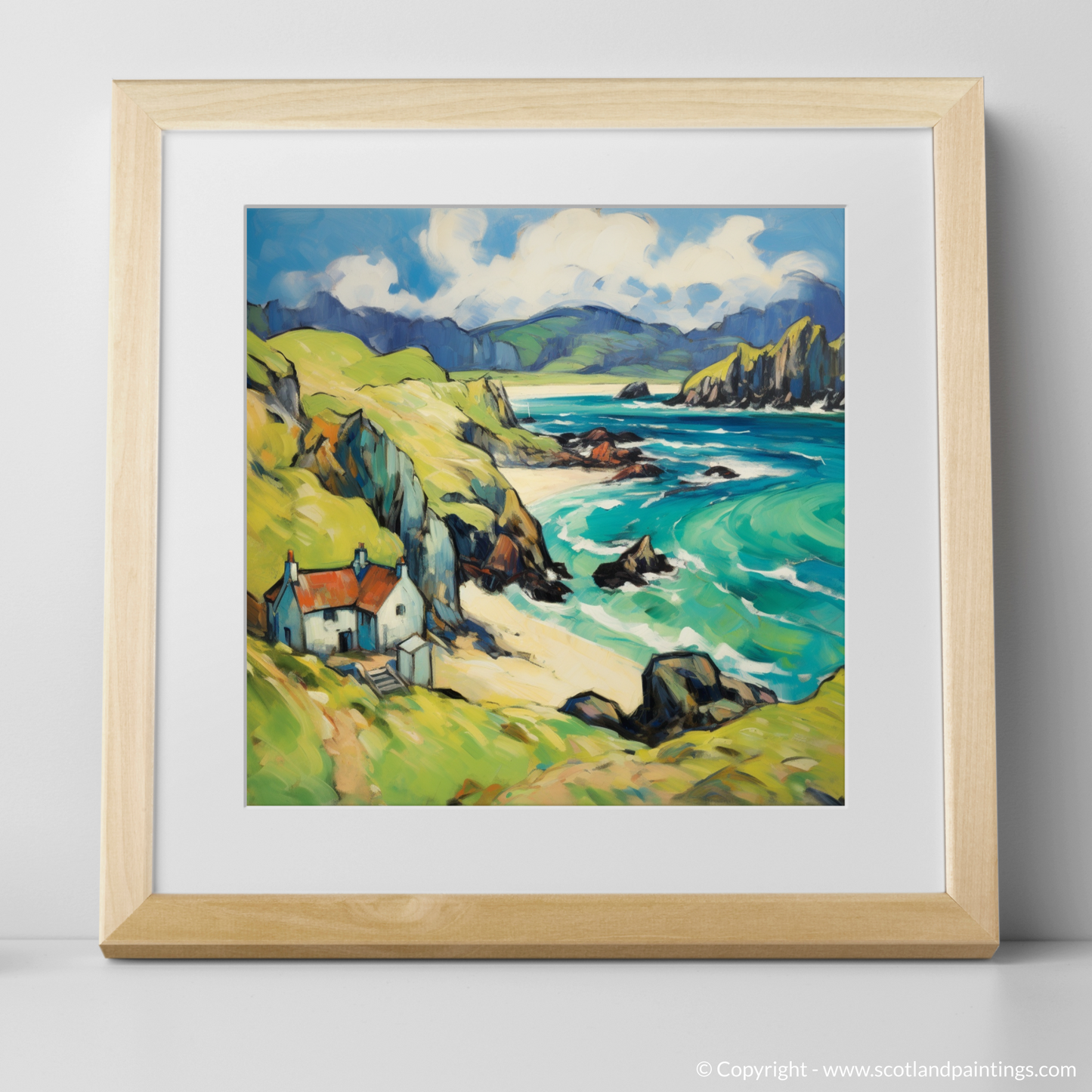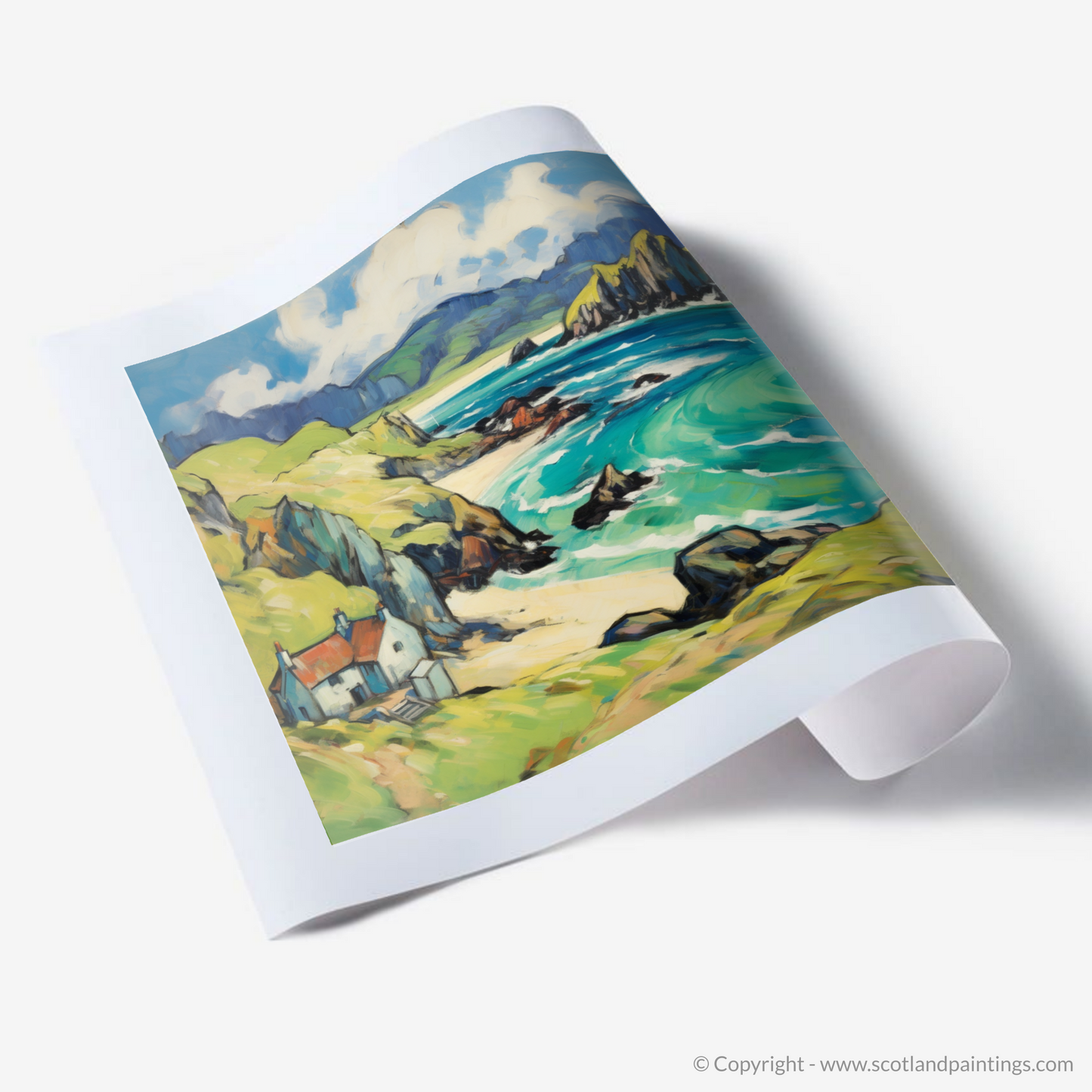 Immerse yourself in the rugged charm of the Isle of Lewis with this enthralling print, a nod to Fauvism with its bold colours and swirling forms. The composition showcases a harmonious blend of nature's exuberance and serene human habitation, inviting the viewer into a vivid dreamscape of the Outer Hebrides.