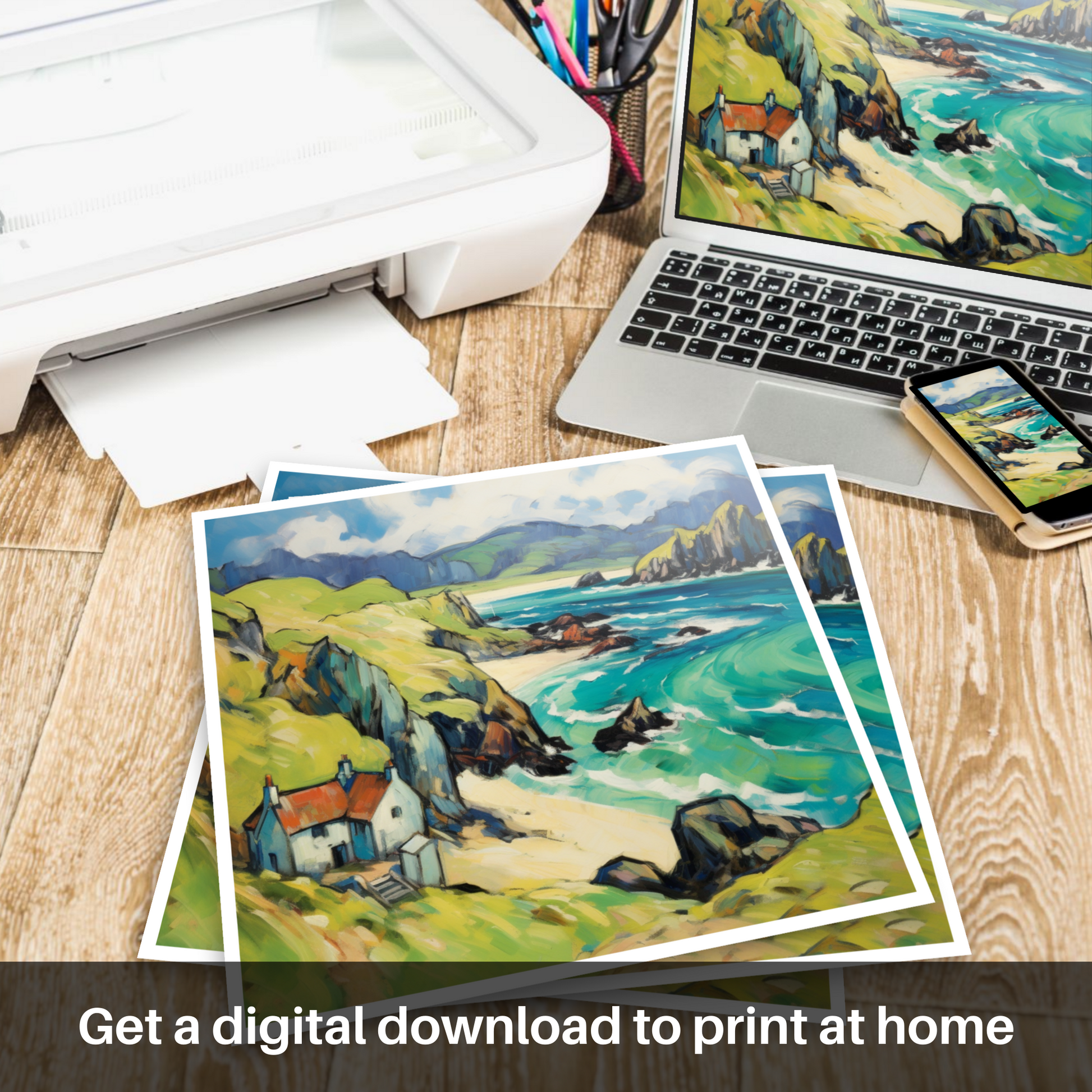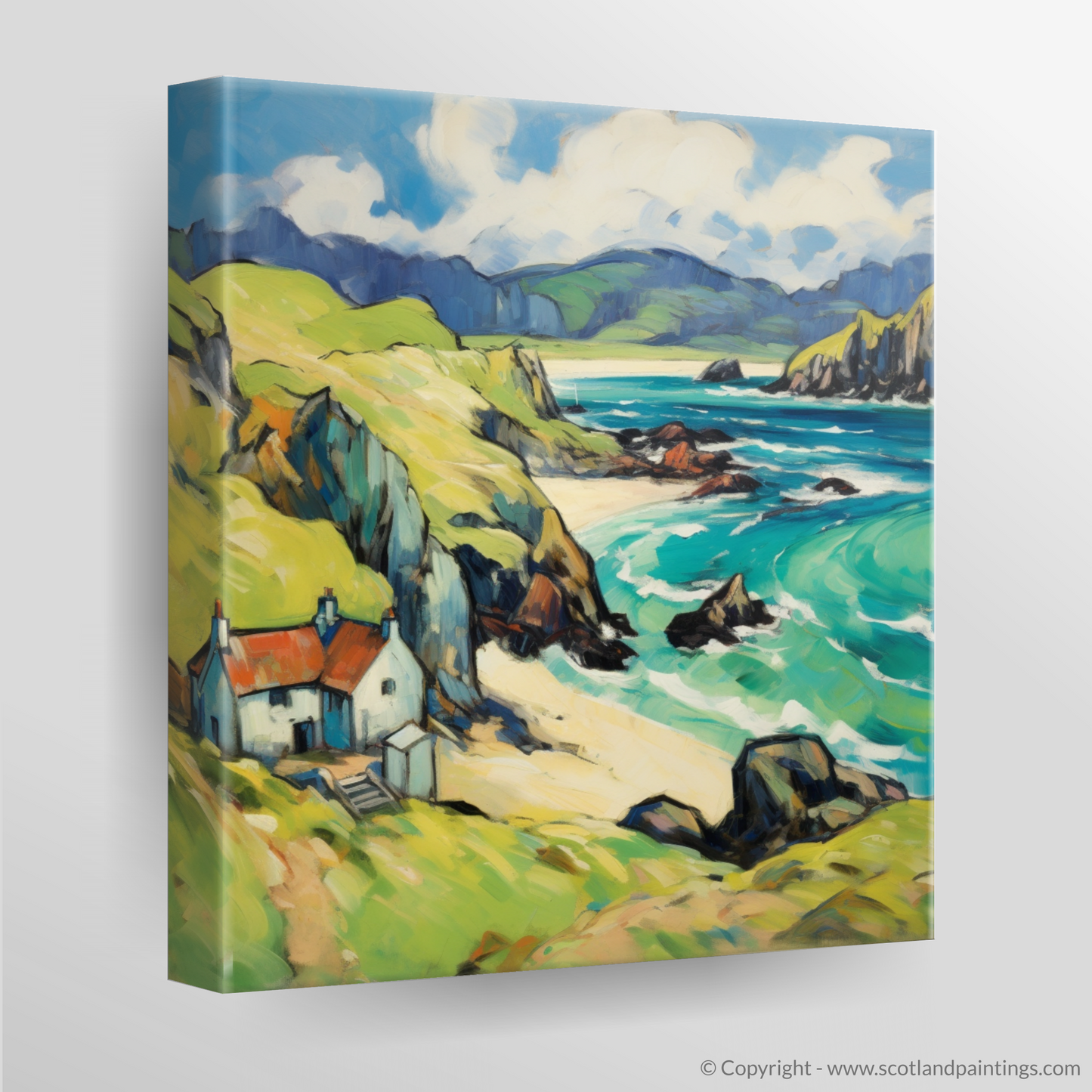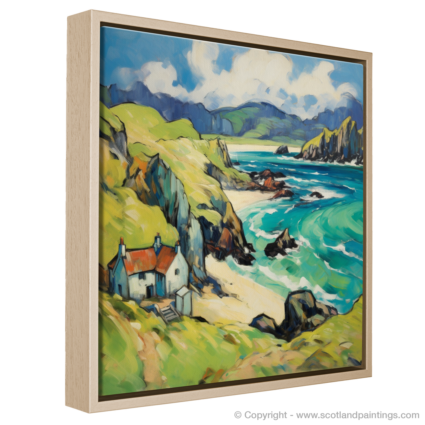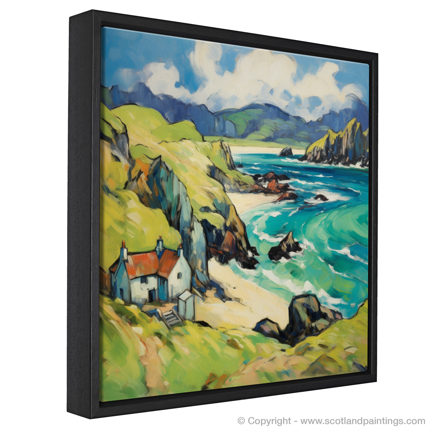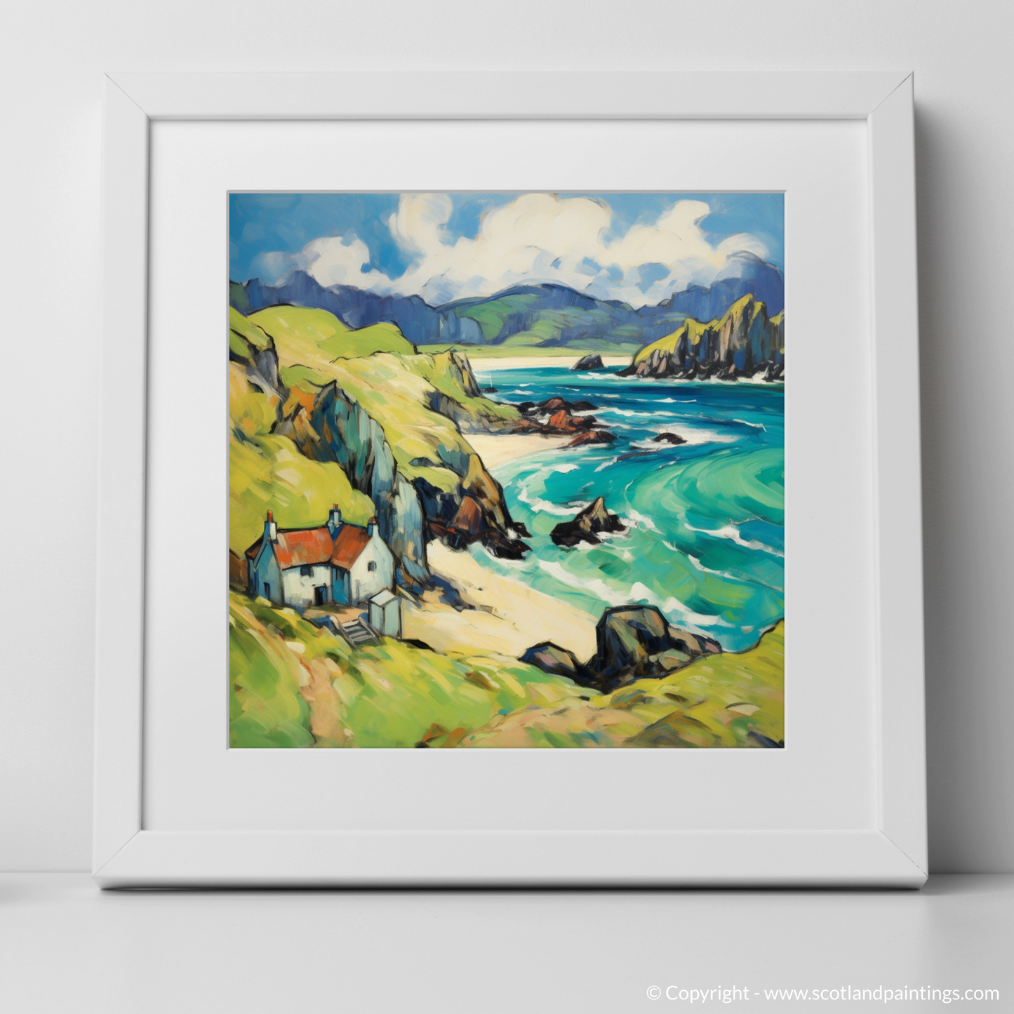 Immerse yourself in the rugged charm of the Isle of Lewis with this enthralling print, a nod to Fauvism with its bold colours and swirling forms. The composition showcases a harmonious blend of nature's exuberance and serene human habitation, inviting the viewer into a vivid dreamscape of the Outer Hebrides.