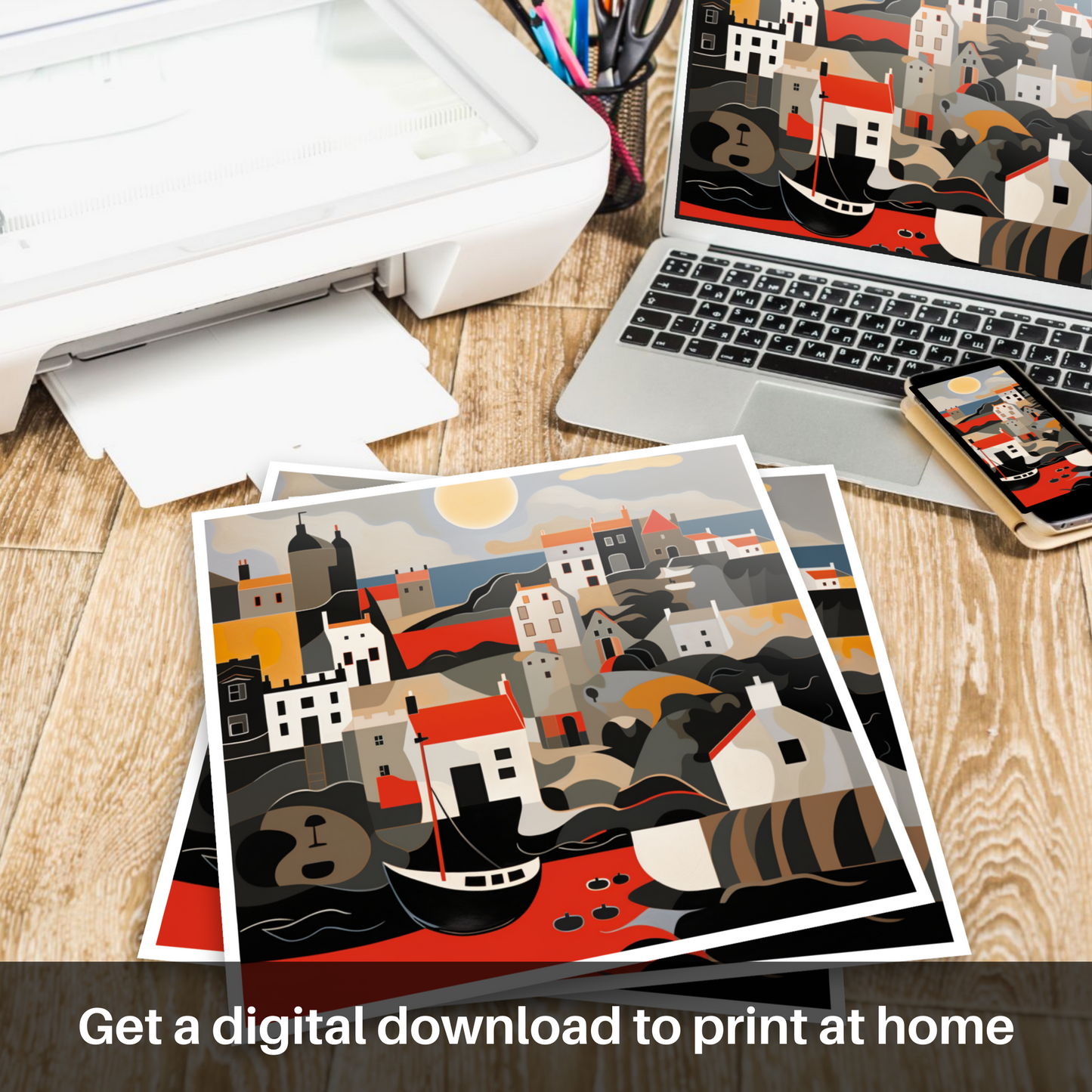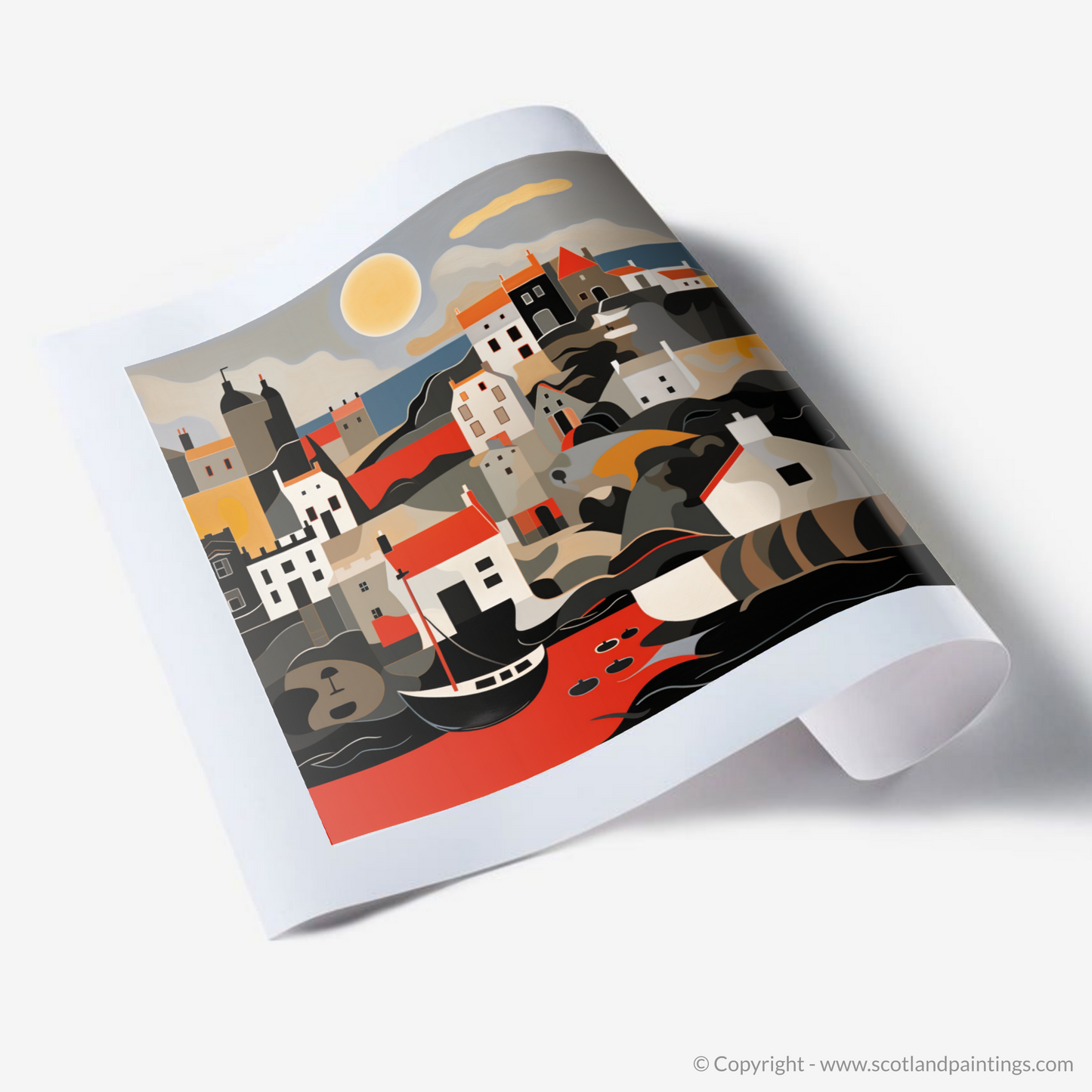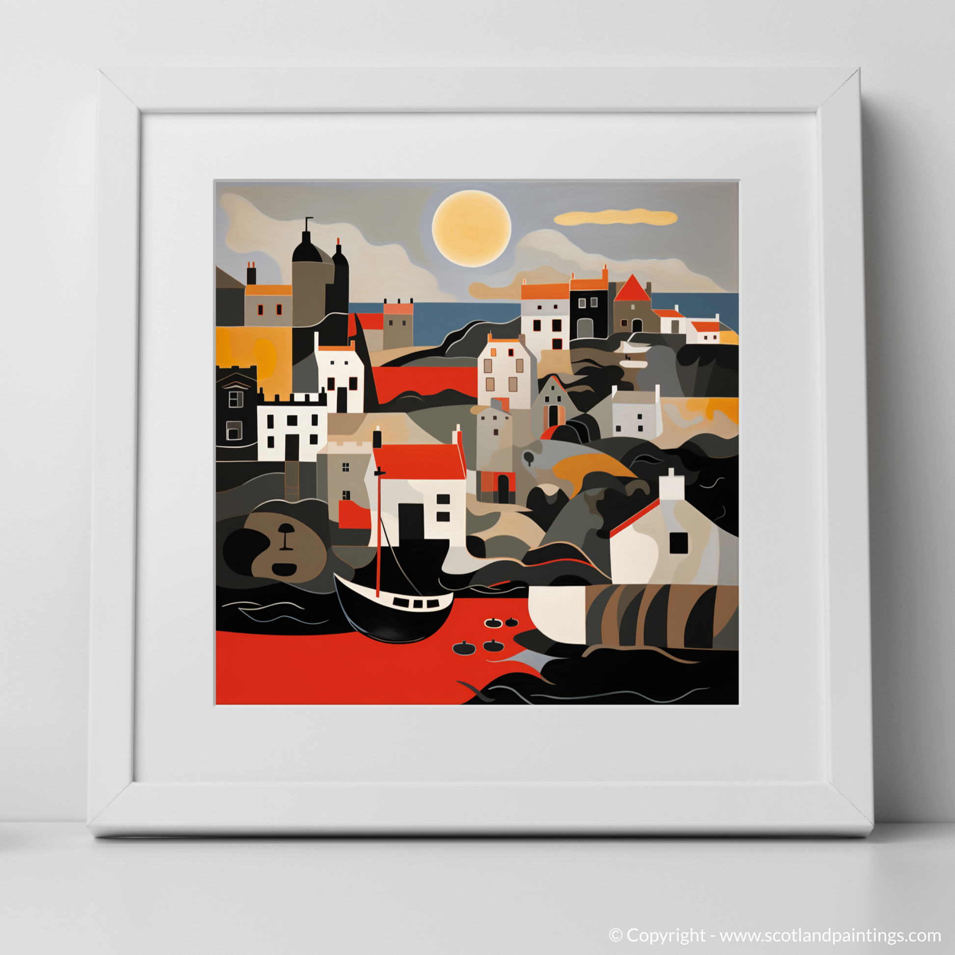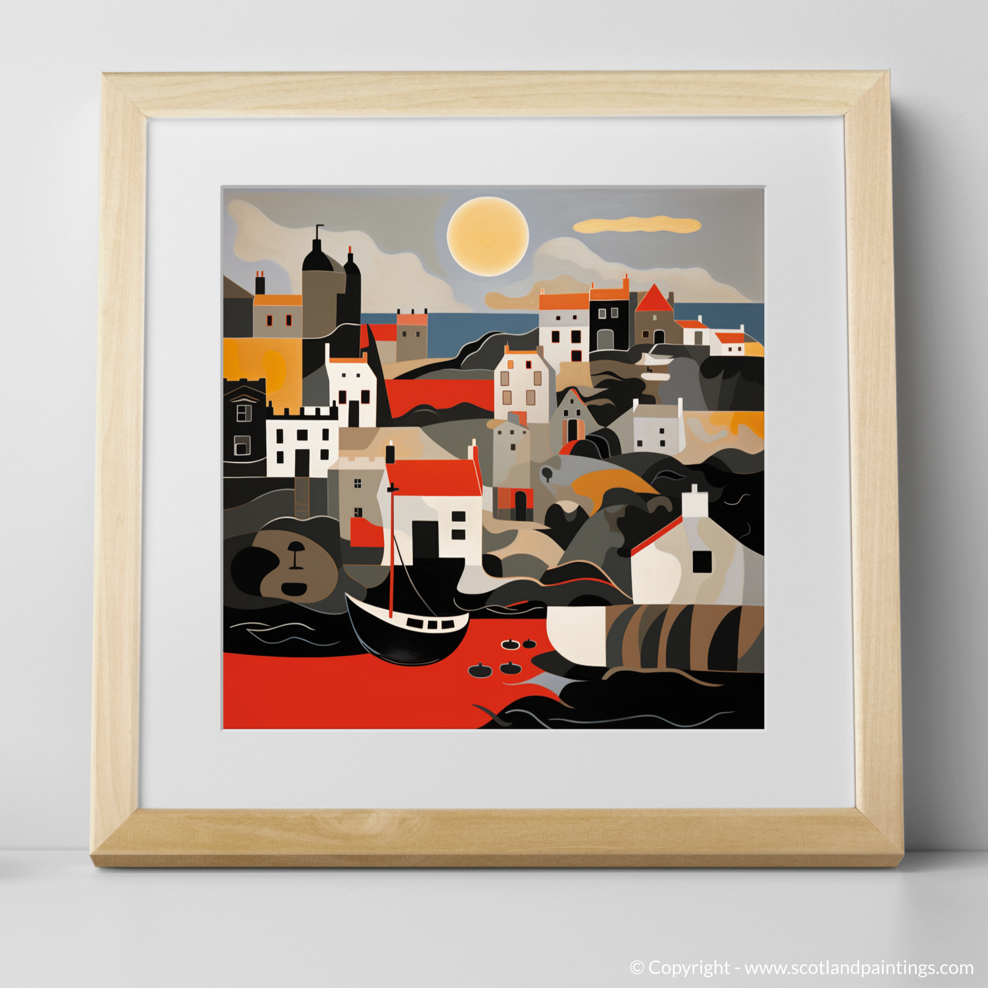 Inspired by the tranquil beauty of Crail Harbour bathed in the warm glow of the setting sun, this evocative print is an abstract portrayal that captures the essence of a serene Scottish evening at the waterfront. Bold, flat colours harmonise with flowing, curvilinear forms, abstracting the quaint harbour to create a tapestry of visual splendour. Strokes of ochre and umber navigate through the composition, mimicking the gentle sway of the boats and reflections in the water, while the muted greys and cool whites remind one of the stonework that has withstood the test of time.