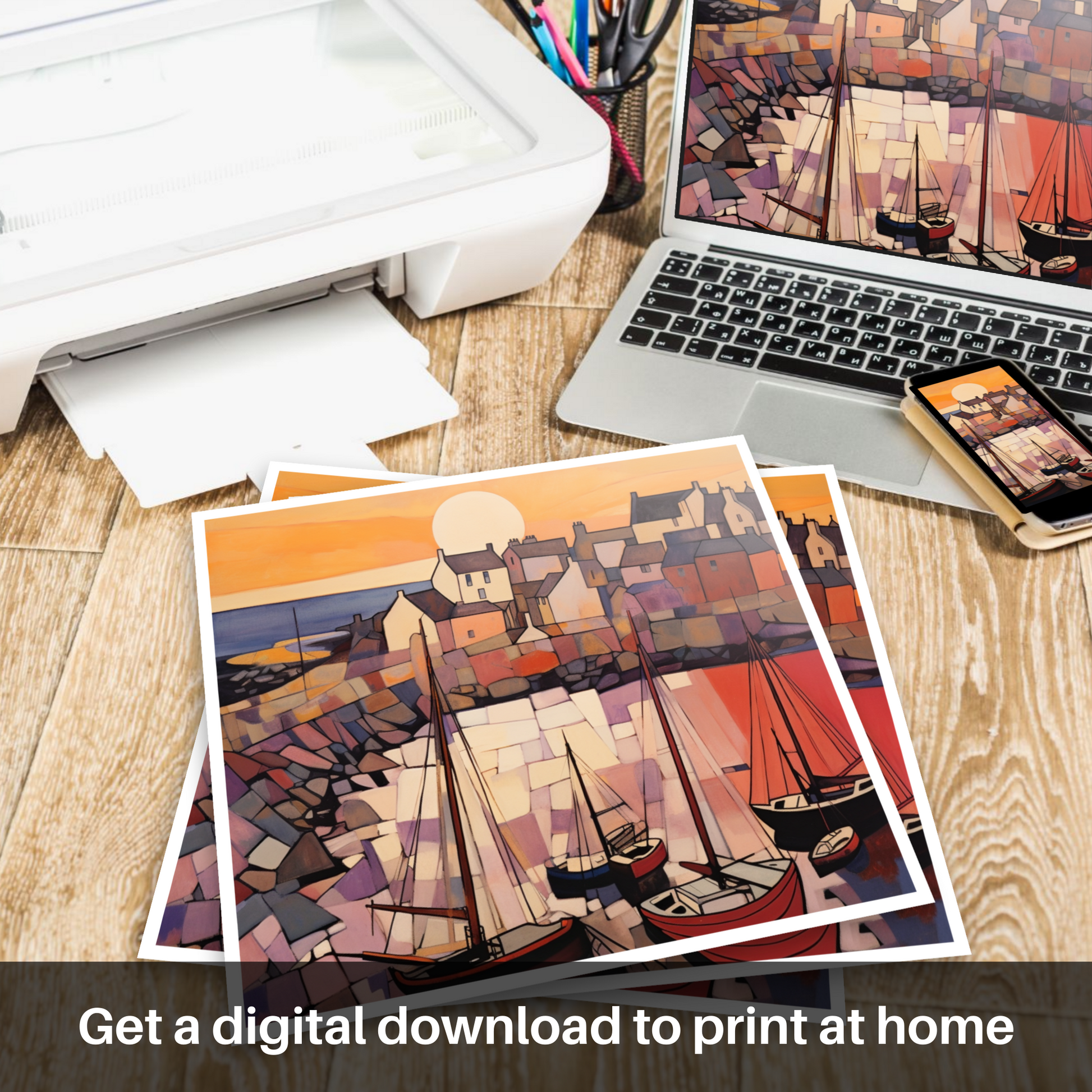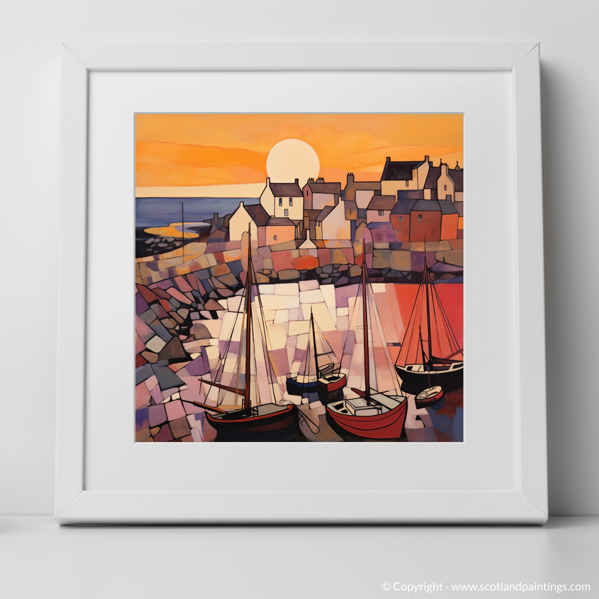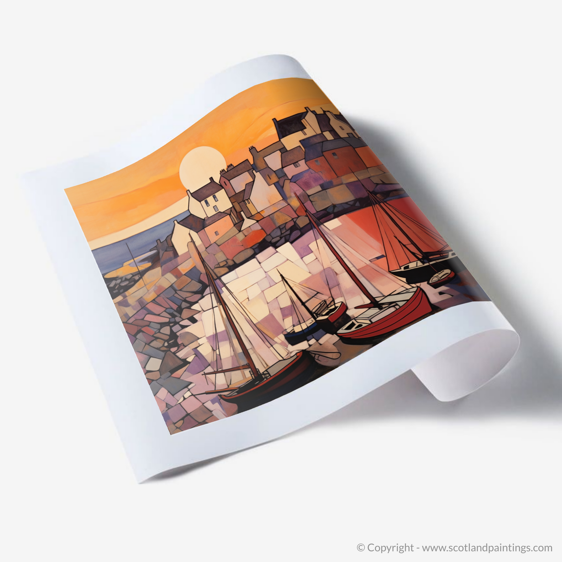 Immerse yourself in the geometric enchantment of Crail Harbour at the close of day with this inspired cubist interpretation of the picturesque Scottish scene. Angular forms and fragmented perspectives come together in a harmonious composition that reimagines the quaint coastal village and its maritime heritage.