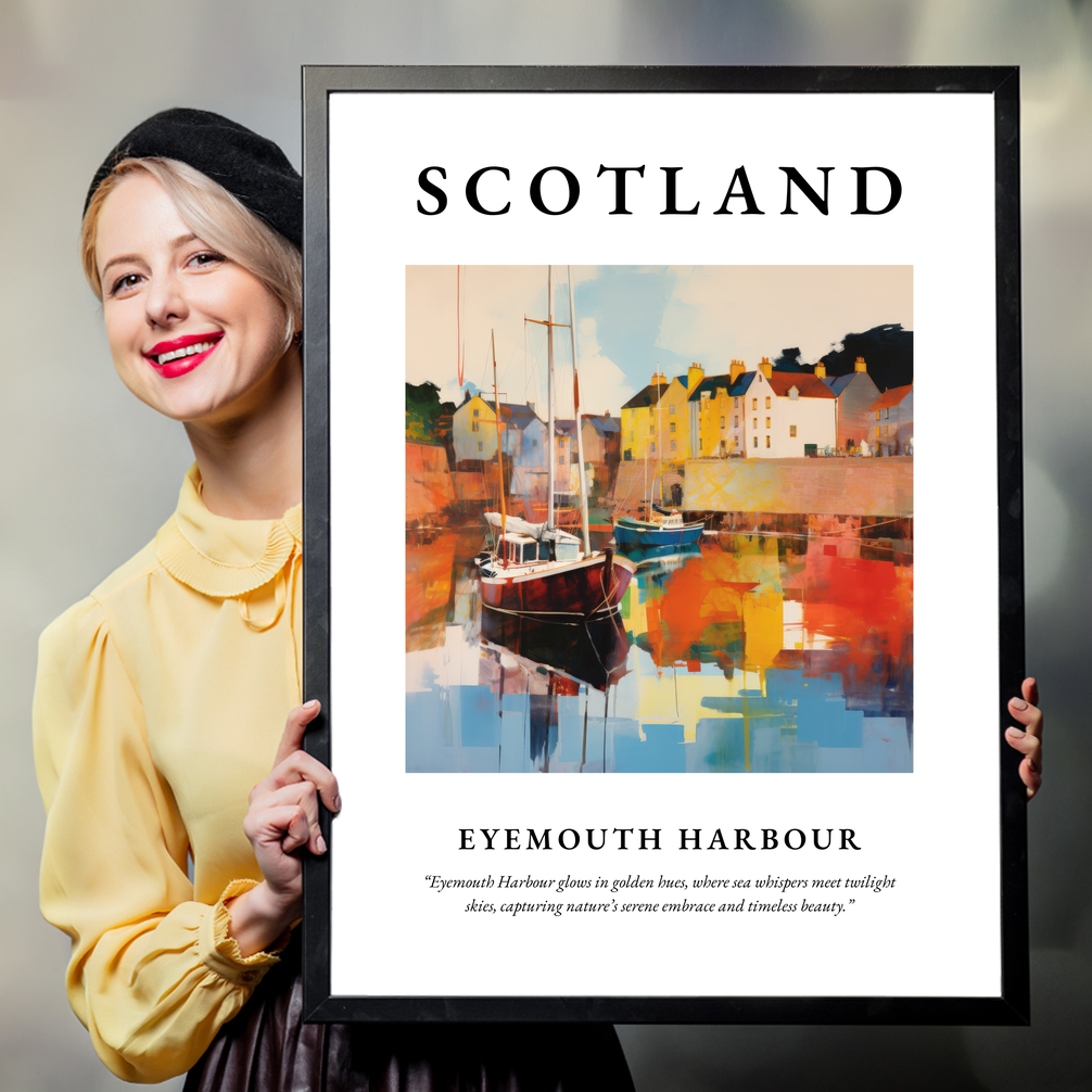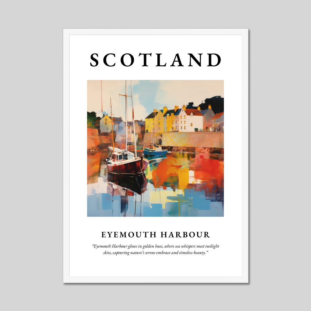At the top of the poster, “SCOTLAND” is boldly emblazoned, drawing immediate attention to the beauty below—a mesmerising “Color Field” style painting of Eyemouth Harbour. This artistic approach bathes the scene in expansive stretches of vibrant colours, conveying a sense of peaceful contemplation. The juxtaposition of the vivid harbour reflections and the soft glow of the setting sun creates an atmospheric harmony that is both modern and timeless. Beneath this vibrant scene, a poetic quote captures the ethereal magic of Eyemouth: “Eyemouth Harbour glows in golden hues, where sea whispers meet twilight skies, capturing nature’s serene embrace and timeless beauty.”
