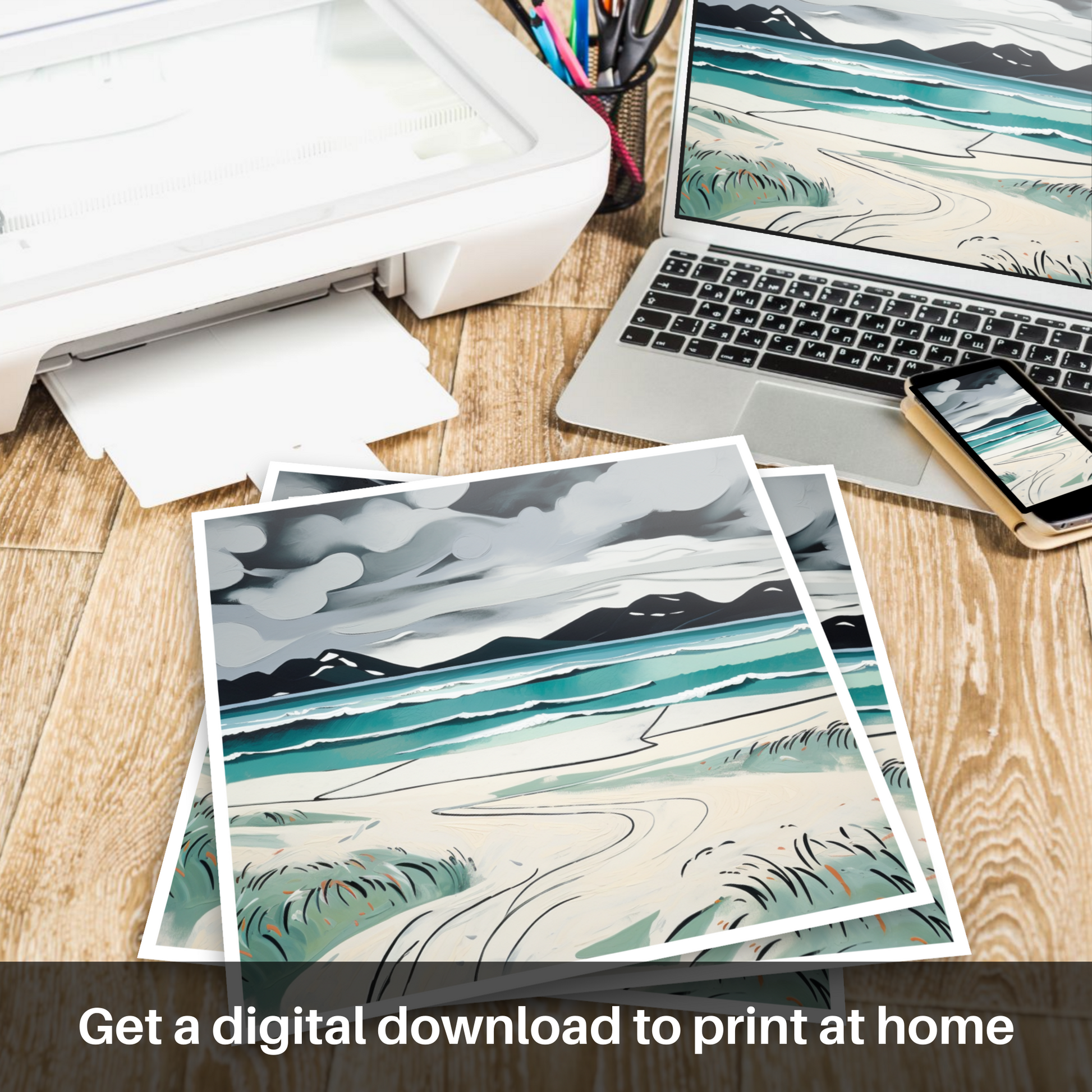 This striking print's celebration of simplistic form and enchanting colour encapsulates the rustic allure of Scottish beaches. It's a window to a world of elemental beauty and raw Scottish charm, a visual melody to stir the soul of anyone who yearns for a glimpse of the Highlands' rugged coastlines. Add it to your collection and let it transport you to a place where the air is crisp and the spirit of the wild whispers in every brushstroke.