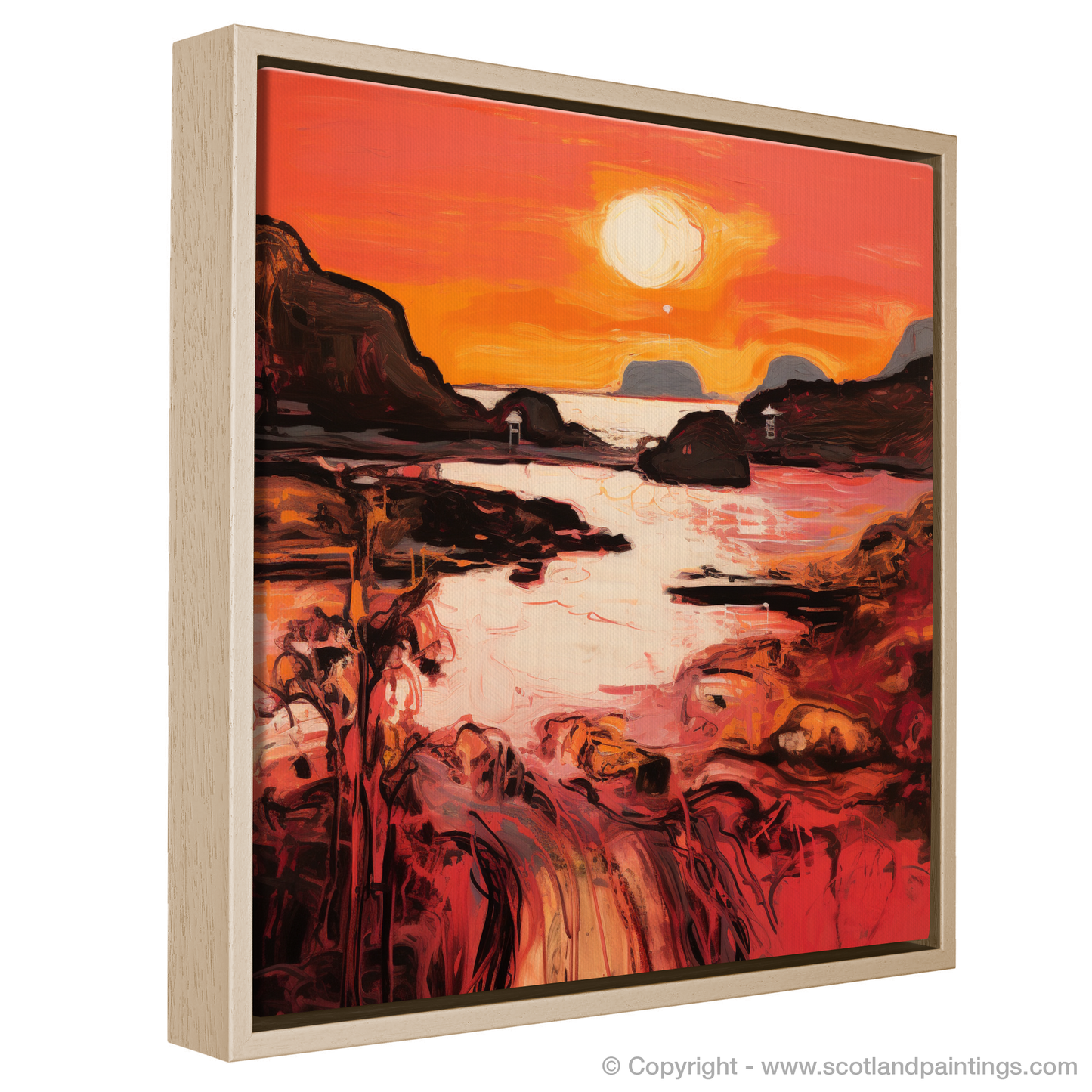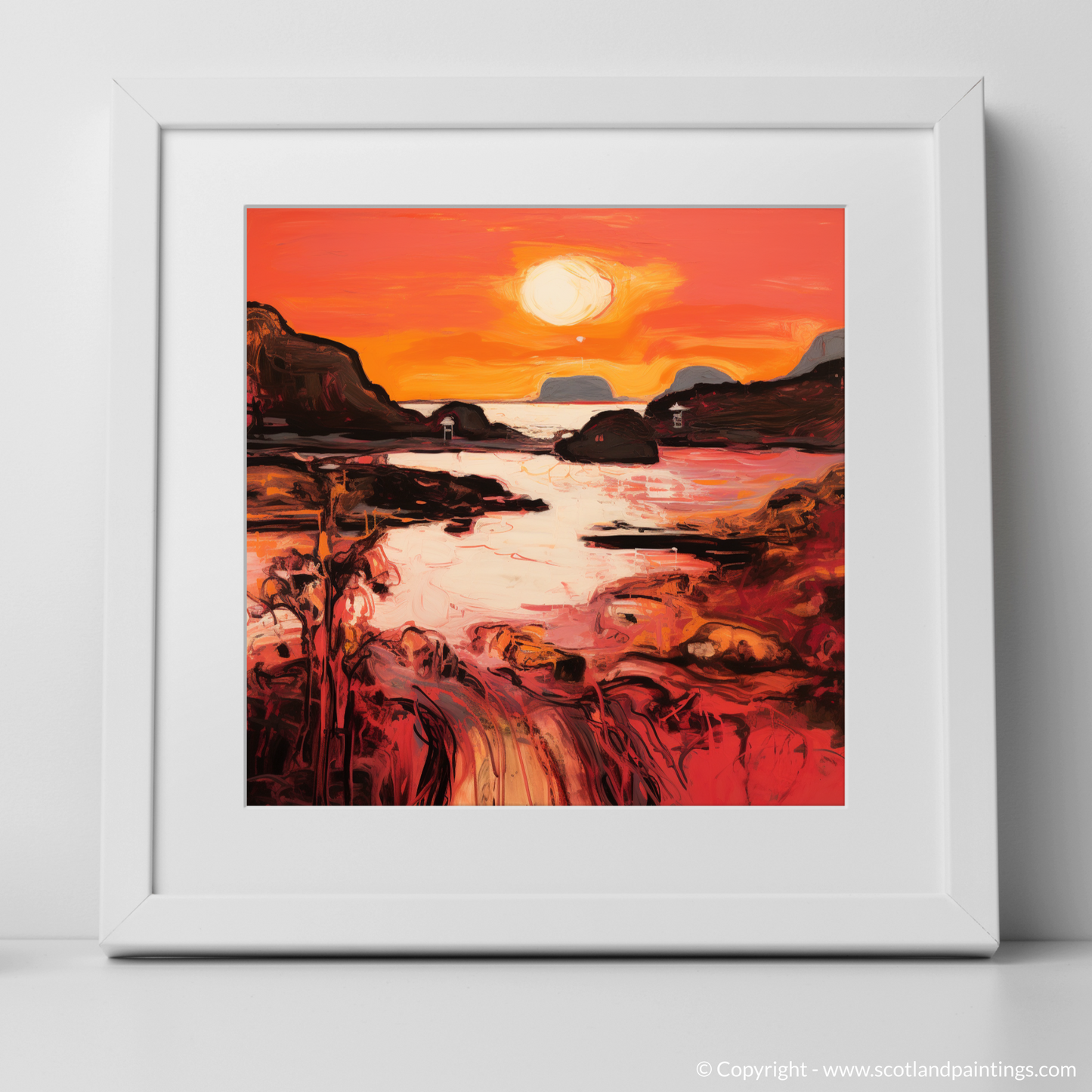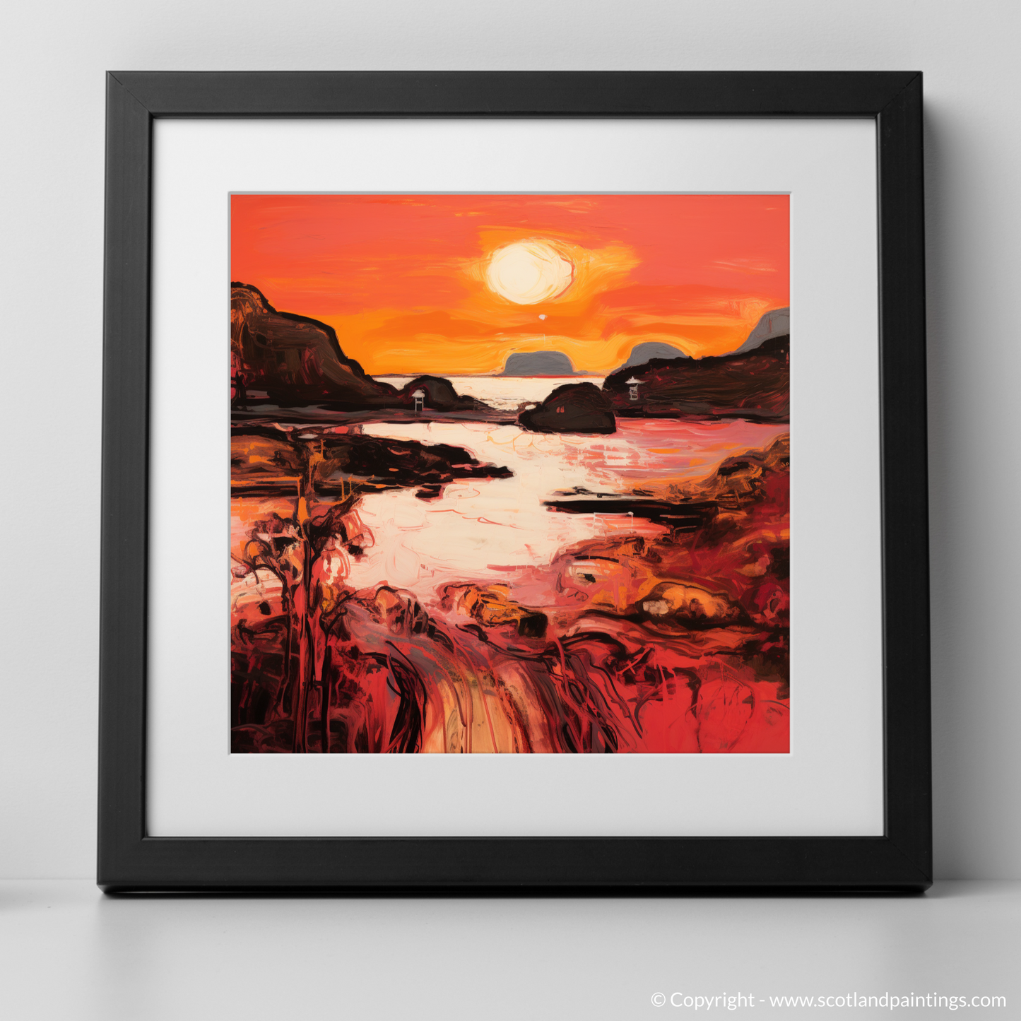 The canvas embraces a spectrum of fiery reds, deep oranges, and gentle pinks, setting ablaze the horizon as it cradles a fierce sun dipping into the cove's tranquil waters. Shades of crimson and scarlet weave through the rugged terrain, where wild foliage is rendered into a frenzied dance of colour and form. The black silhouettes of distant isles punctuate the seascape, standing as silent sentinels over this marine spectacle.