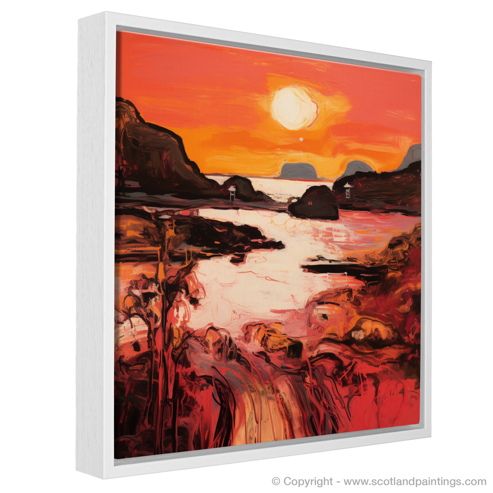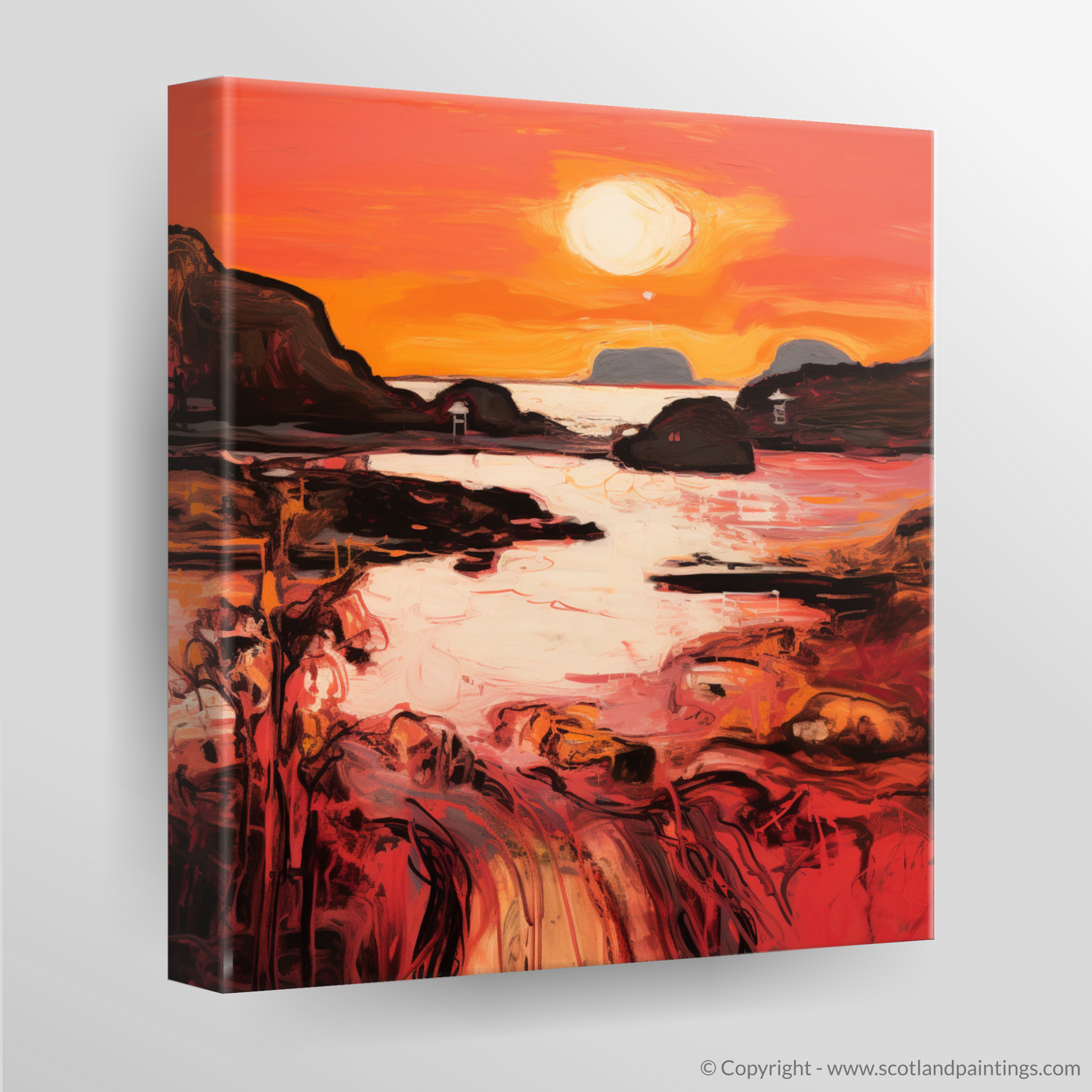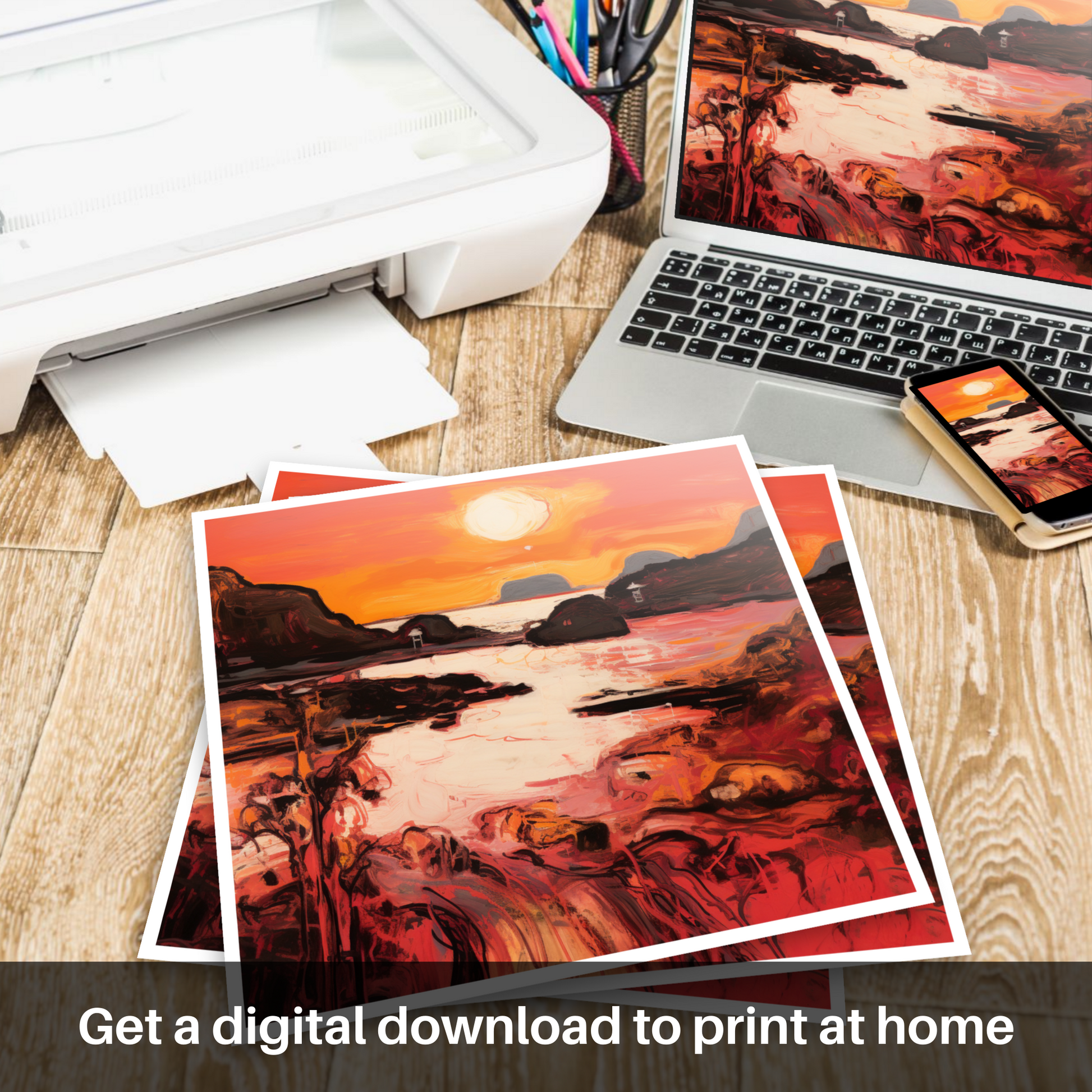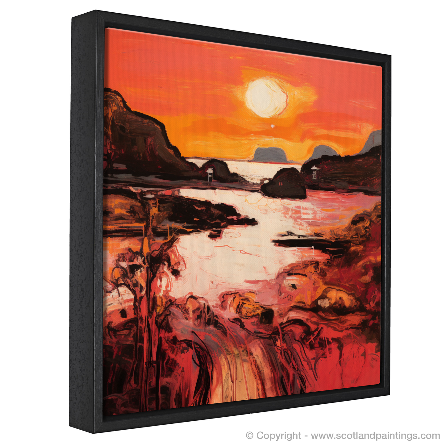 The canvas embraces a spectrum of fiery reds, deep oranges, and gentle pinks, setting ablaze the horizon as it cradles a fierce sun dipping into the cove's tranquil waters. Shades of crimson and scarlet weave through the rugged terrain, where wild foliage is rendered into a frenzied dance of colour and form. The black silhouettes of distant isles punctuate the seascape, standing as silent sentinels over this marine spectacle.