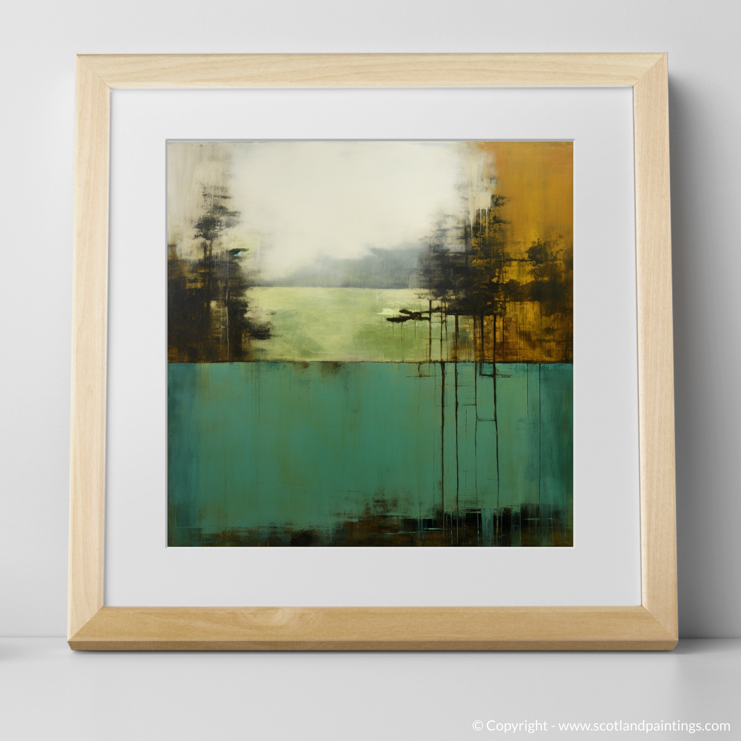 The print features a stunning blend of colours, where earthy umbers and golden ochres converge with misty whites and calming turquoise. The composition cleverly plays with vertical and horizontal strokes, suggesting both the grandeur of towering trees and the gentle horizontality of the forest's undergrowth.