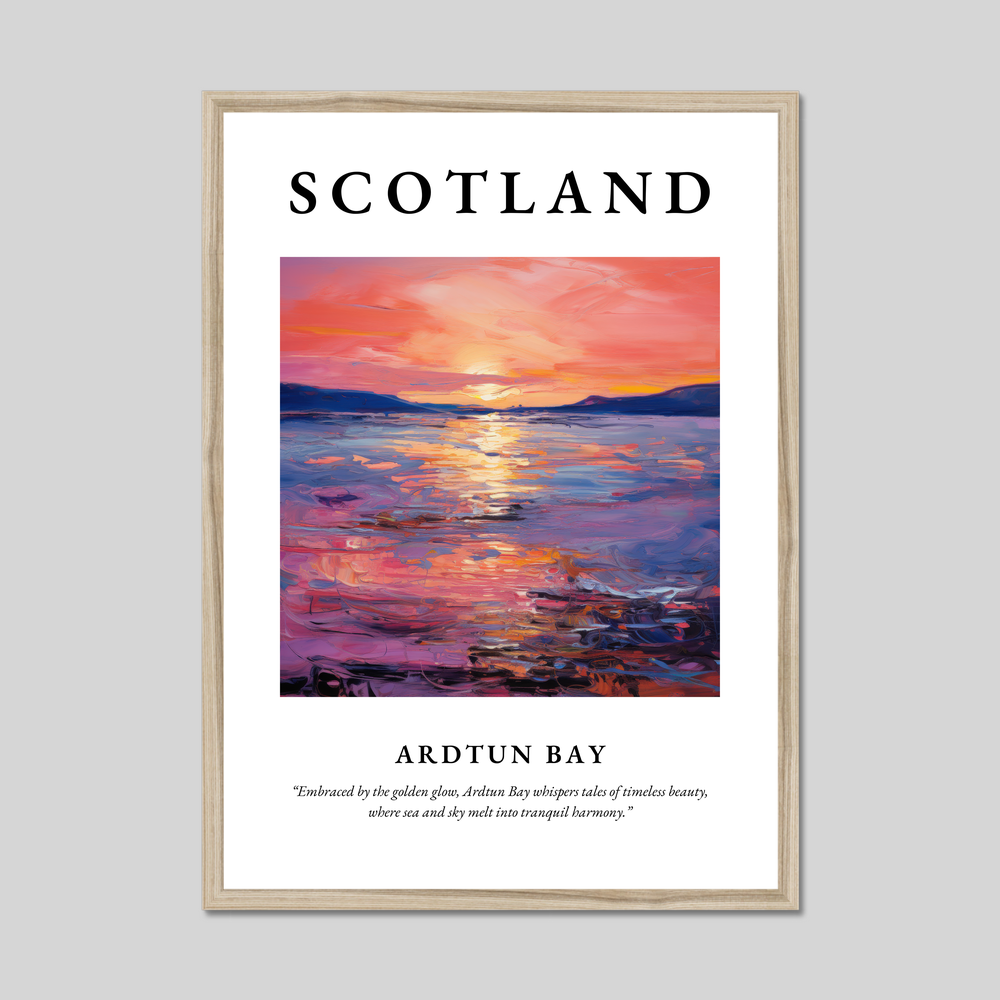Transform your living space with our stunning framed poster print, measuring an impressive 50cm x 70cm—ideal for covering a large wall area without straining your budget. Choose from sleek black, pristine white, or a warm natural wood-effect frame to perfectly complement your decor. The bold word “SCOTLAND” commands attention at the top, capturing the essence of this enchanting region. Below, you'll find an abstract depiction of Ardtun Bay, captivated in a medley of vibrant colours that speaks to both art lovers and those with a personal connection to this magical place.