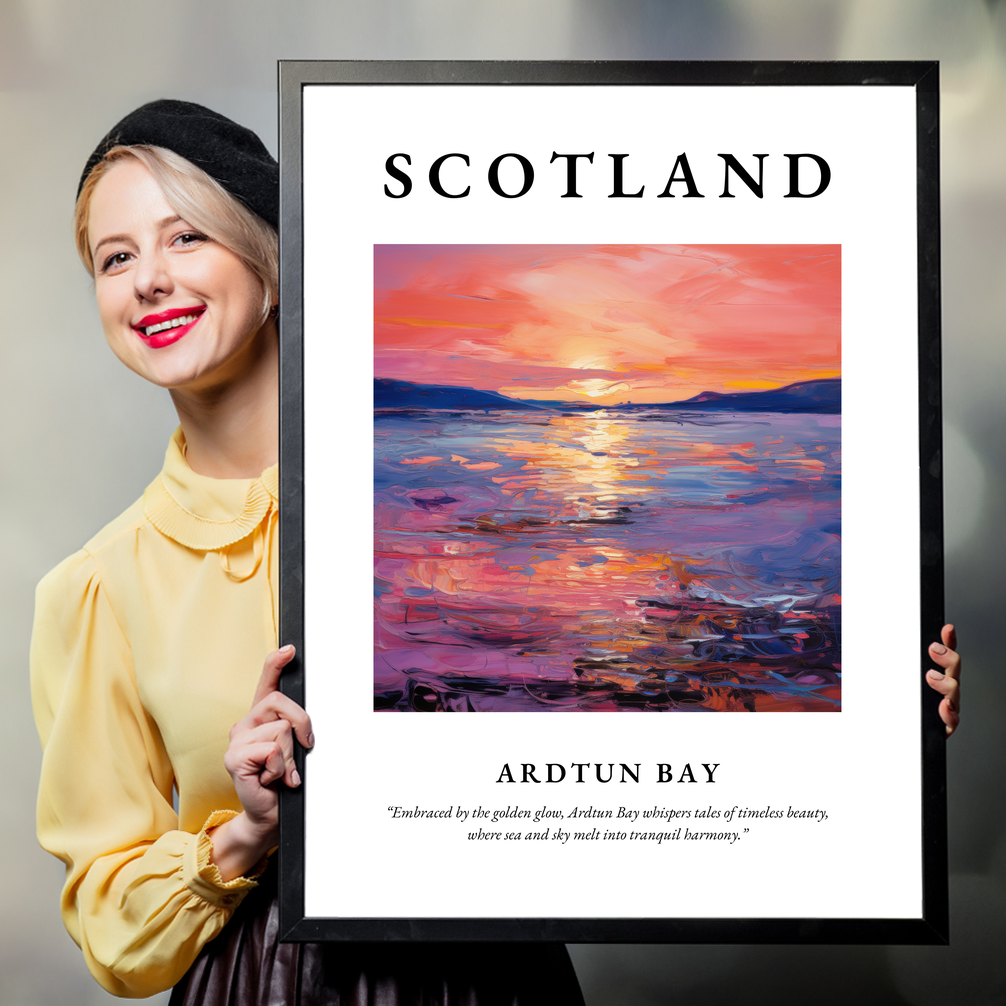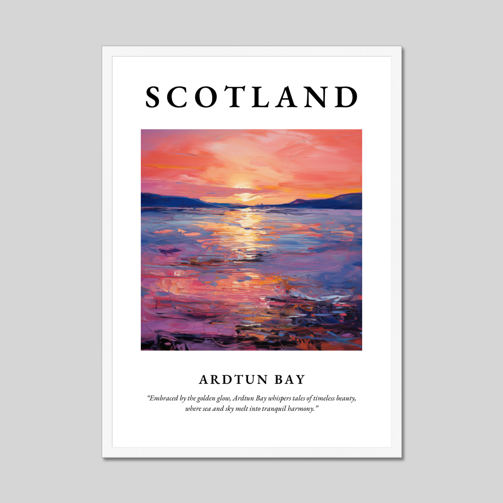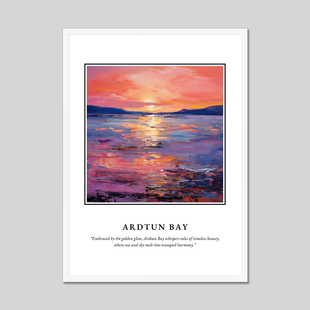 The abstract art style invites the viewer’s imagination to wander through the swirling mingles of sky and sea, painted in hues of fiery oranges and soothing purples. An ethereal glow stretches across the water's surface, echoing the gentle serenity of nature’s own masterpiece. Beneath the painting, the words “Embraced by the golden glow, Ardtun Bay whispers tales of timeless beauty, where sea and sky melt into tranquil harmony” capture the soul of this breathtaking scene, drawing admirers into a world of calm and reflection.