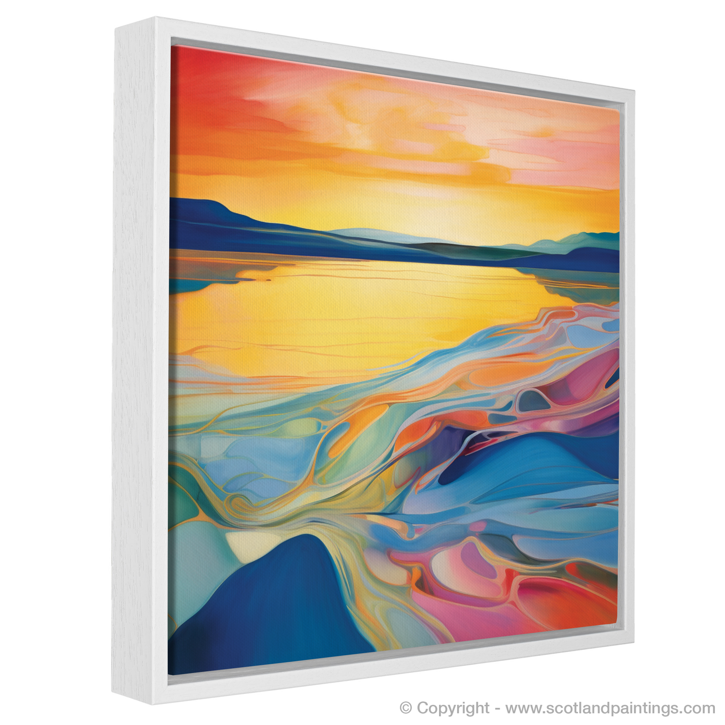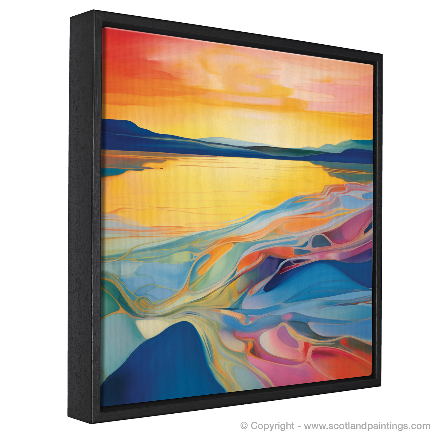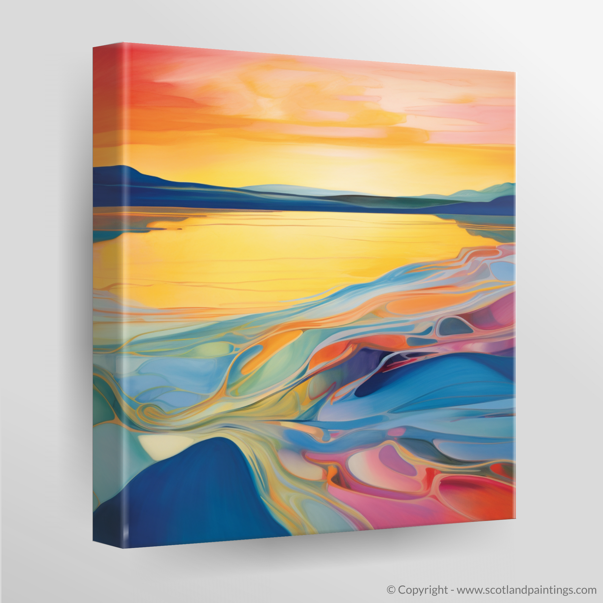 Dominated by a resplendent palette of sunset oranges, fiery reds, and deep purples that bleed into the cooler tones of dusky blues and sea greens, the artwork echoes the serene majesty of the bay at its most magical hour. The unbounded swathes of colour bleed and merge into one another, creating an almost dreamlike vista that invites contemplation and calm.