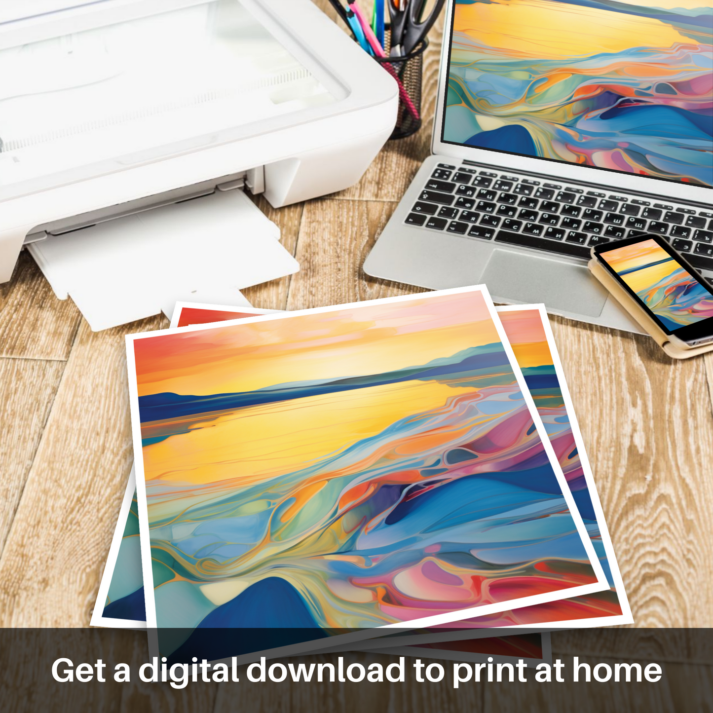 The print offers viewers a contemporary interpretation of the landscape, where the traditional boundaries and details dissolve into an emotive synthesis of colour. The gentle ebb and flow of the water is suggested through fluid and organic shapes, leading the eye to an unspoken dance between light and reflection.
