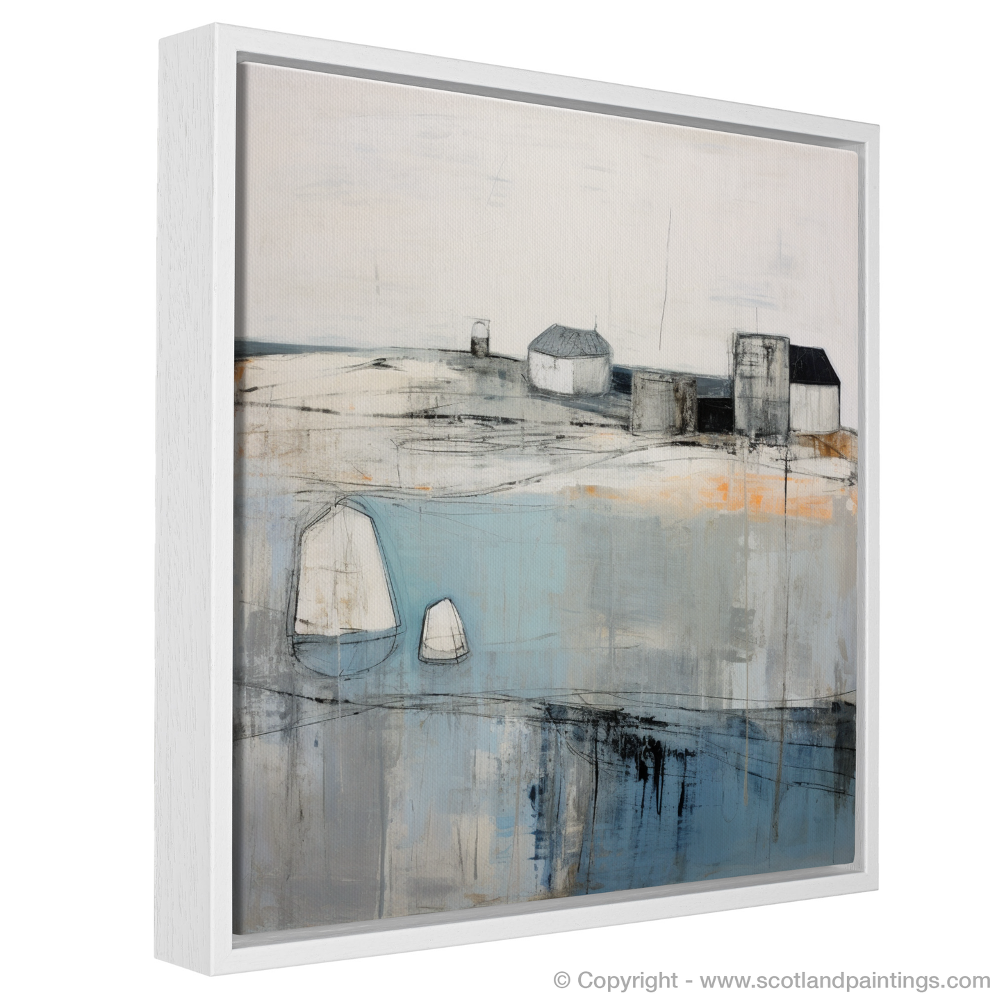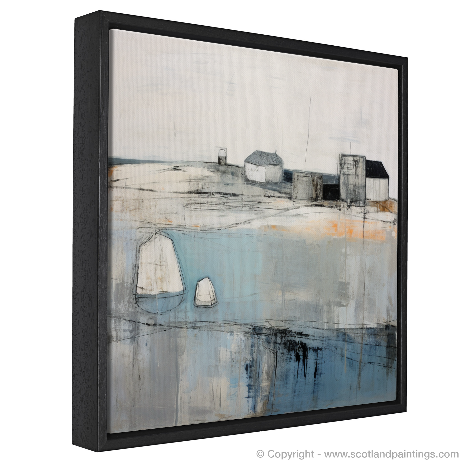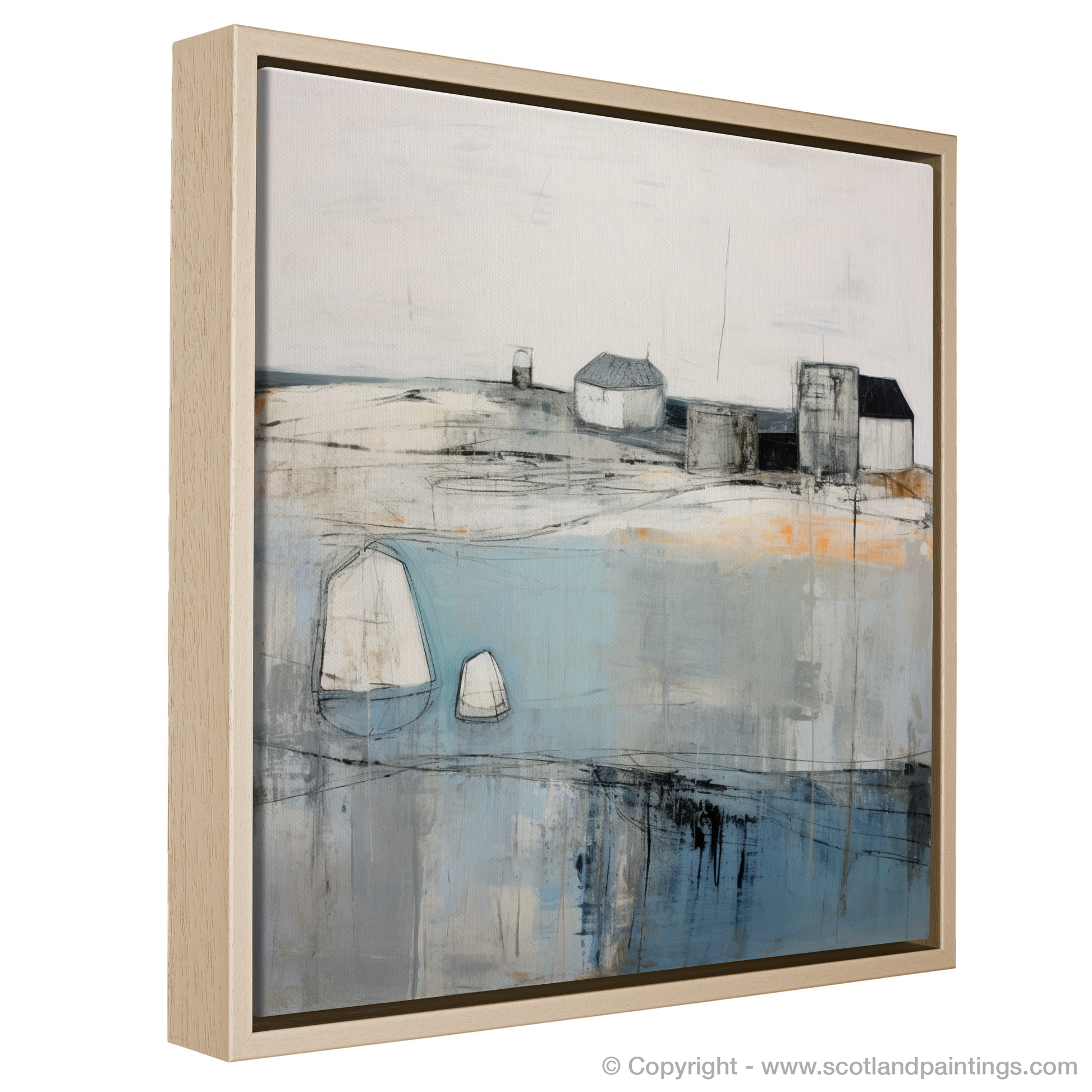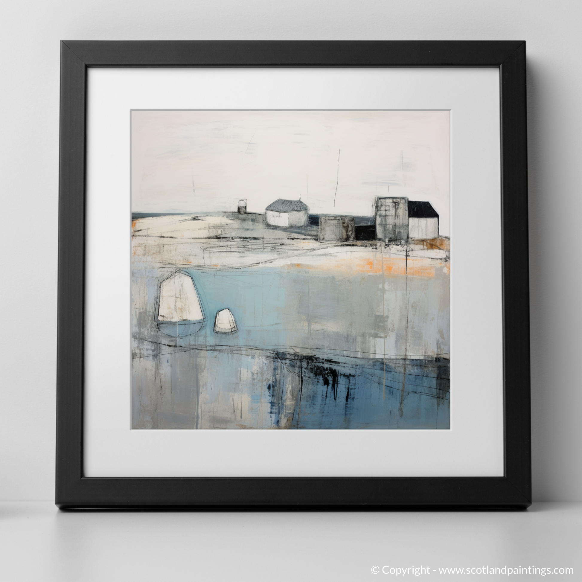Imbued with serene minimalistic elegance, this evocative print captures the quiet splendour of Portmahomack Harbour in Easter Ross. The composition, characterized by its simplicity and subtle complexity, invites the viewer to a tranquil waterfront, where the horizon melds sea and sky into a harmonious expanse. Strokes of muted blues and earth-toned hues suggest the reflective surface of water, cool and calm under the Scottish sky.