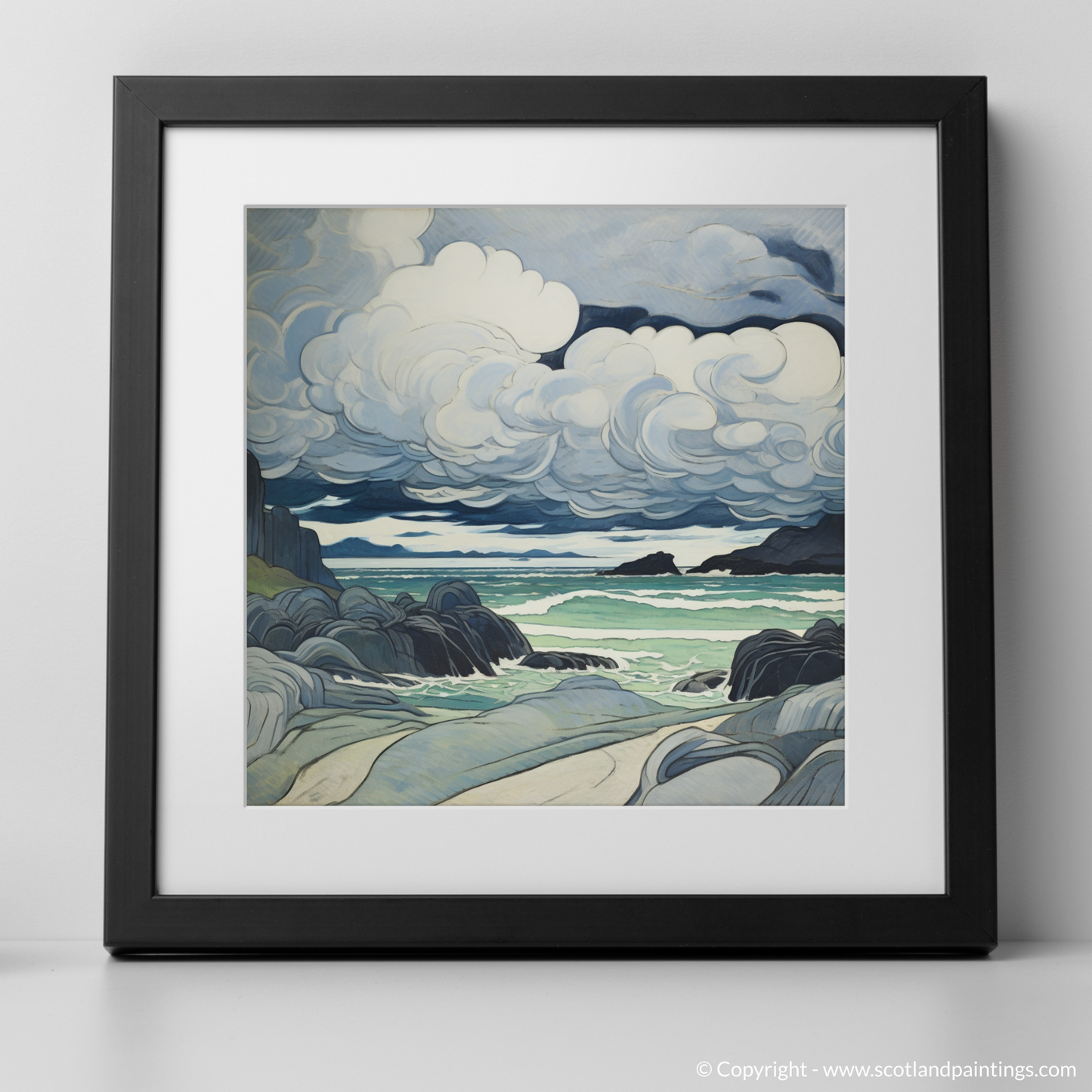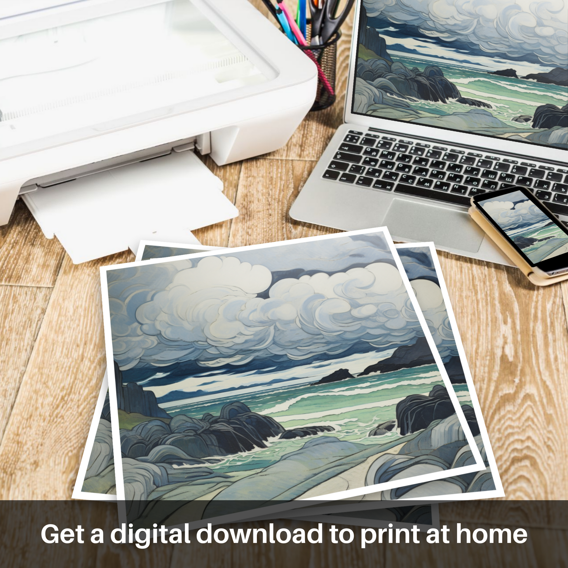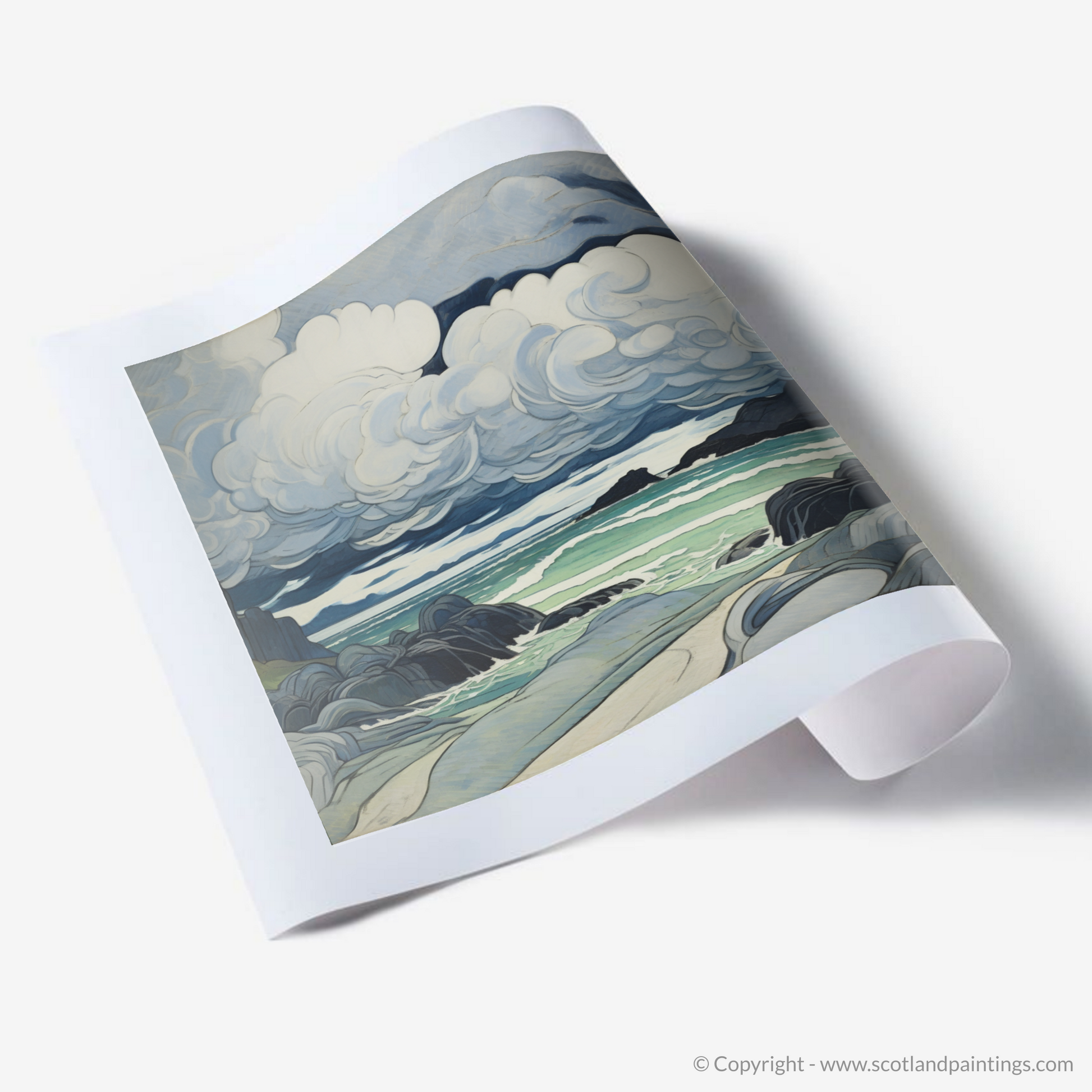 Swept away into the tempest-tossed beauty of Scotland's natural grandeur, this evocative print captures the tumultuous yet awe-inspiring essence of Ardtun Bay under the spell of a brewing storm. The swirling clouds dash across the sky with dynamic curves and whorls, artfully rendered in shades resonant of impending rain, shadowing the world beneath in a cool, dramatic light.