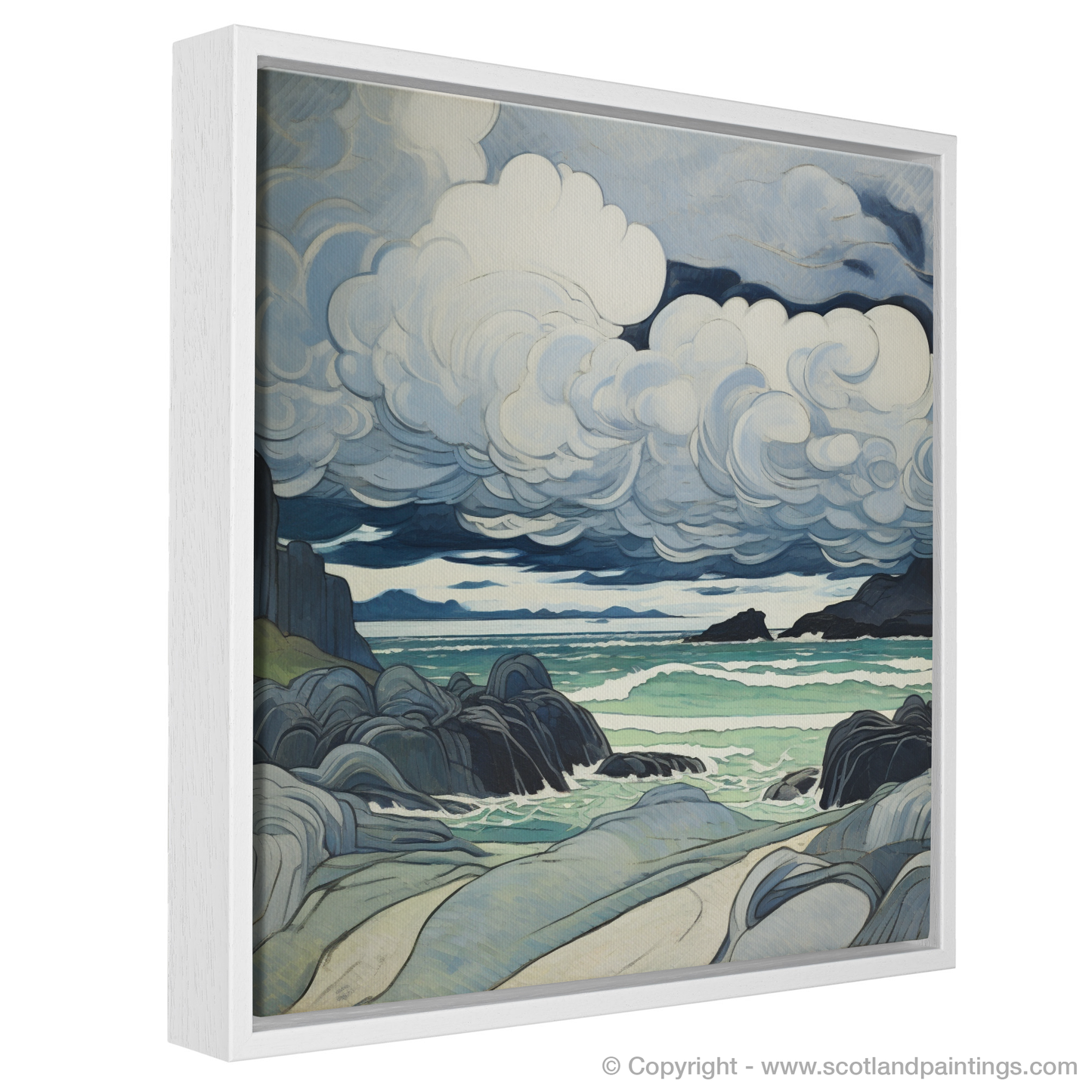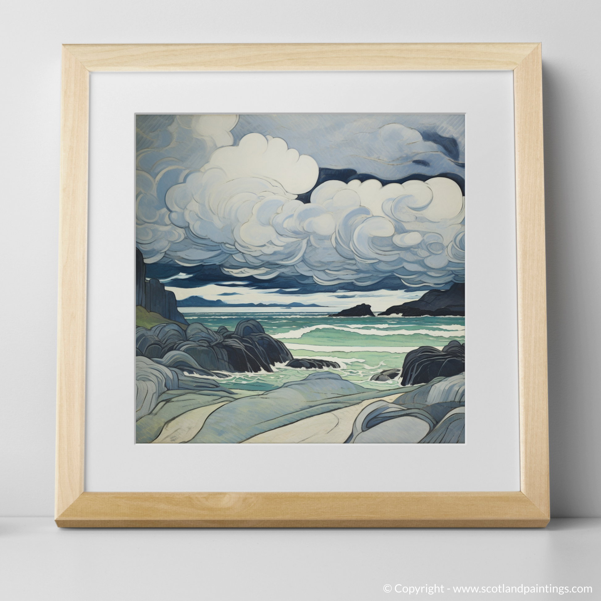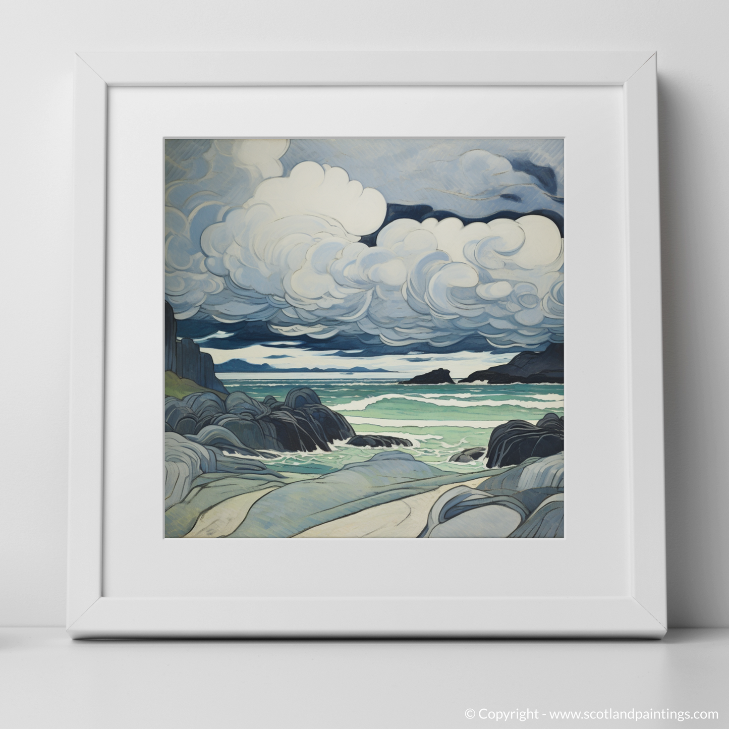 Swept away into the tempest-tossed beauty of Scotland's natural grandeur, this evocative print captures the tumultuous yet awe-inspiring essence of Ardtun Bay under the spell of a brewing storm. The swirling clouds dash across the sky with dynamic curves and whorls, artfully rendered in shades resonant of impending rain, shadowing the world beneath in a cool, dramatic light.
