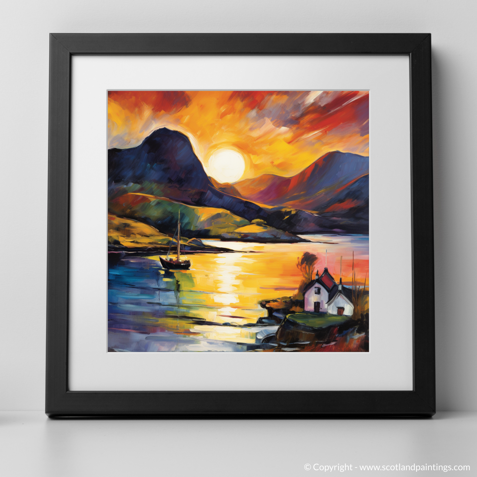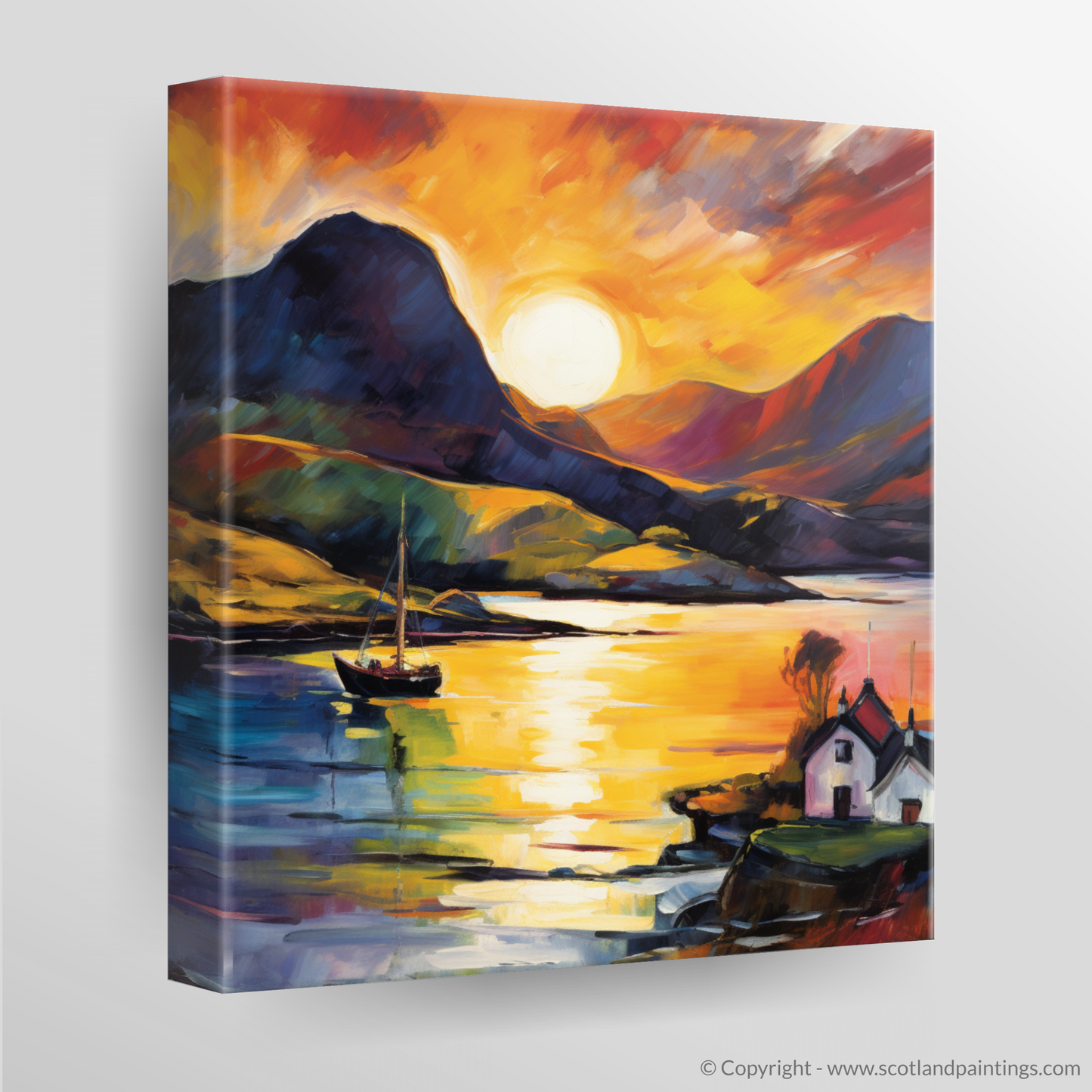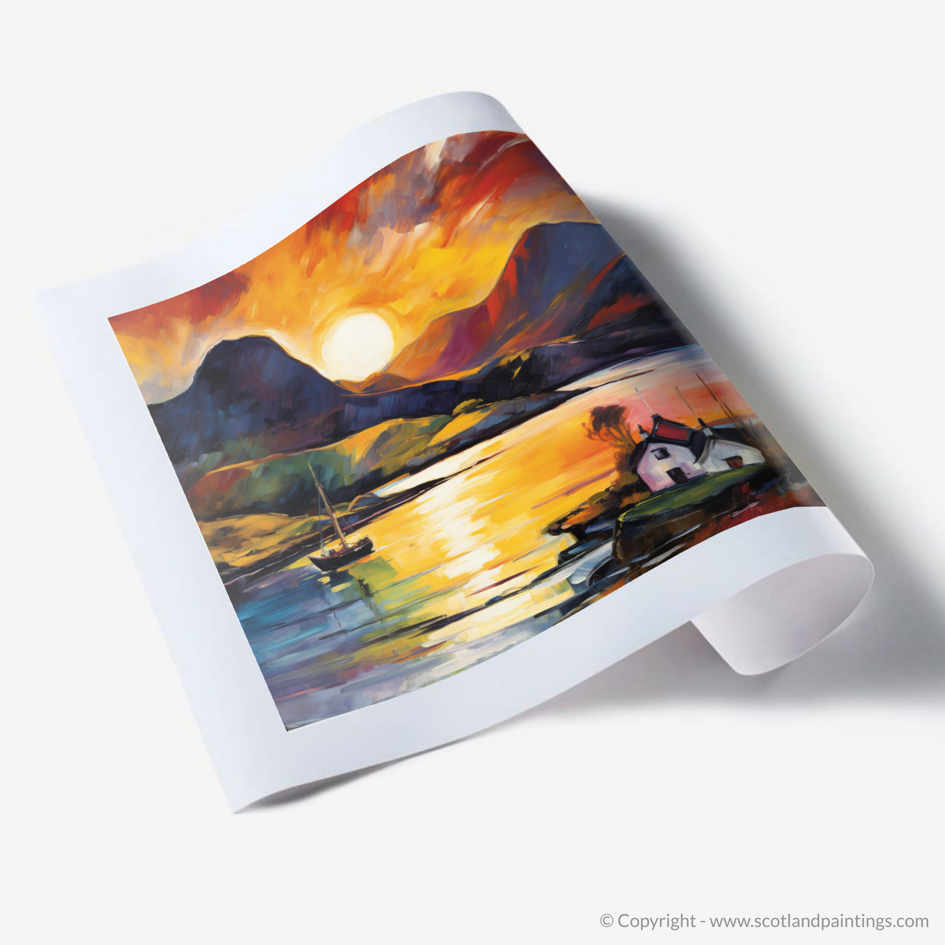 Immerse yourself in the vibrant ecstasy of Scottish coasts with this visually arresting rendition of Shieldaig Bay at the day's end. The setting sun dips below the horizon, unleashing a blaze of colours that defy nature's palette, capturing the essence of Fauvism in every stroke. Vivid oranges, passionate reds, and deep purples blend seamlessly into a symphony of colour that reflects both in the sky and on the calm waters below.