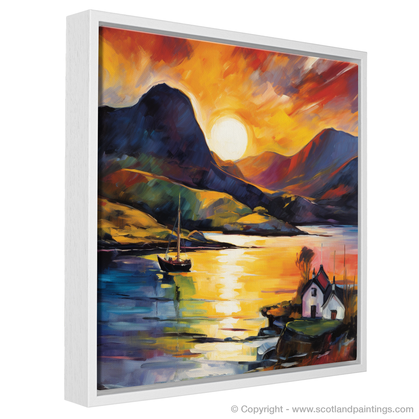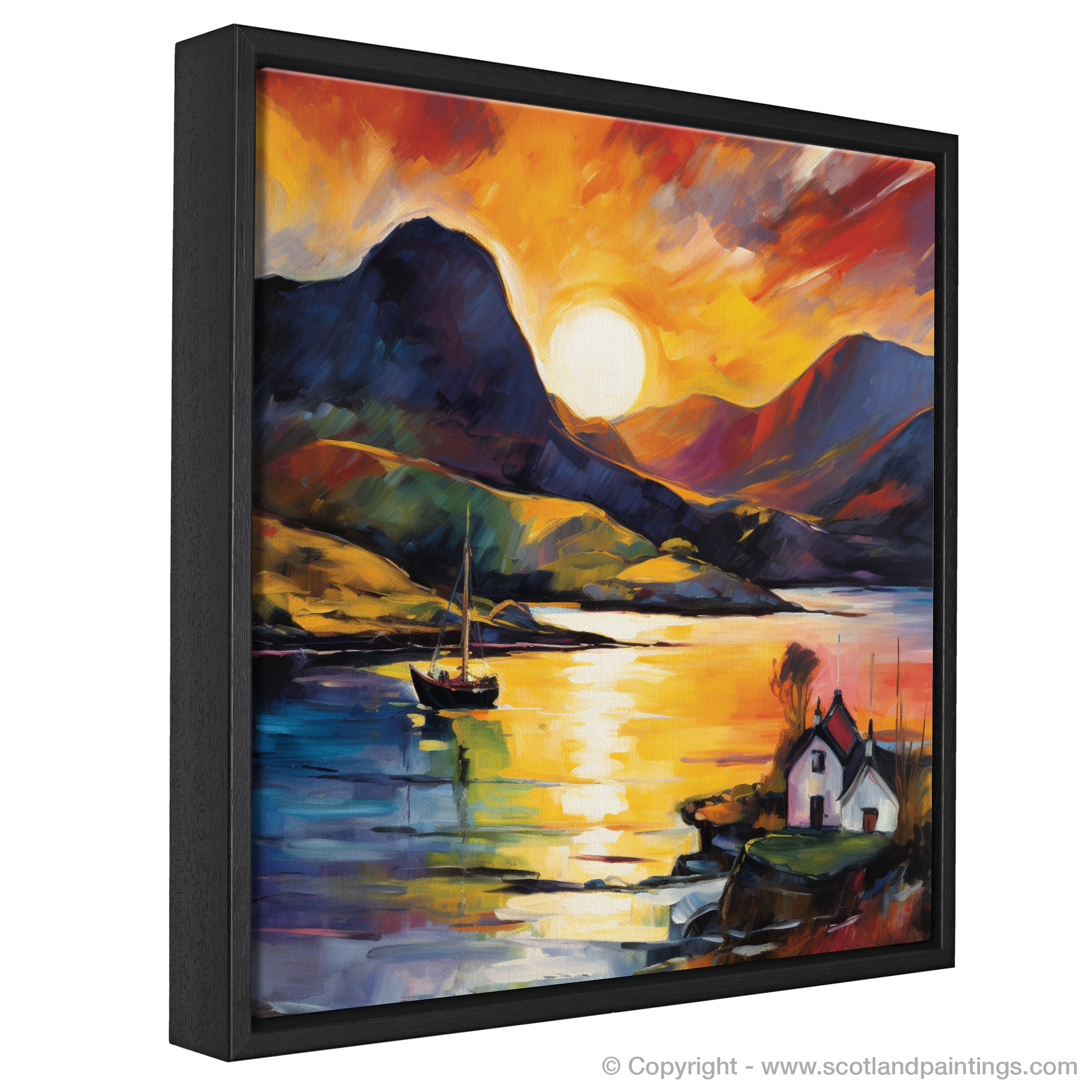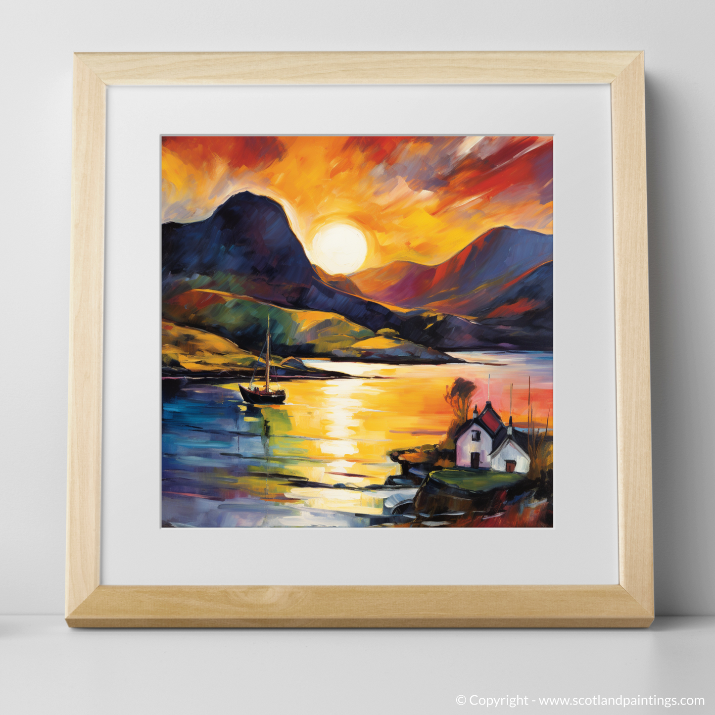 Immerse yourself in the vibrant ecstasy of Scottish coasts with this visually arresting rendition of Shieldaig Bay at the day's end. The setting sun dips below the horizon, unleashing a blaze of colours that defy nature's palette, capturing the essence of Fauvism in every stroke. Vivid oranges, passionate reds, and deep purples blend seamlessly into a symphony of colour that reflects both in the sky and on the calm waters below.