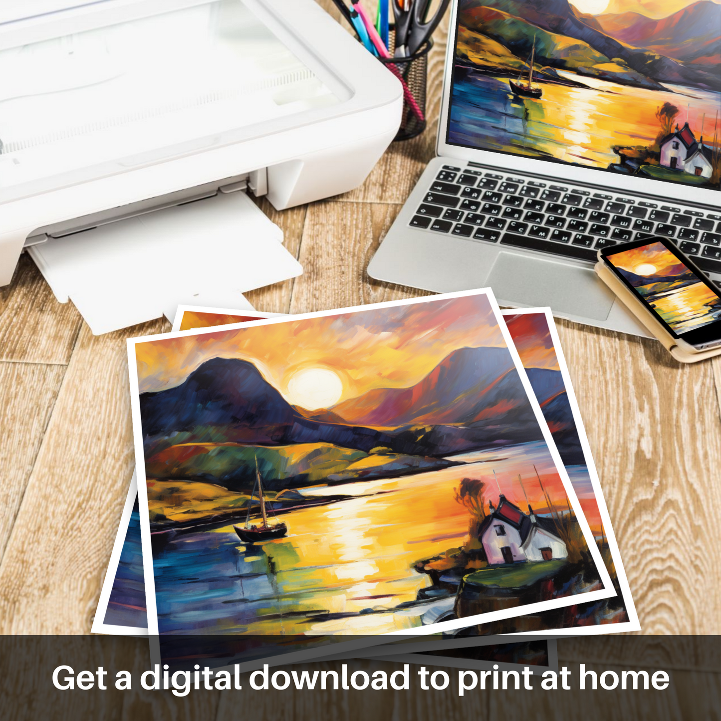 Perfect for aficionados of bold art and lovers of the Scottish outdoors, this print serves as a rich, emotive addition to any collection that yearns for a touch of the dramatic and the serene. Add this piece to your space and let the untamed beauty of Shieldaig Bay at sunset wash over you, as it has done for centuries, unbridled and utterly breathtaking.