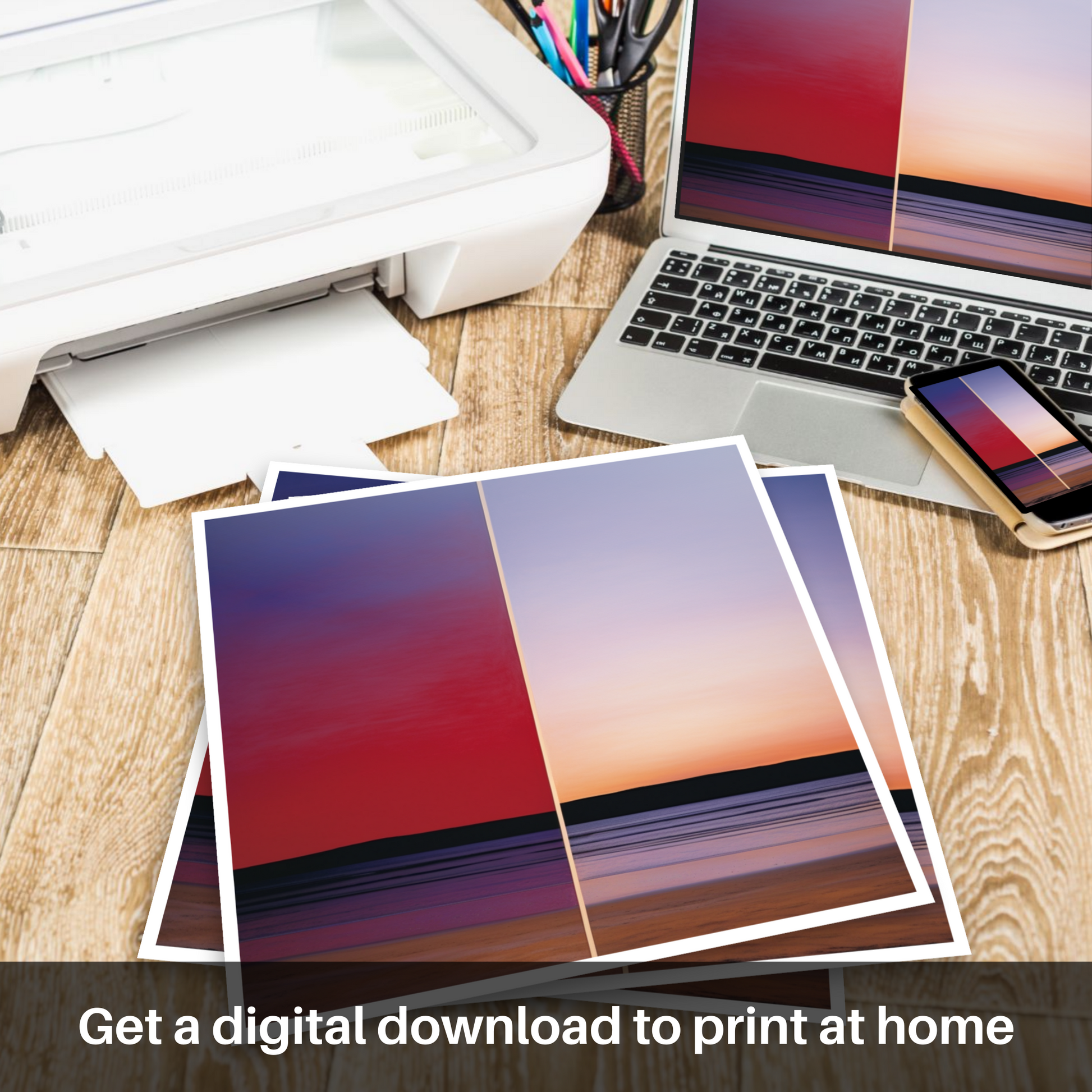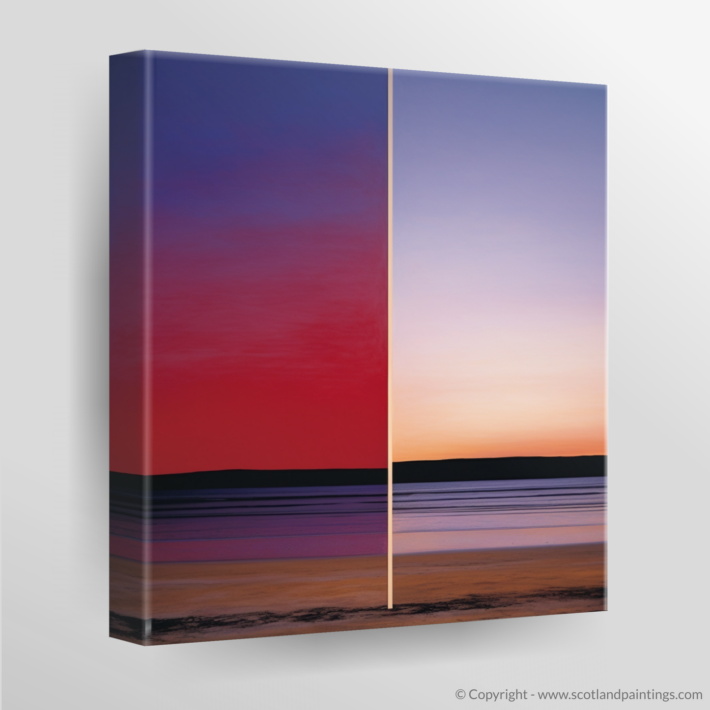 The artwork is split into two distinct halves, each telling a part of the cove's story. On the left, you'll find a deep gradient of reds and blues, mingling seamlessly to suggest the reflection of the setting sun's last embrace. This abstract representation of the sky mesmerises with its meditative quality and subtle transition from the heat of deep crimson above to the cool indigo that meets the horizon.