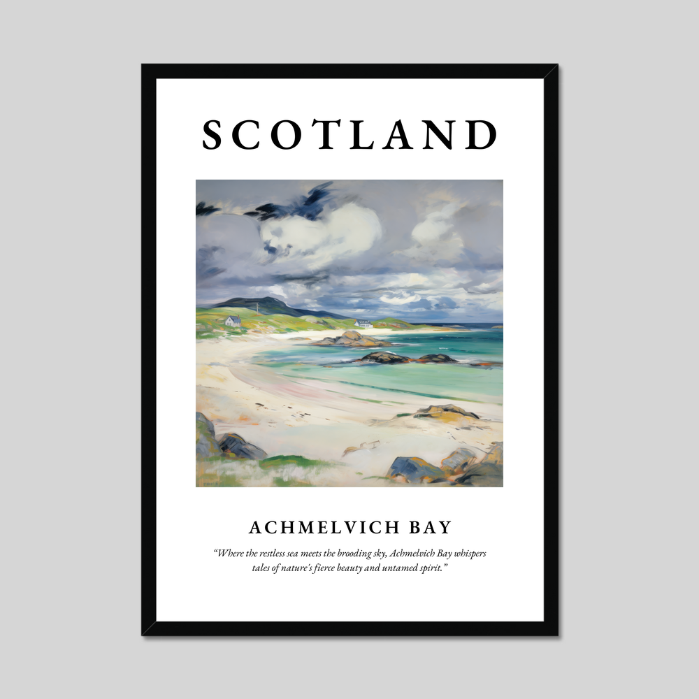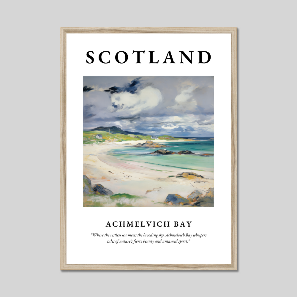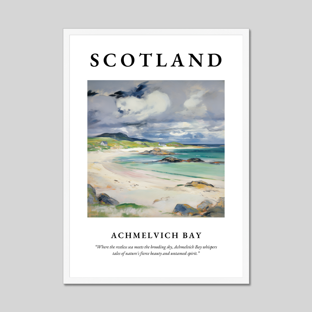 Available in your choice of black, white, or natural wood-effect frames, this poster is an aesthetic delight, designed to complement any interior style effortlessly. It features the bold word “SCOTLAND” at the top, immediately drawing attention and setting the stage for the masterpiece below. The painting of Achmelvich Bay, rendered in exquisite Impressionist style, captures the movement and mood of this idyllic coastal cove. Its vibrant brushstrokes depict the interplay of light and shadow, as the restless sea meets a brooding sky, echoing the untamed spirit of nature. Beneath the evocative image, the quote “Where the restless sea meets the brooding sky, Achmelvich Bay whispers tales of nature's fierce beauty and untamed spirit” adds depth and allure, making this more than just decorative art—it’s a conversation piece.