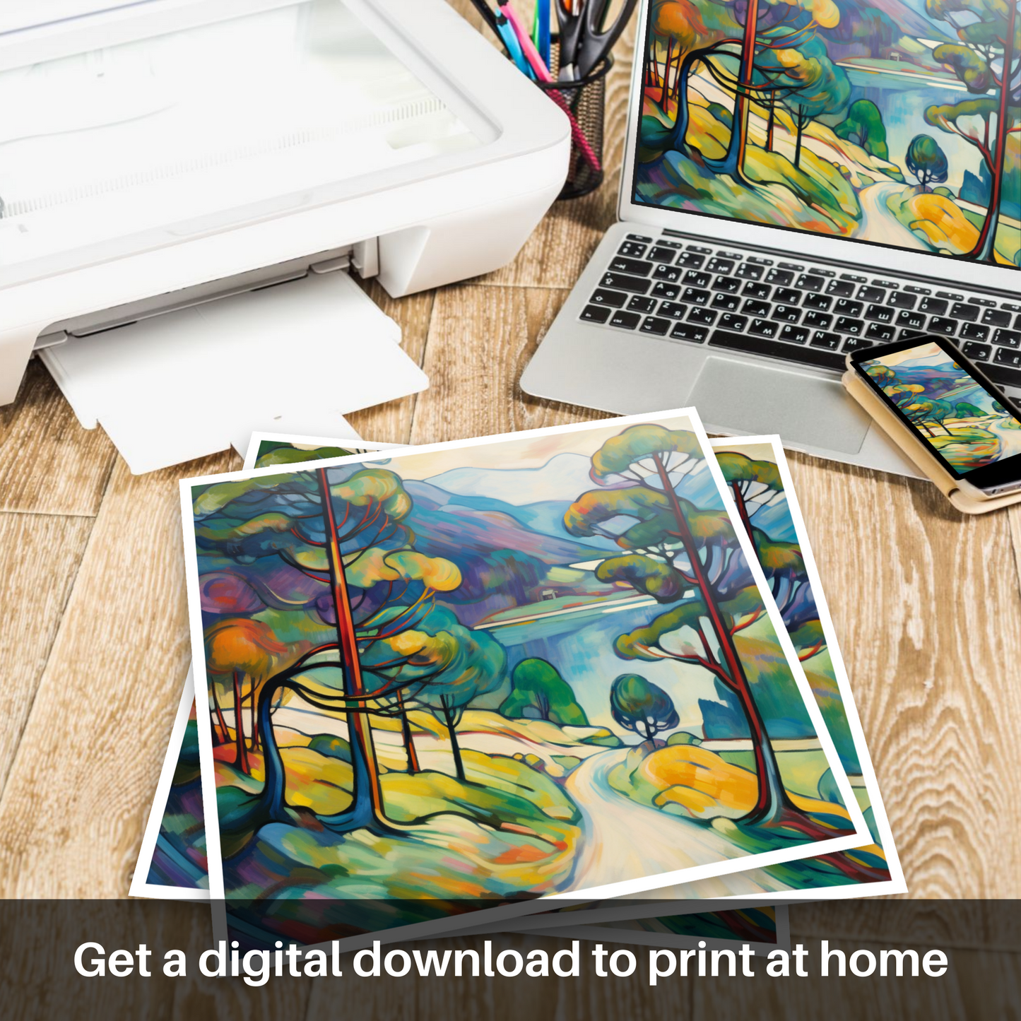 Immerse yourself in the vivid hues and dynamic contours of our abstract interpretation inspired by the enchanting Loch Katrine Forest, a mesmerising component of the Scottish Forests collection. This exquisite print beckons you into a kaleidoscope where nature meets imagination, rendering the raw beauty of Loch Lomond's woodlands through a vibrant colour palette and sweeping brushstrokes that dance on the canvas.