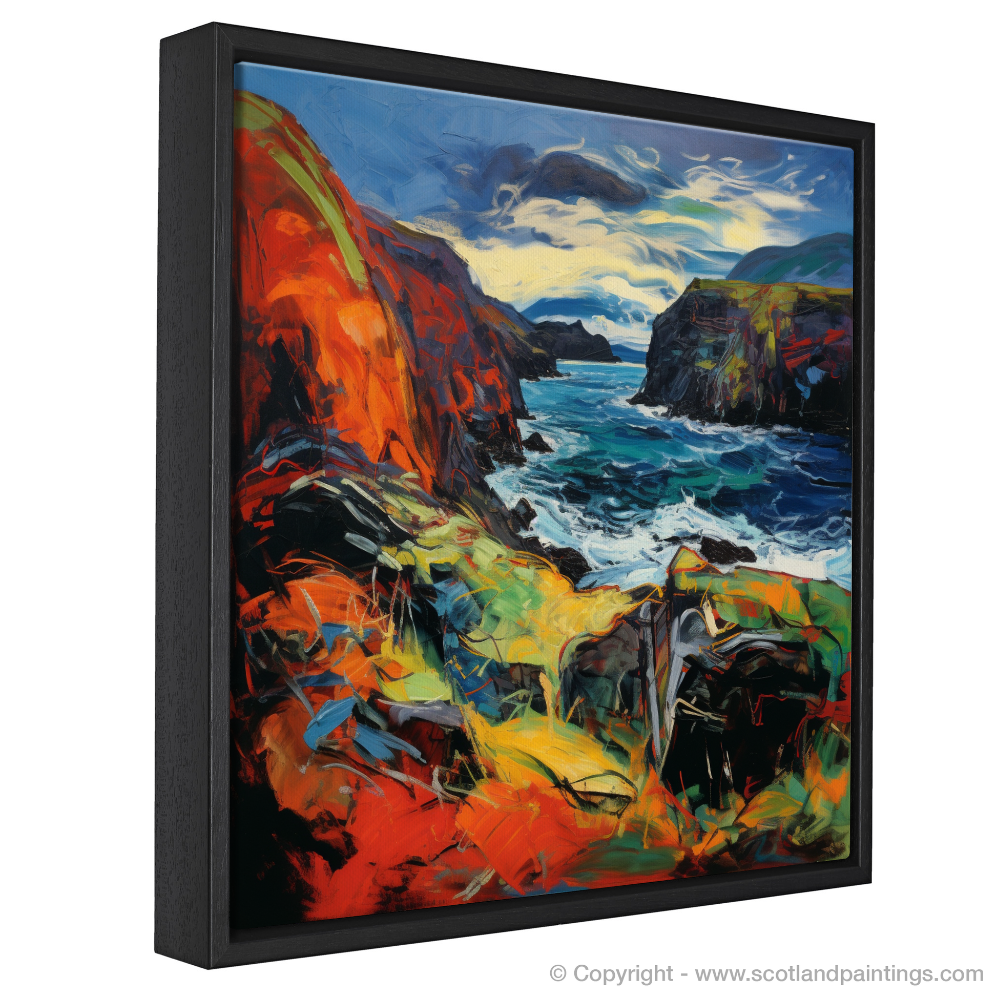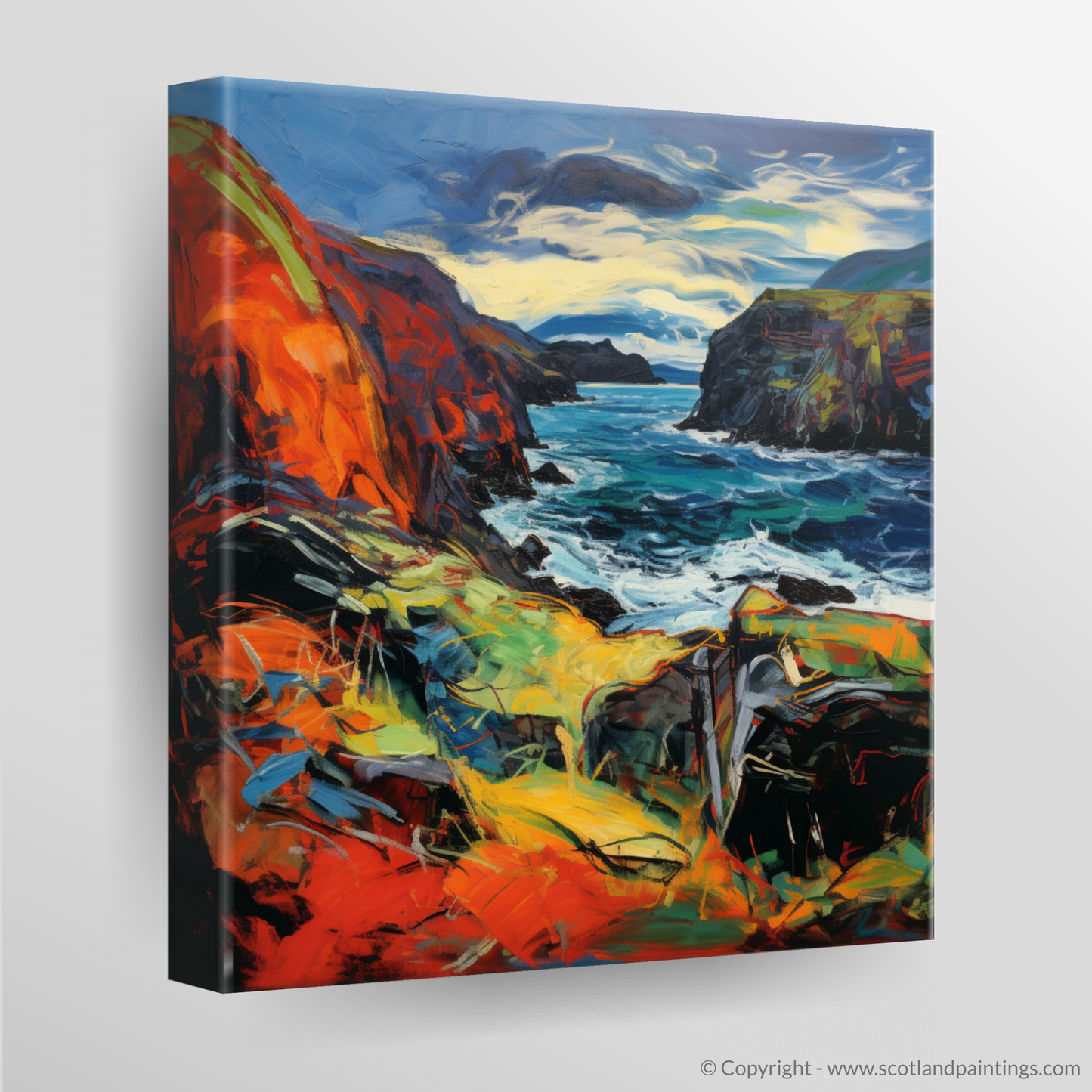 The dramatic cliffs of Ulva, rendered in fiery shades of scarlet and burnt orange, contrast starkly with the mesmerising deep blues and turquoises that swirl through the churning sea. This interplay of warm and cool colours creates a dynamic tension, a visual representation of the island's rugged and elemental character.