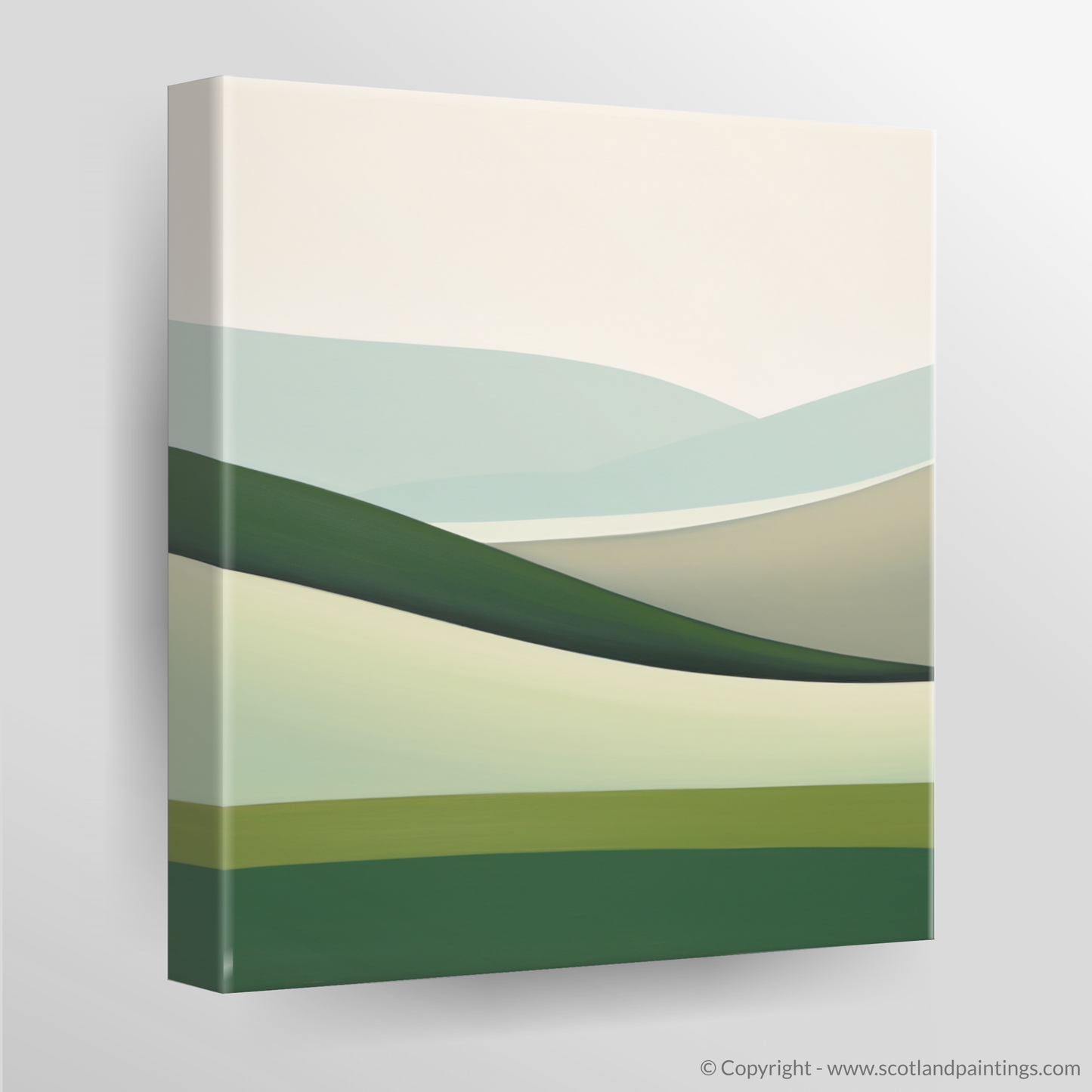 Swathes of muted greens blend harmoniously with soft greys, creating a picture of gently rolling hills and distant mountains that whisper of the ancient spirit of the land. The interplay of light and dark hues conjures the alternating depth and openness one feels whilst gazing across these majestic glens.