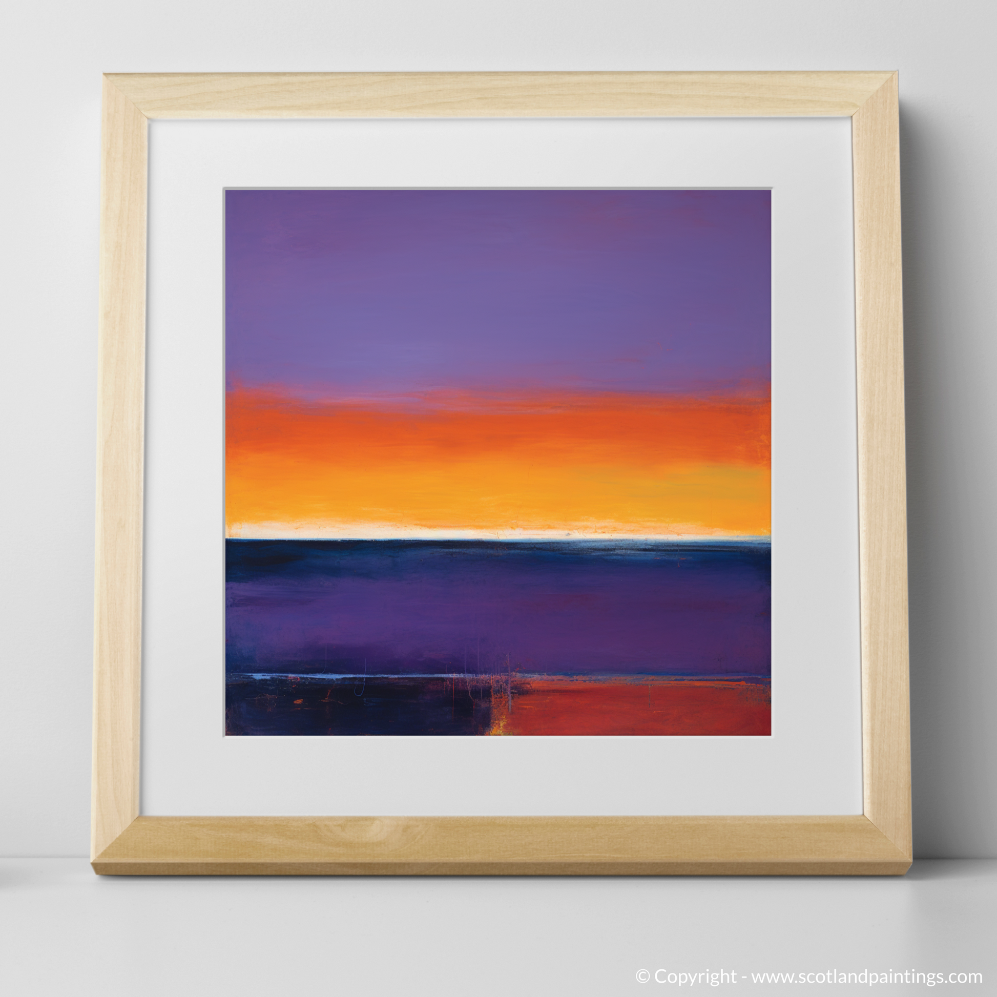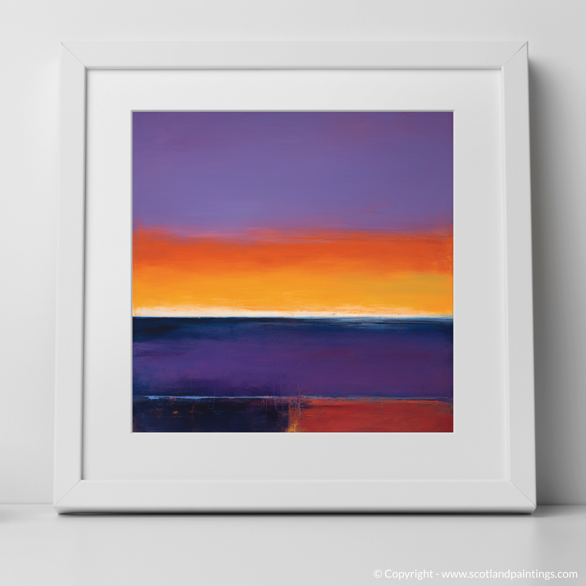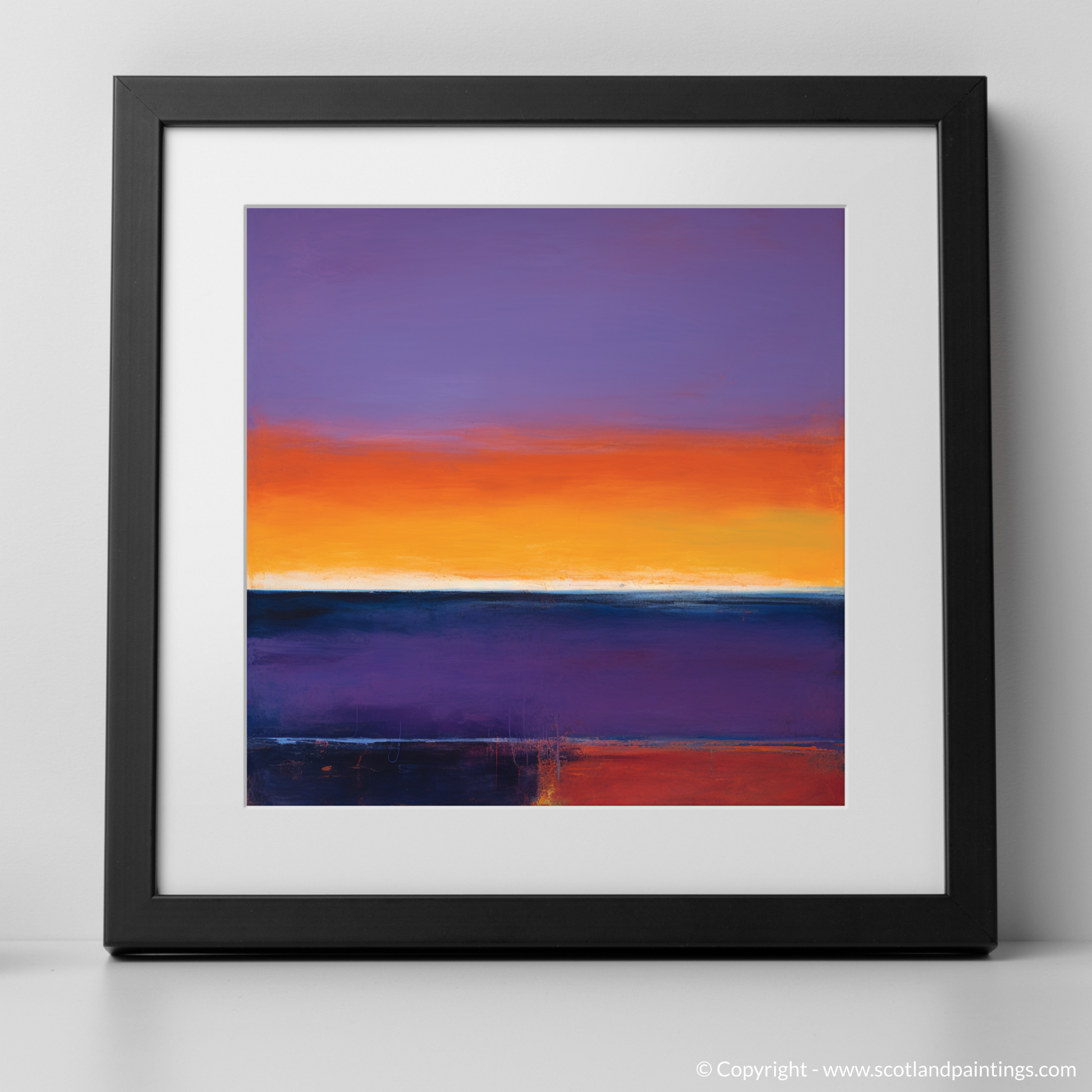 Abandoning the constraints of literal representation, the artwork embraces the essence of Balmedie's stunning sunsets through expressive colour blocking. Textural elements within the print create a palpable sense of movement, with sporadic lines and subtle intricacies that hint at the natural world's transient beauty. The horizon is rendered as a simple, thin white line, a quiet pause between the tumultuous sky above and the serene, darkened waters below.