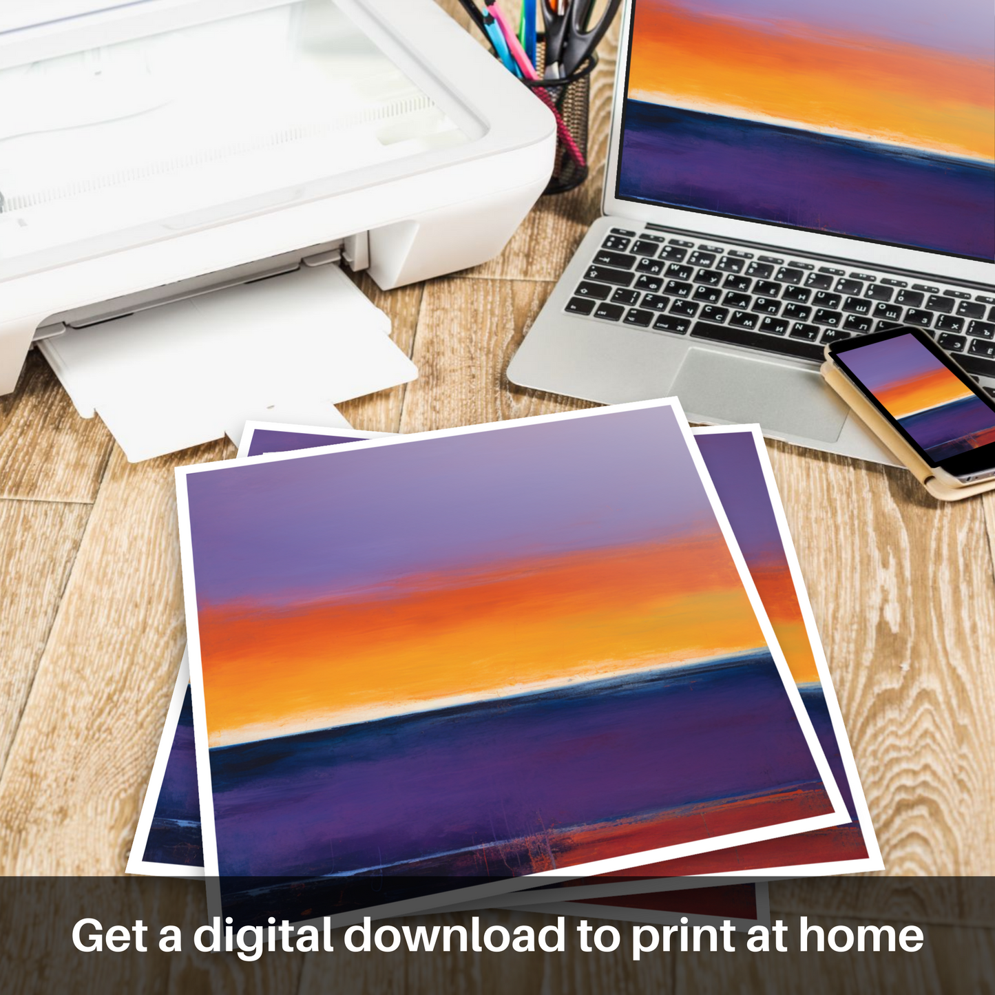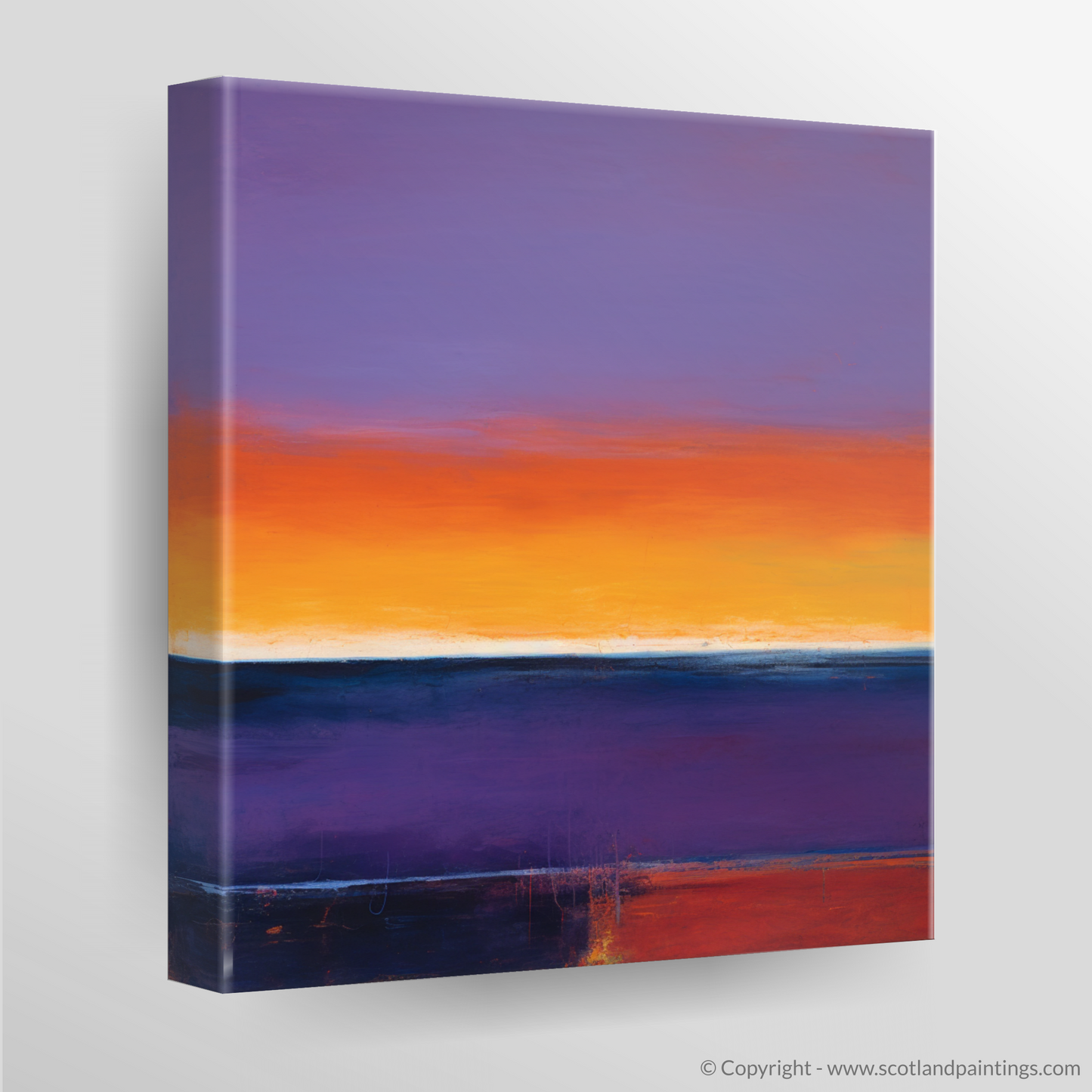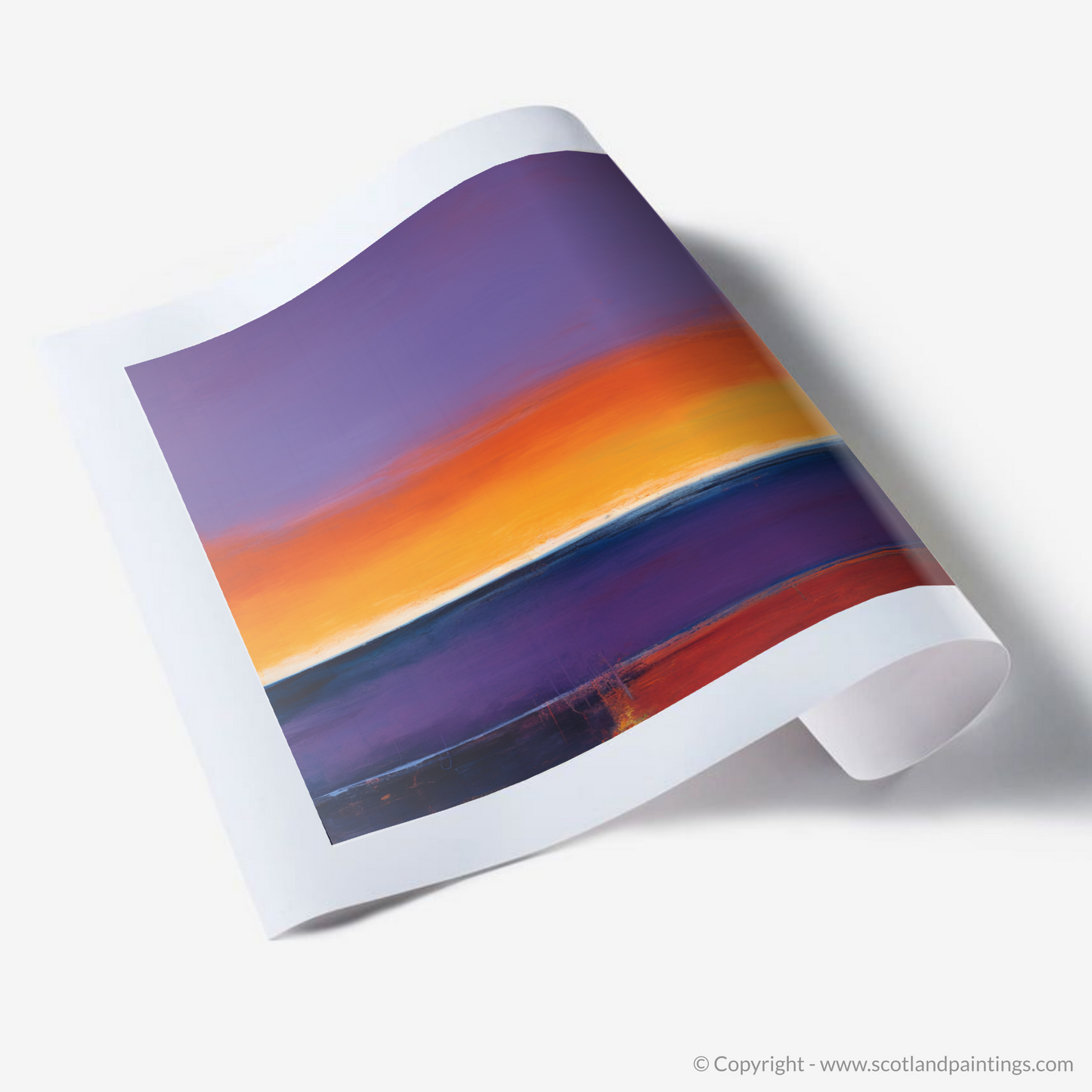 As the sun dips below the horizon of Balmedie Beach, the sky erupts into a majestic symphony of colour in this evocative abstract print. This piece artfully captures the breathtaking Scottish shoreline at sunset, translated into broad strokes and a vibrant palette that speaks to the heart of abstraction.