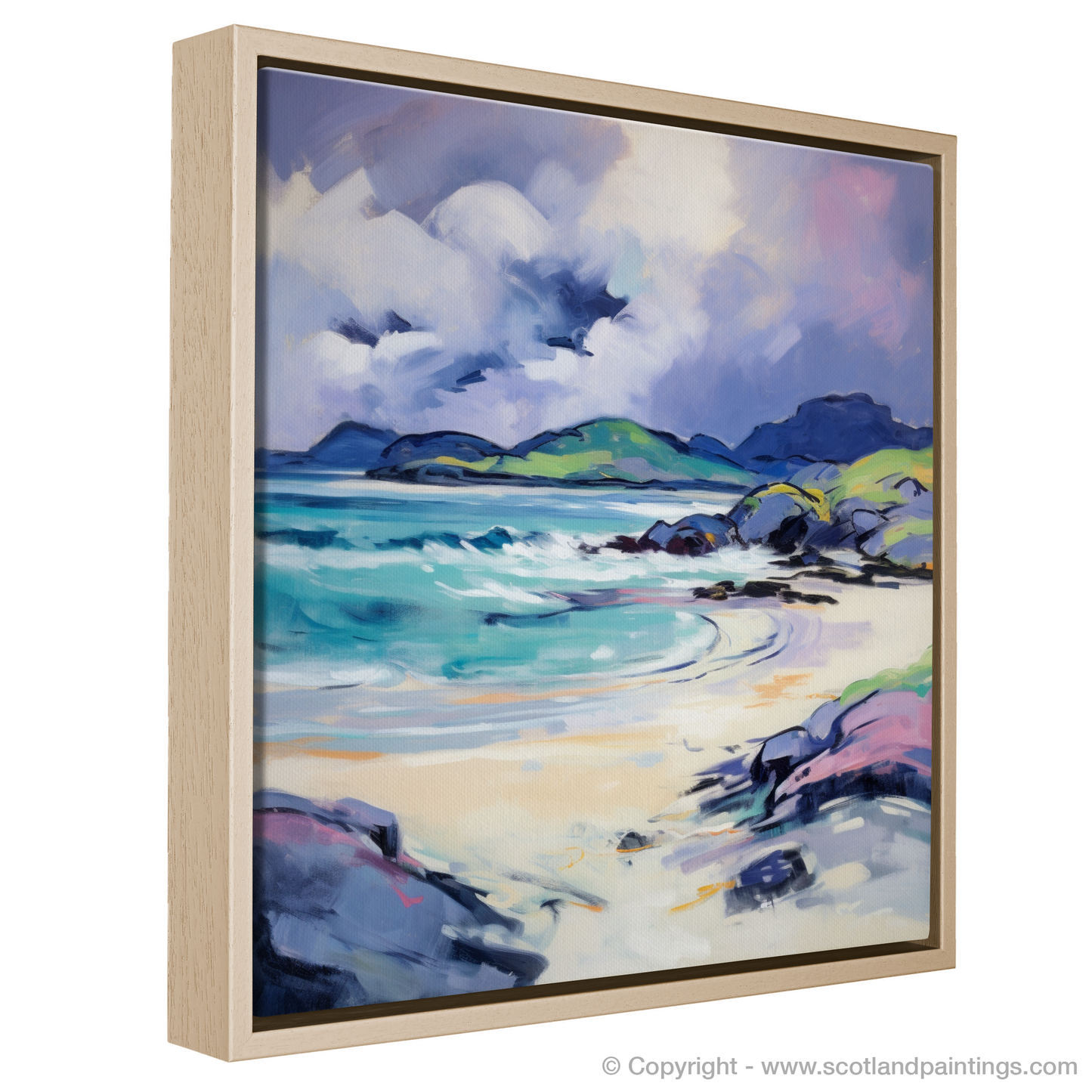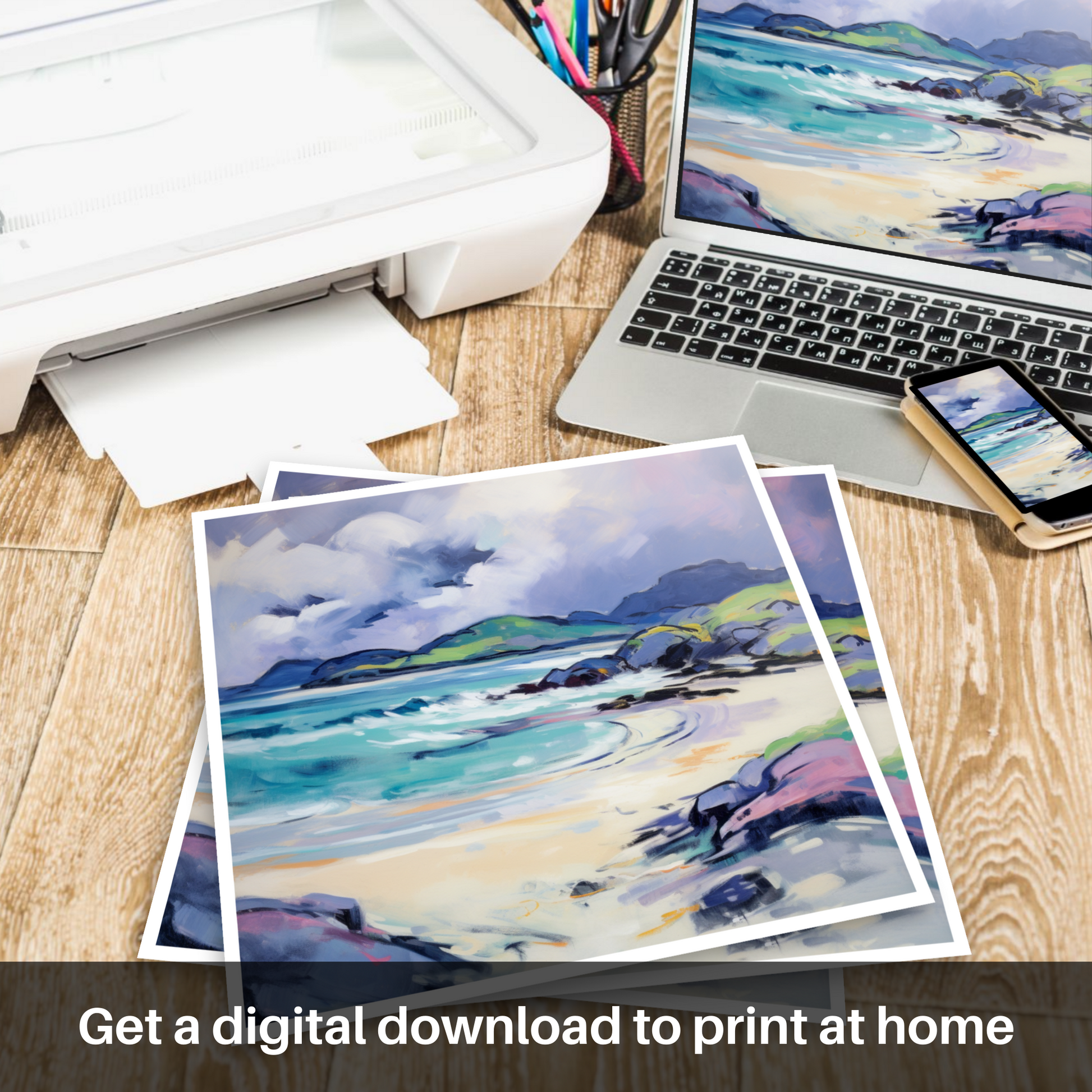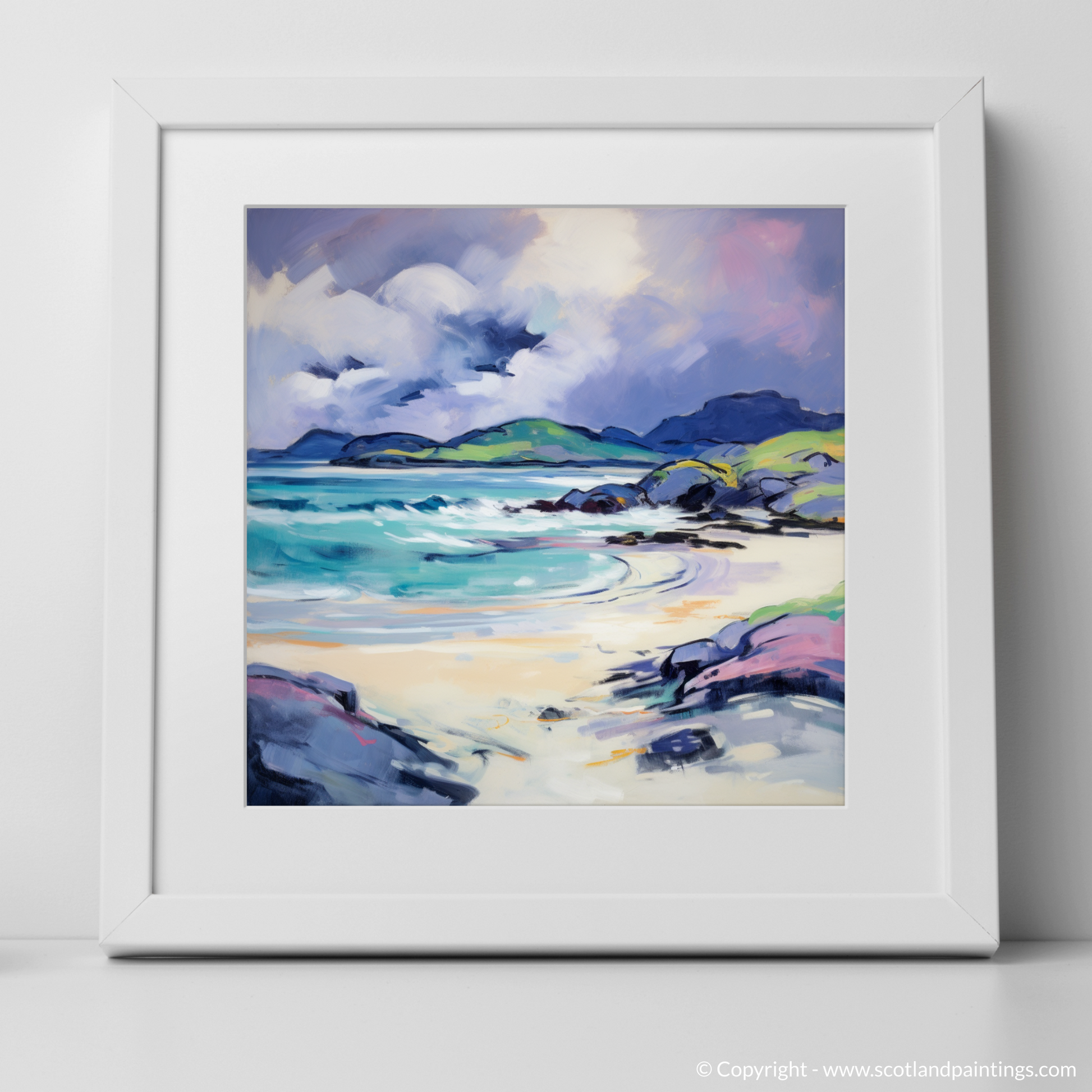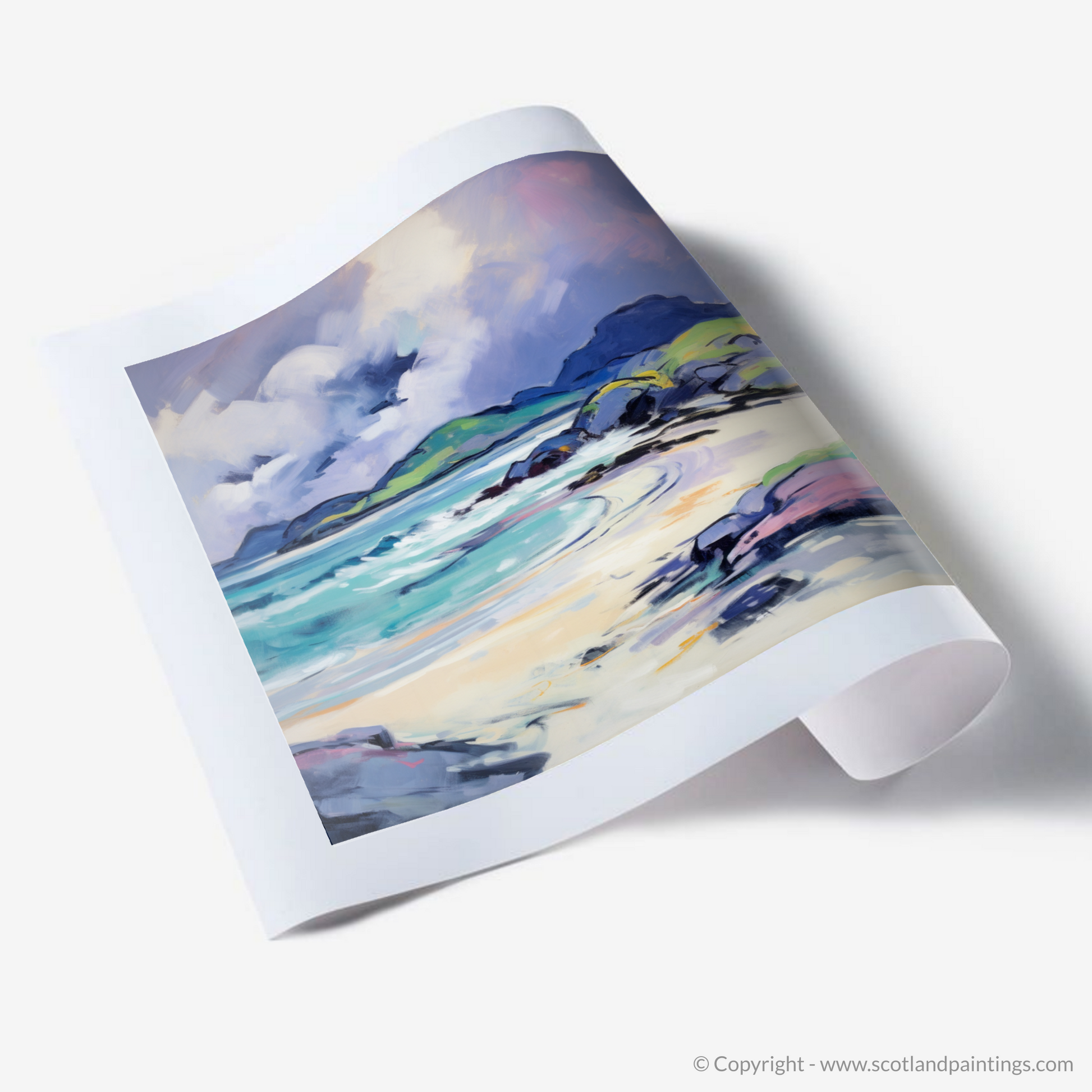 Capturing the untamed essence of Balnakeil Bay under a brooding, tempestuous sky, this vivacious print invites the onlooker into a world where nature's drama unfolds in exuberant hues and expressive brushstrokes characteristic of the Fauvist movement. The eye is immediately drawn to the swirling azure and teal waters, which dance with energetic white crests, suggesting the bay's wild waves during a storm.